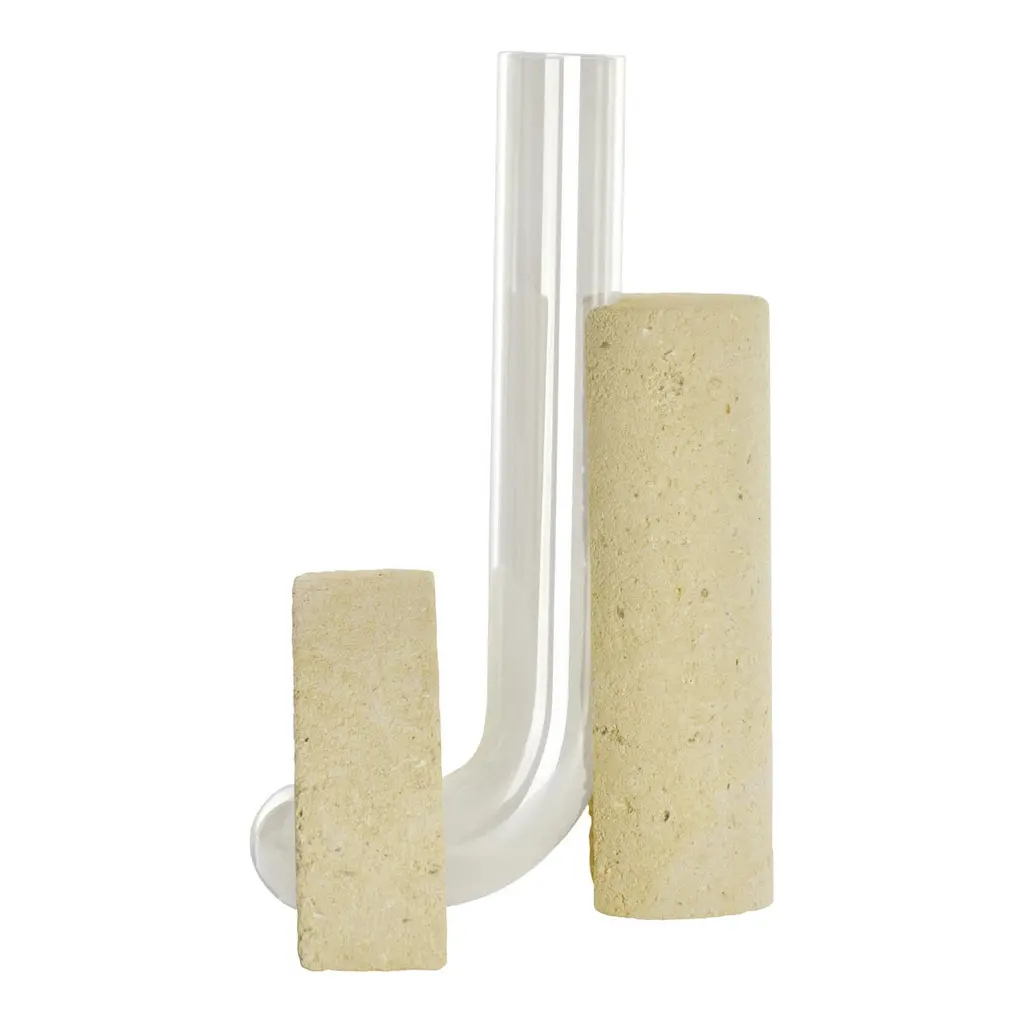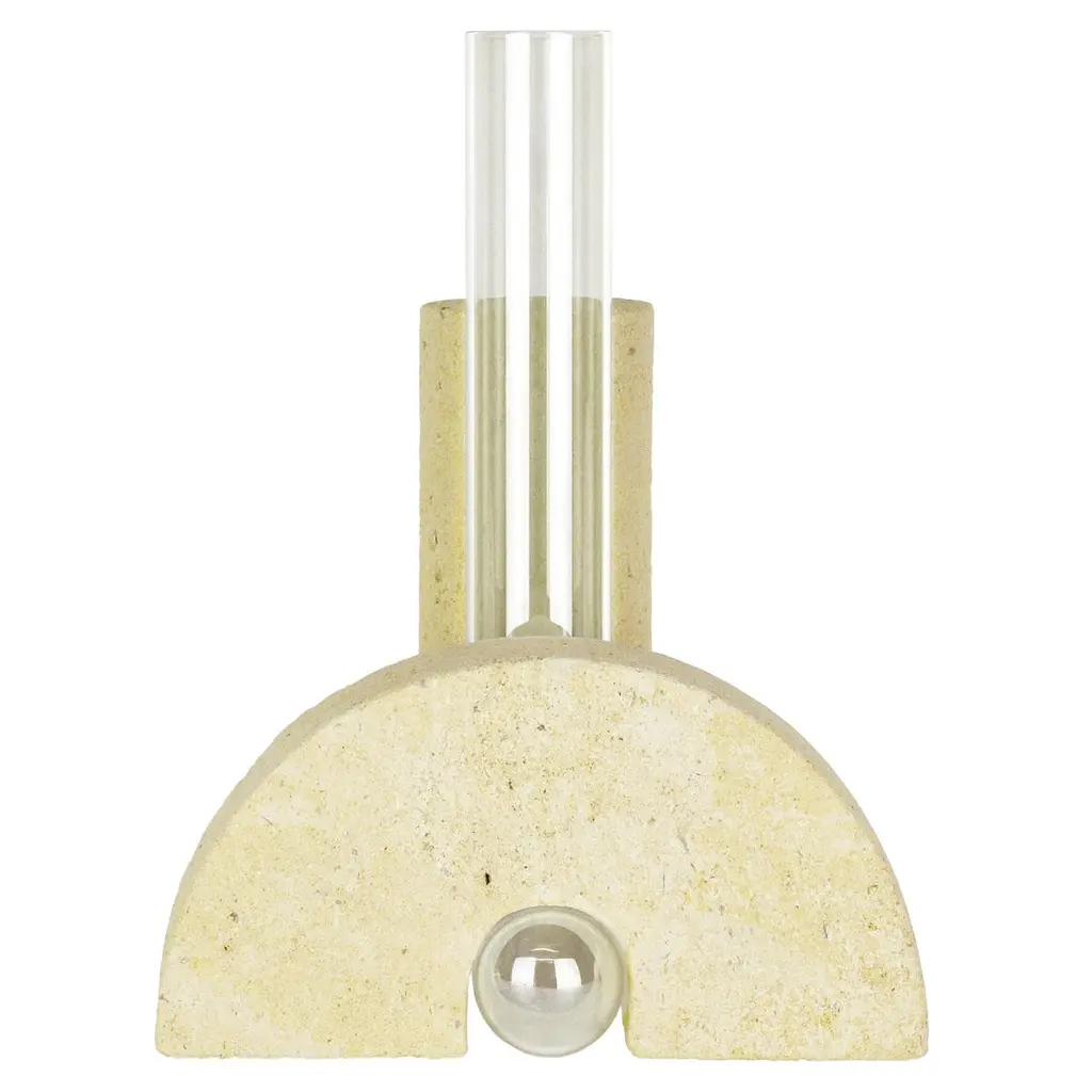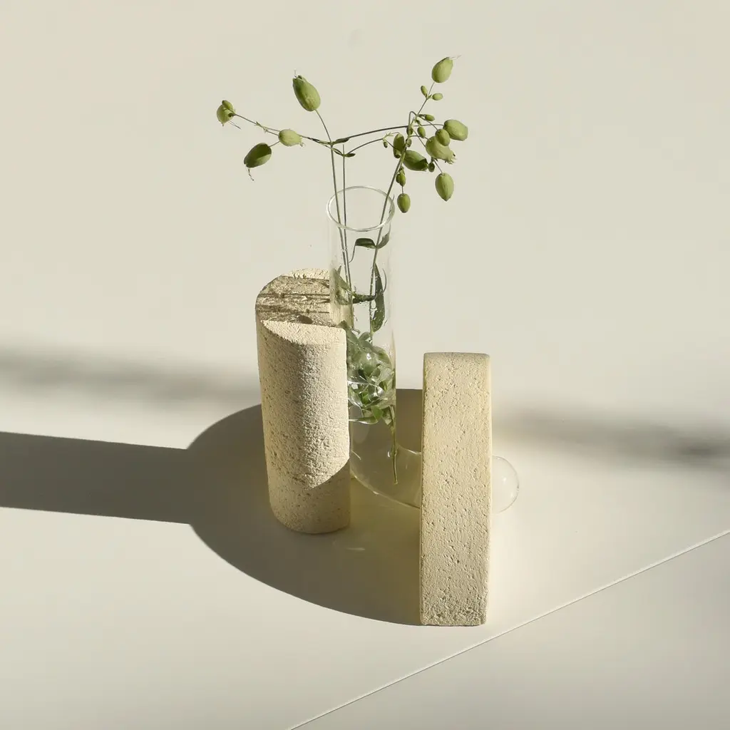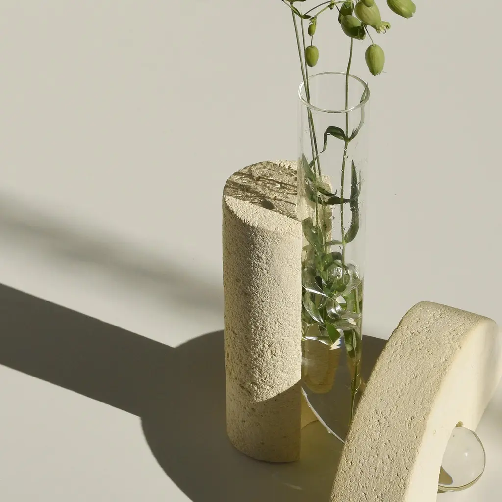 Grey-Smoked Cochlea della Metamorfosi 1 Soils Edition Vase by Coki BarbieriDimensions: W 18,5 x D 15 x H 24 cm.Materials: Handcrafted stone made with Matera stone fragments, sedimentary rocks of the Italian Apennines and pure water, clear borosilicate glass.Cochleae vases collection is inspired by the life cycle of the snails and captures their growth when the invertebrate's body (represented by the curved glass) develops upwards from the embracing shell symbolized by semicircular shells handcrafted from fragments of historical stones only found in Matera (Città dei Sassi, UNESCO World Heritage, European Capital of Culture), recovered and reprocessed following a sustainable production cycle. The surface of the handcrafted stone piece is treated with an ecological substance developed by COKI. The glass and stone components are not glued and can be separated, disassembled, and ready for new uses.A precious objects collection made in Italy with natural and vegan origin materials, conceived by architectural and product designer Coki Barbieri and created by the local craftsmen to expand a new slow living awareness and surround oneself with a few objects, capable of staying alongside us over time.The climate emergency and increased future anxiety push our work to imagine alternative ways of living, producing, and consuming. For that Coki Barbieri uses notions of geology, chemistry, and design culture to create new products (and materials) from fragments and waste from natural products (such as stone and minerals).Coki Barbieri established her eponymous studio-workshop in Rimini in 2017, bringing to life a sustainable way of conceiving the product design for home. Nature inspires her environmentally conscious creations, which are imbued with emotional energy while maintaining their aesthetic impact and practical functionality. Coki collaborates with talented Italian craftsmen to produce one-of-a-kind homeware objects capable of unlocking new synergies between concepts, materials, and use.