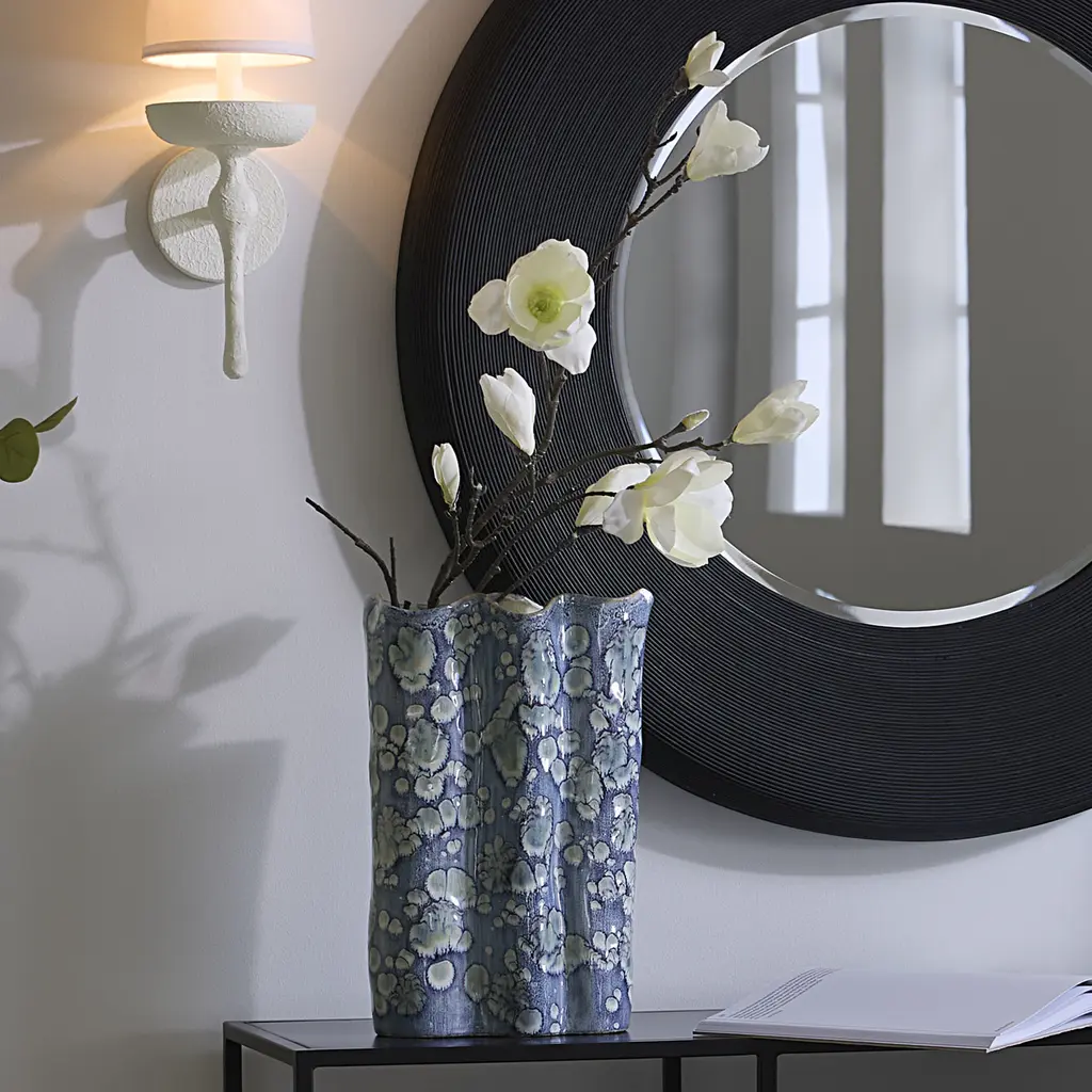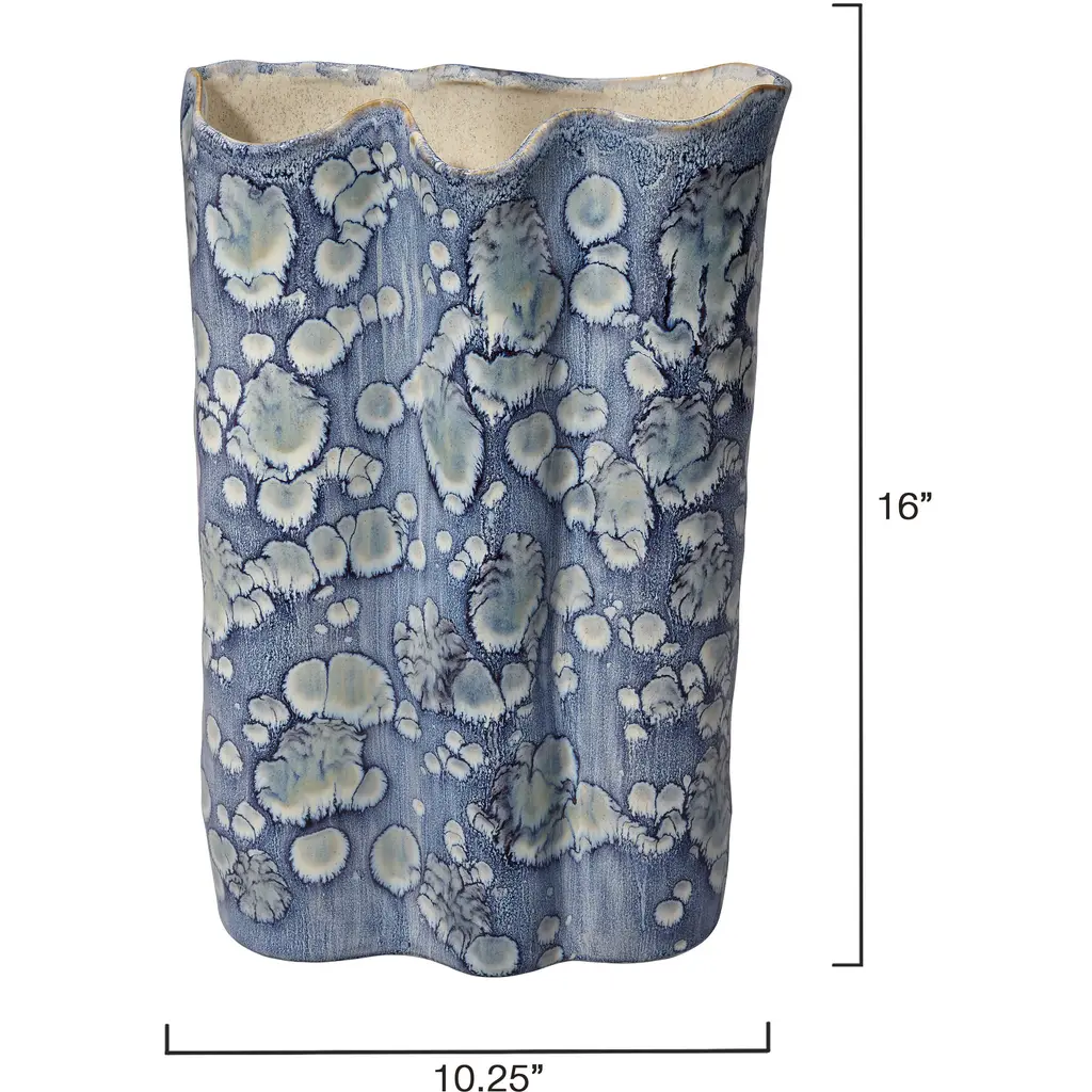 This serene ceramic vase is distinguished by its unstructured shape and a relaxed take on traditional blue and white themes. The patterns on the exterior are created using blue reactive glazes, while the interiors remain raw and unadorned. Artisan crafted and finished, each piece features unique patterns, ensuring that no two are identical. Perfect for florals, they can be filled with your favorite fresh or preserved elements