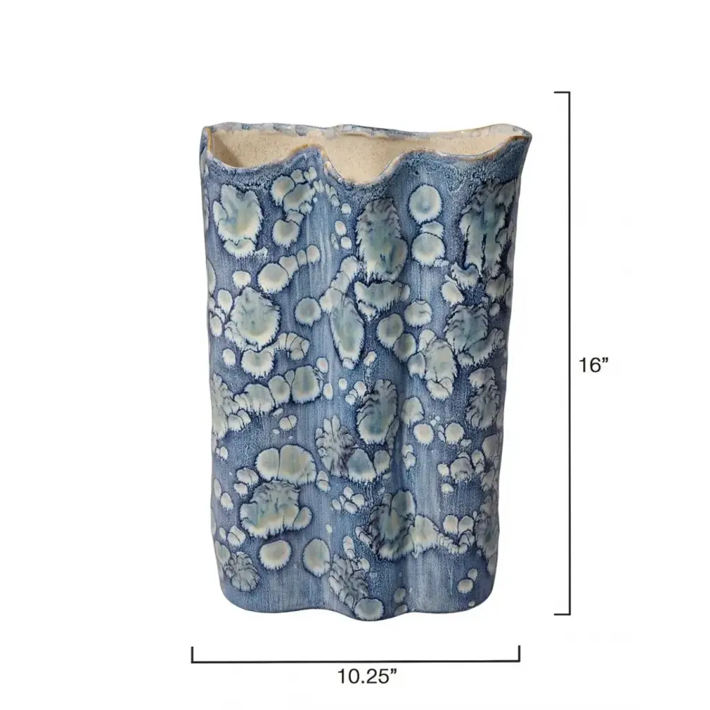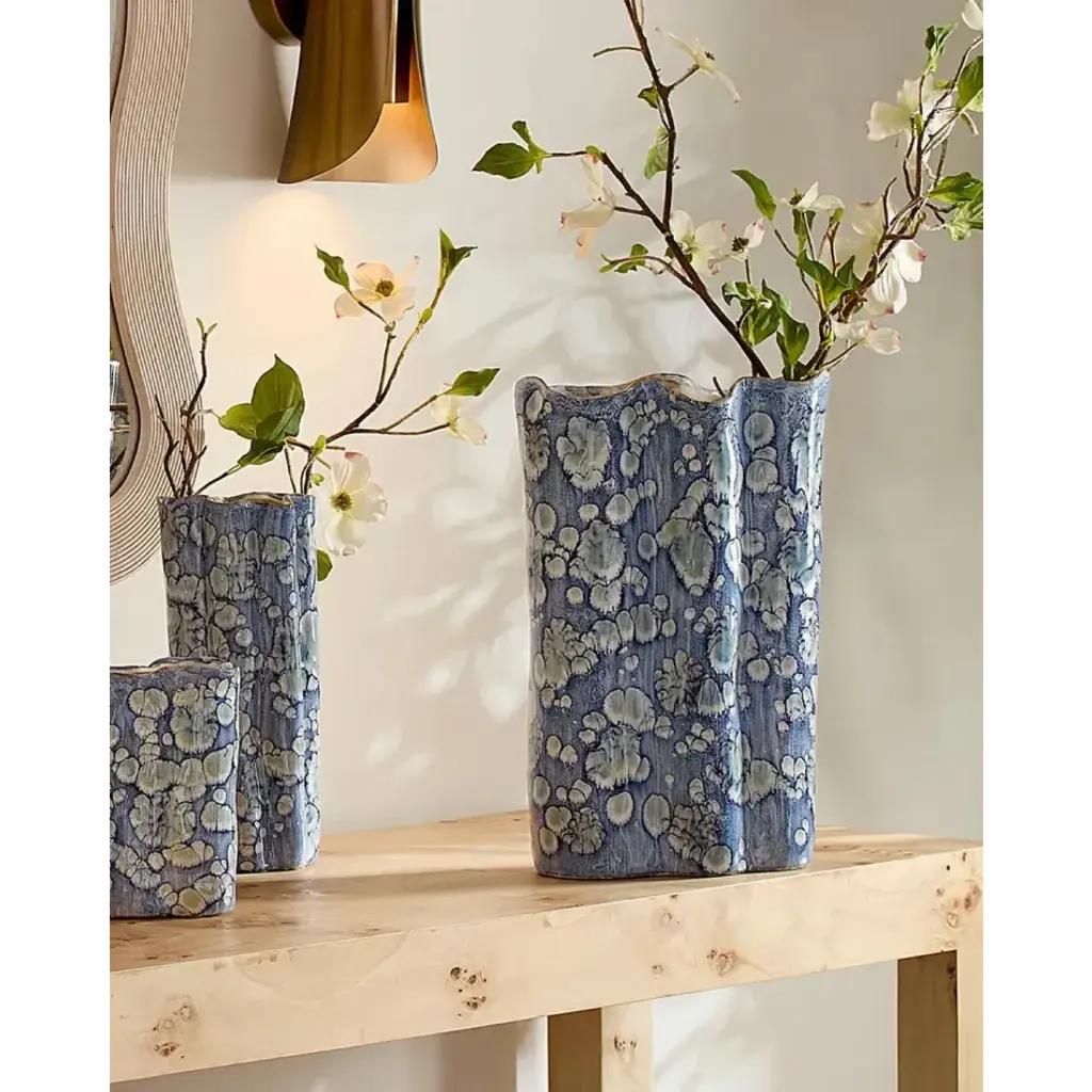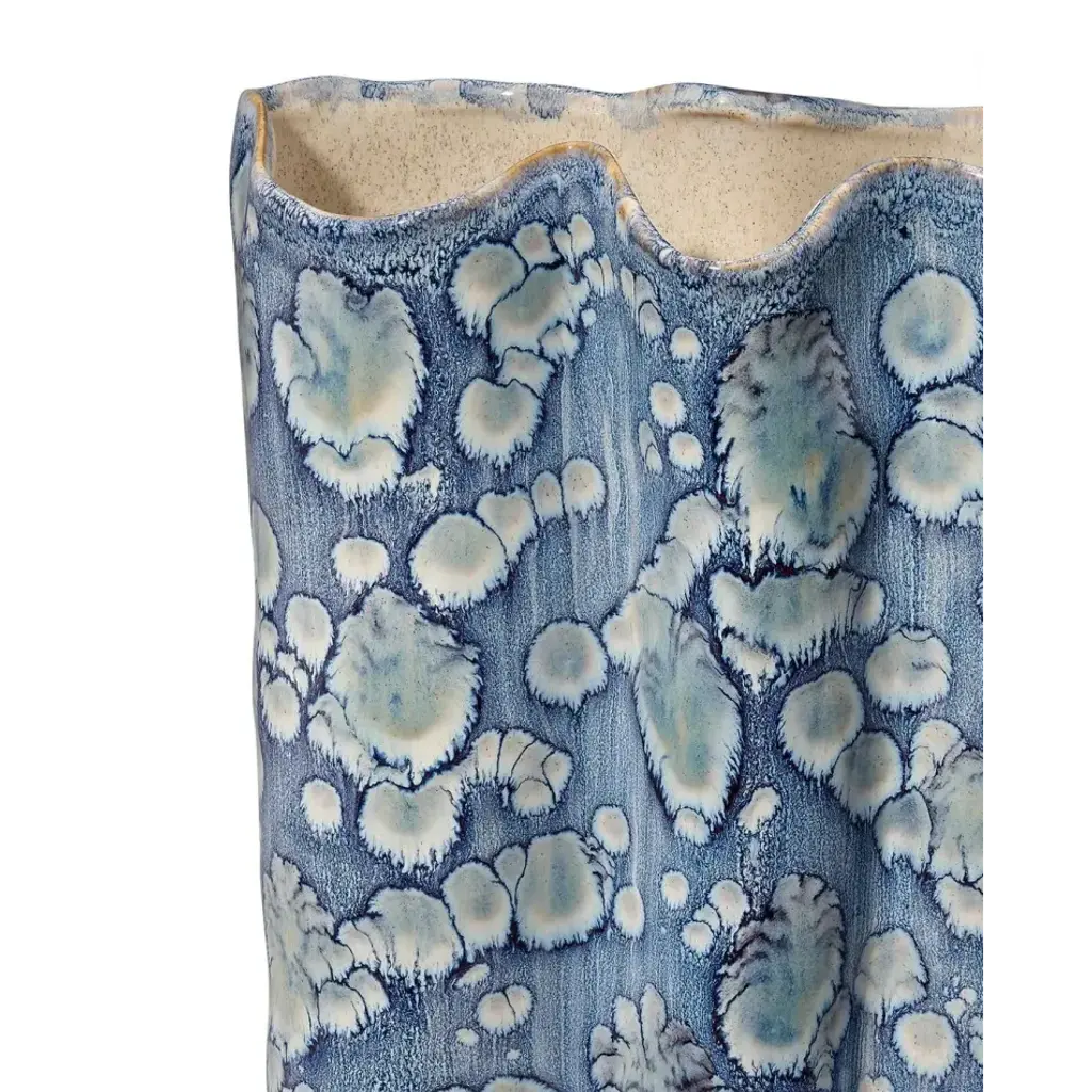 This serene ceramic vase is distinguished by its unstructured shape and a relaxed take on traditional blue and white themes. The patterns on the exterior are created using blue reactive glazes, while the interiors remain raw and unadorned. Artisan crafted and finished, each piece features unique patterns, ensuring that no two are identical. Perfect for florals, they can be filled with your favorite fresh or preserved elements!