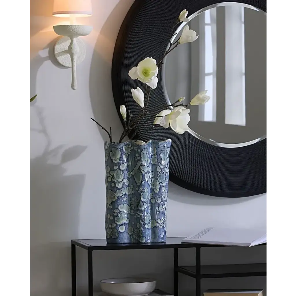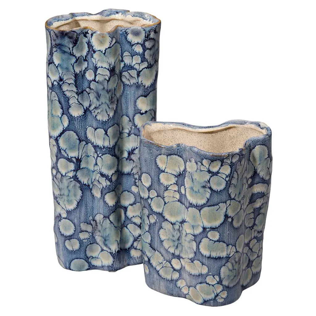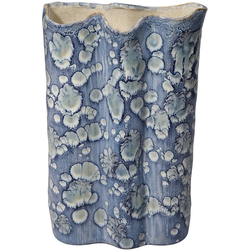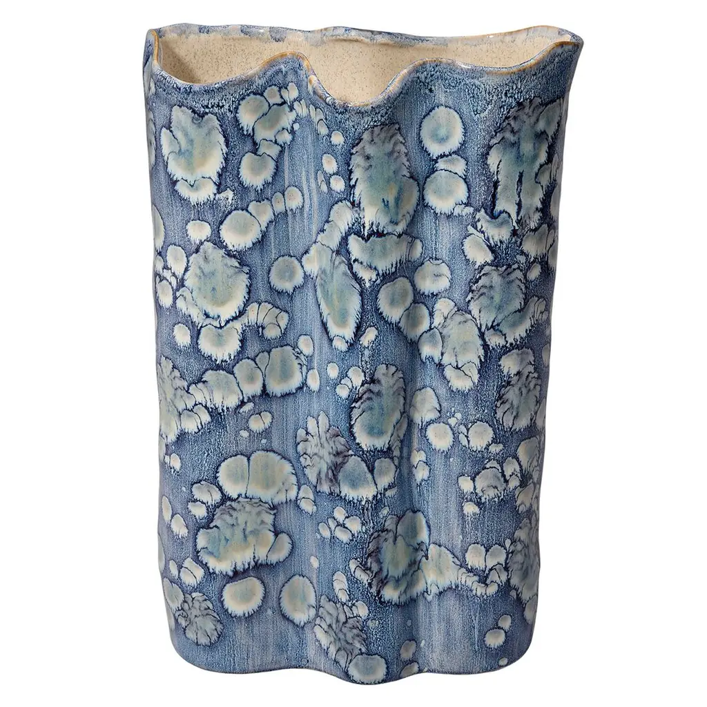 This serene ceramic vase is distinguished by its unstructured shape and a relaxed take on traditional blue and white themes. The patterns on the exterior are created using blue reactive glazes, while the interiors remain raw and unadorned. Artisan crafted and finished, each piece features unique patterns, ensuring that no two are identical. Perfect for florals, they can be filled with your favorite fresh or preserved elements!