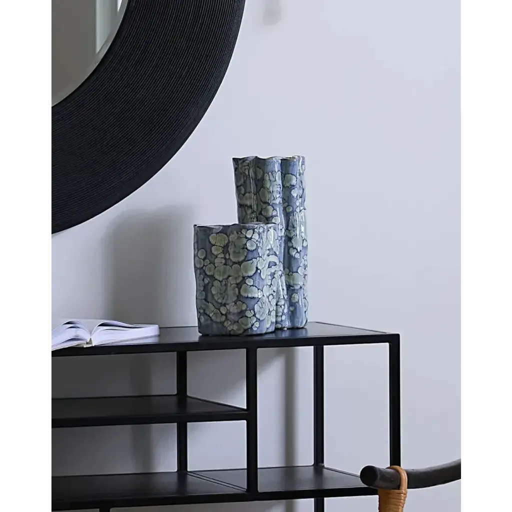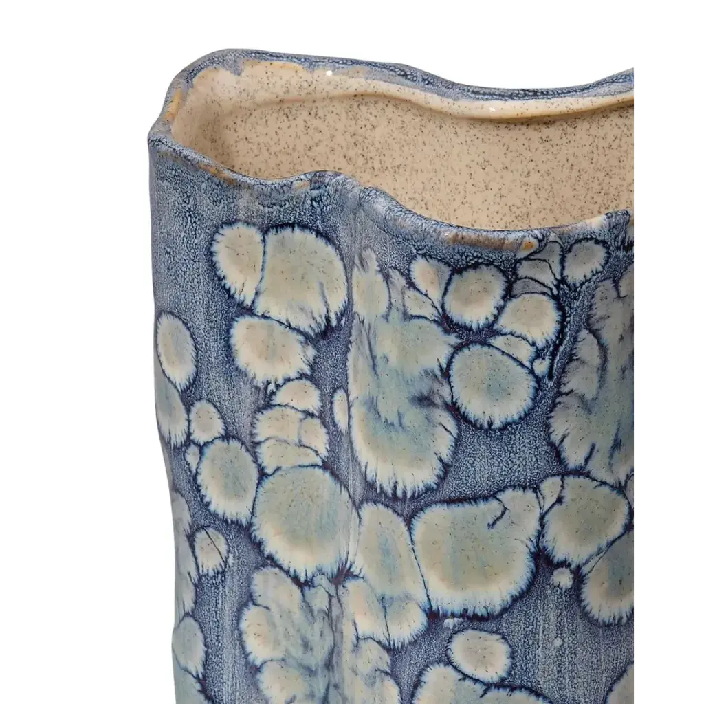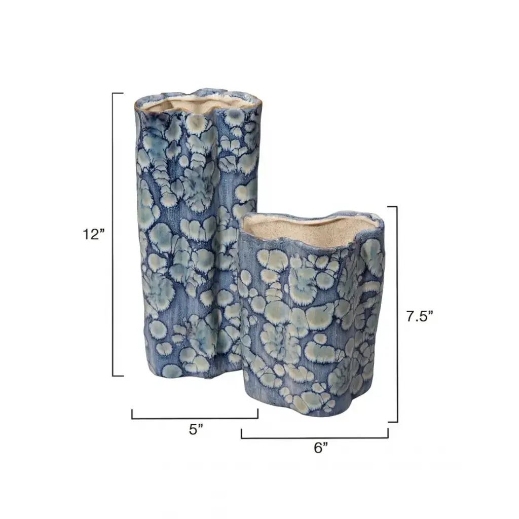 This serene set of ceramic vases is distinguished by its unstructured shapes and a relaxed take on traditional blue and white themes. The patterns on the exterior are created using blue reactive glazes, while the interiors remain raw and unadorned. Artisan crafted and finished, each piece features unique patterns, ensuring that no two are identical. Perfect for florals, they can be filled with your favorite fresh or preserved elements!