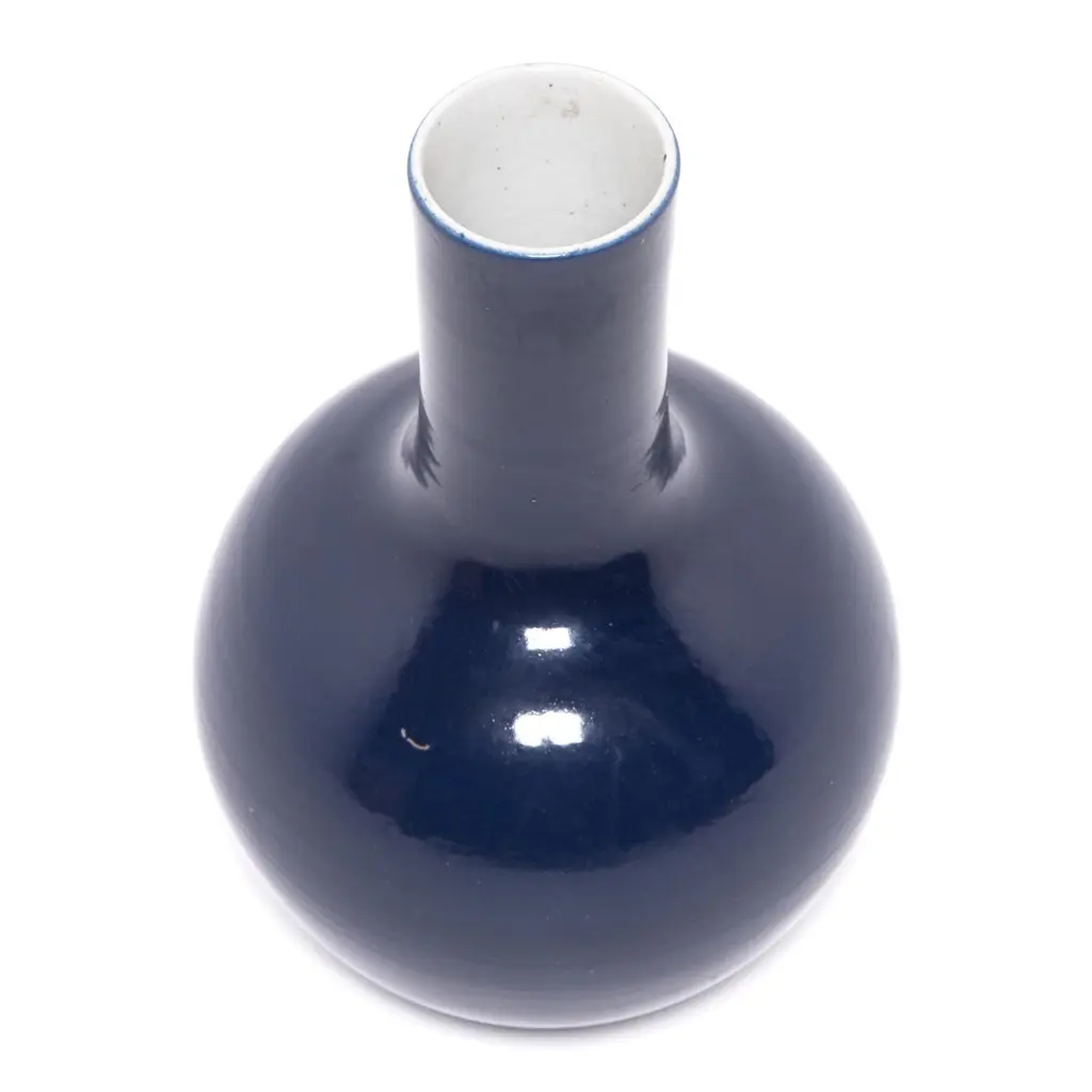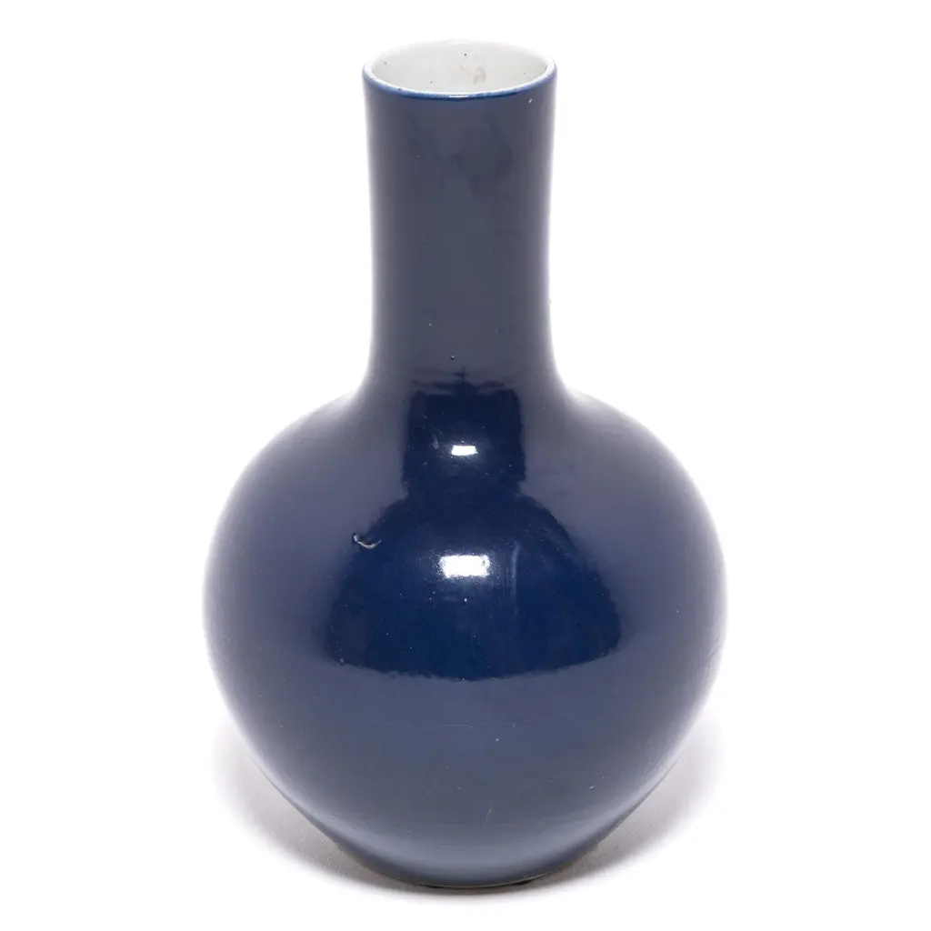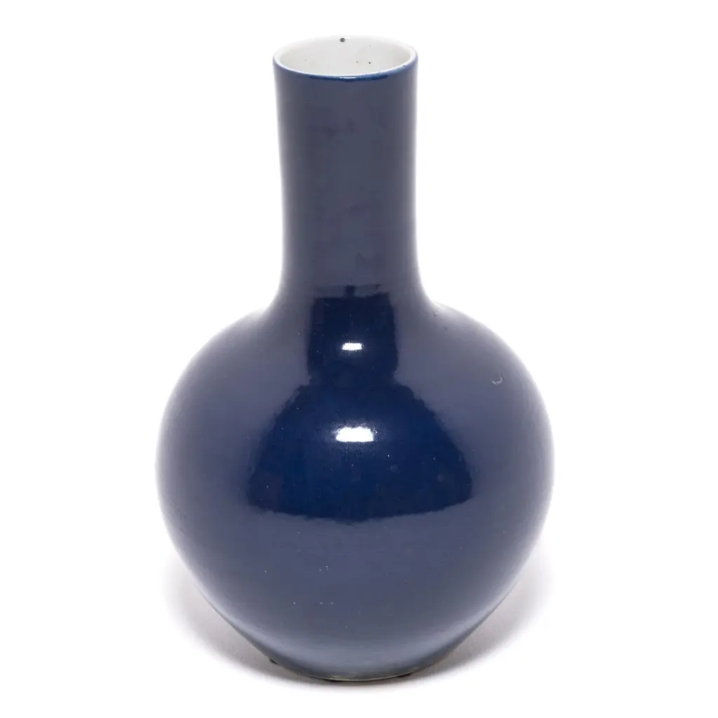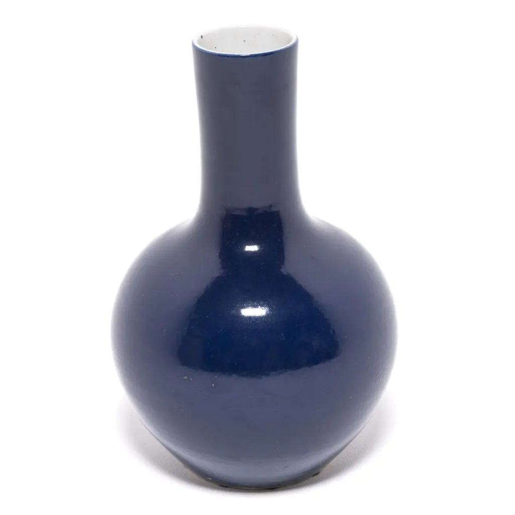 Drawing on a long Chinese tradition of monochrome ceramics, this tall gooseneck vase is coated in a deep blue glaze, reminiscent of a dark night sky. The vase features a rounded, globular body and a narrow cylindrical neck, a classic form known as 'tianqiuping' or 'celestial ball vase.' Crafted in China's Zhejiang province, contemporary ceramists reinterpreted this traditional shape with clean lines and an understated sculptural presence.Additional Dimensions:Diameter of Opening: 5"Neck: 9"H
