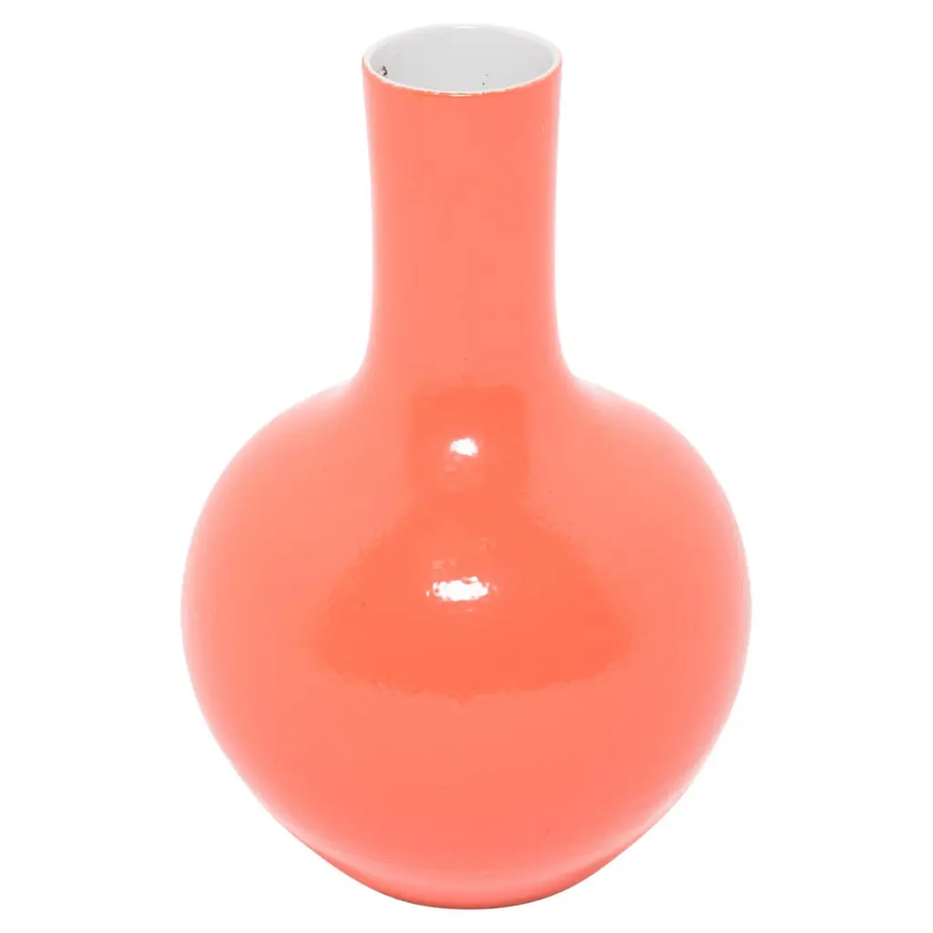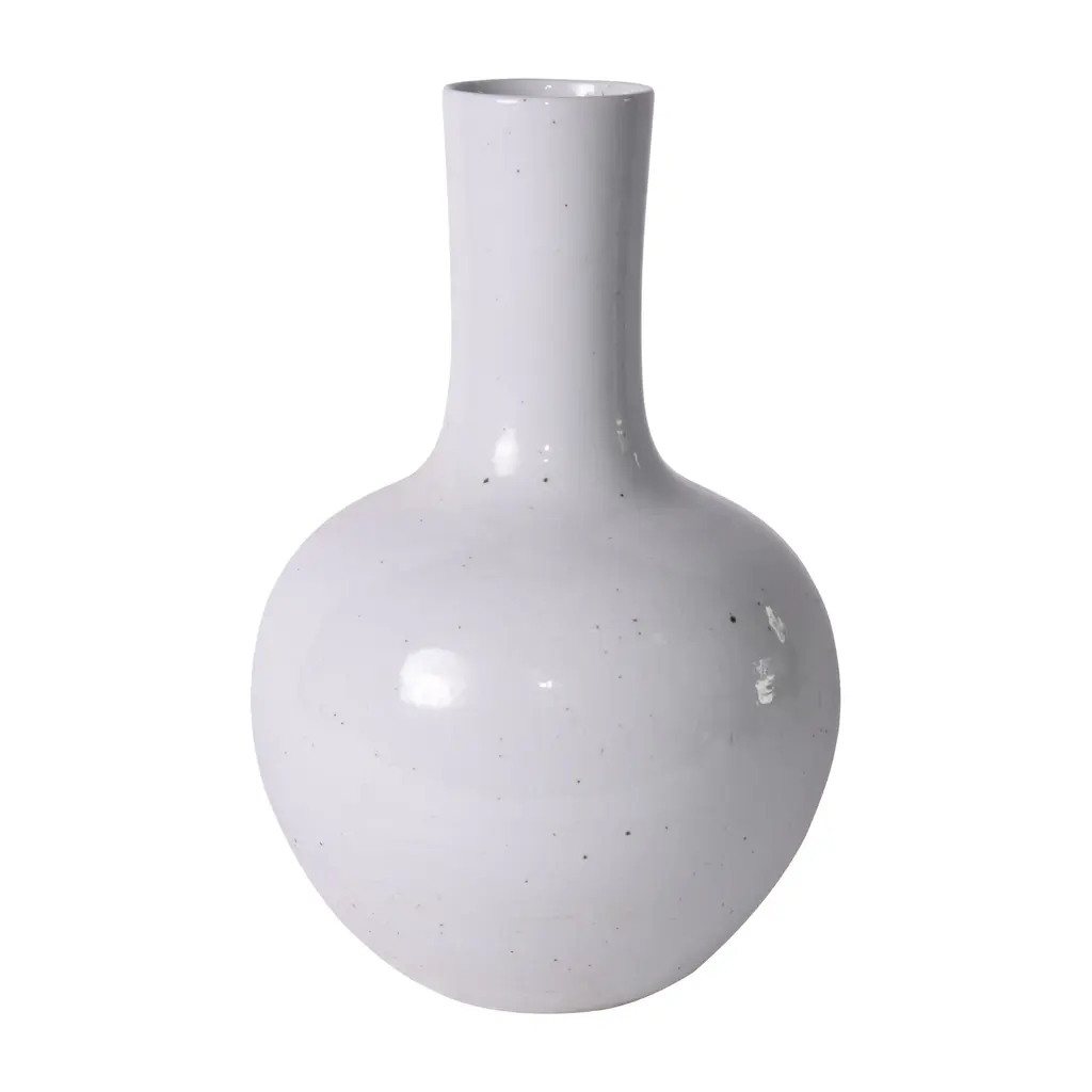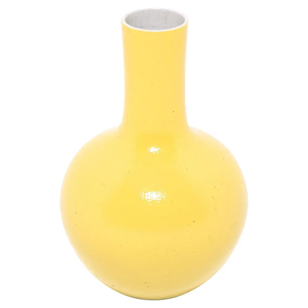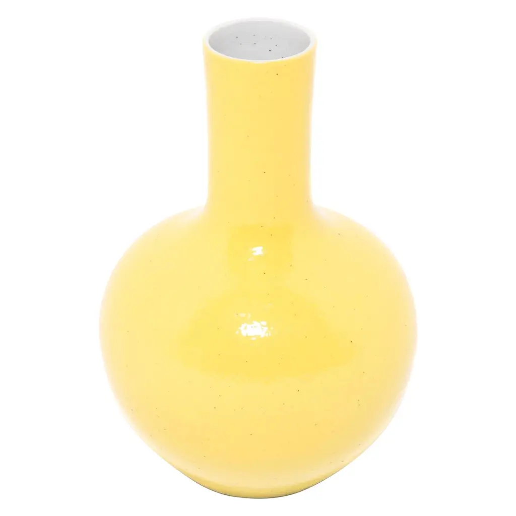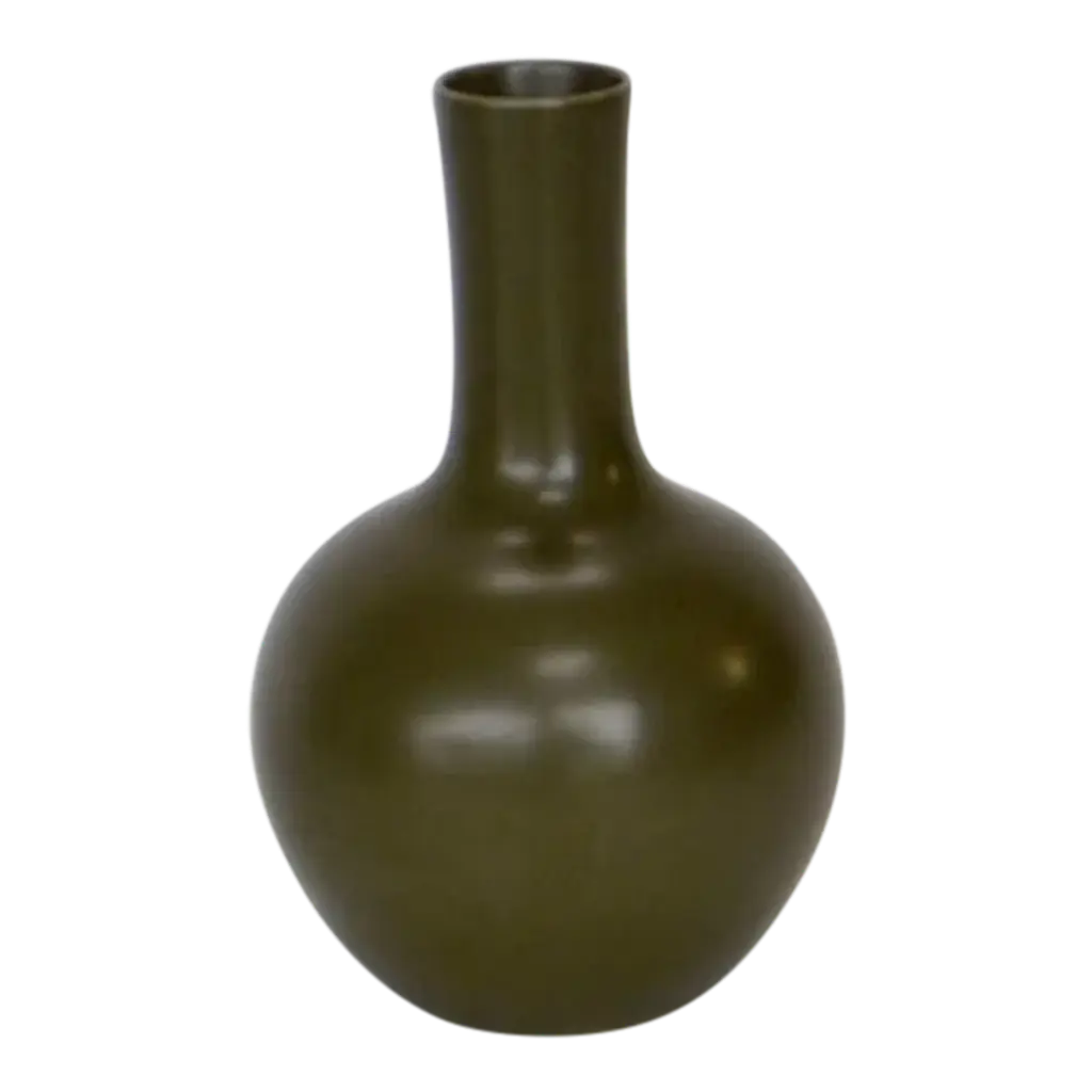 Drawing on a long Chinese tradition of monochrome ceramics, this tall gooseneck vase is coated in a deep blue glaze, reminiscent of a dark night sky. The vase features a rounded, globular body and a narrow cylindrical neck, a classic form known as 'tianqiuping' or 'celestial ball vase.' Crafted in China's Zhejiang province, contemporary ceramists reinterpreted this traditional shape with clean lines and an understated sculptural presence.Additional Dimensions:Diameter of Opening: 5"Neck: 9"H