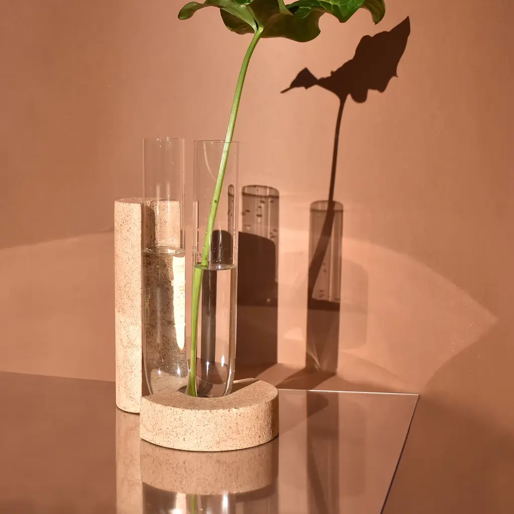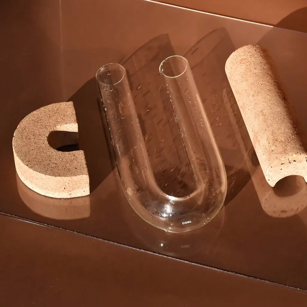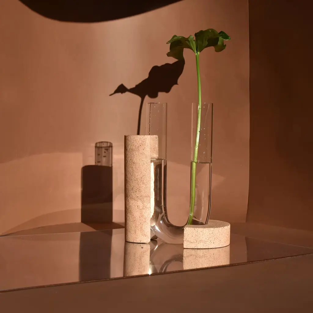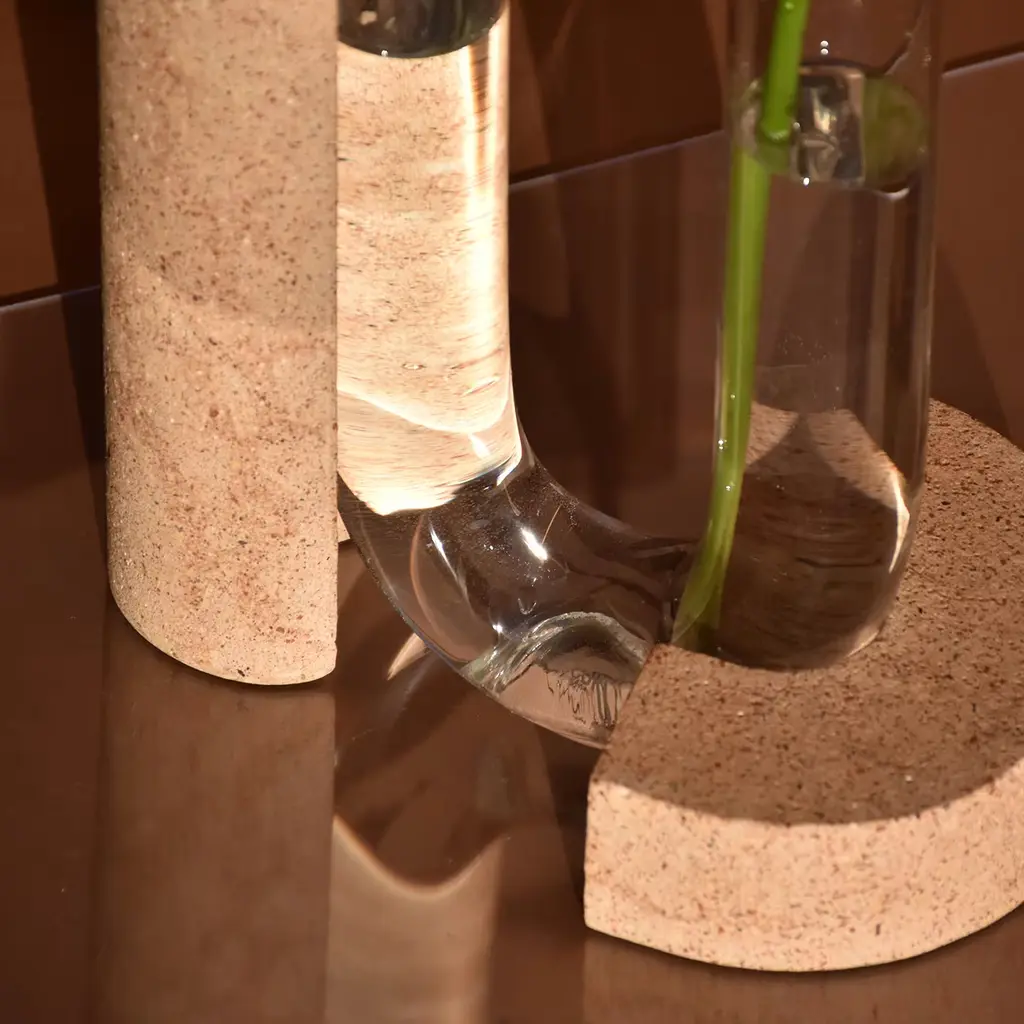 Three detached geometric-style elements crafted of borosilicate glass and soft-brown stone from Tuscany and Veneto compose this artful vase part of a series that, with its materials, reinvents snails' silhouette in a sculptural organic version. Treated with ancient natural materials and assembled without glue, the vase boasts a striking attention to sustainability. The stone's color becomes brighter and clearer within 2-3 months due to the natural absorption process of the surface treatment.