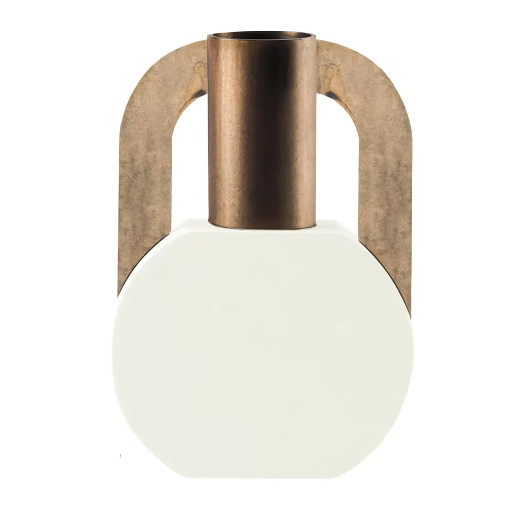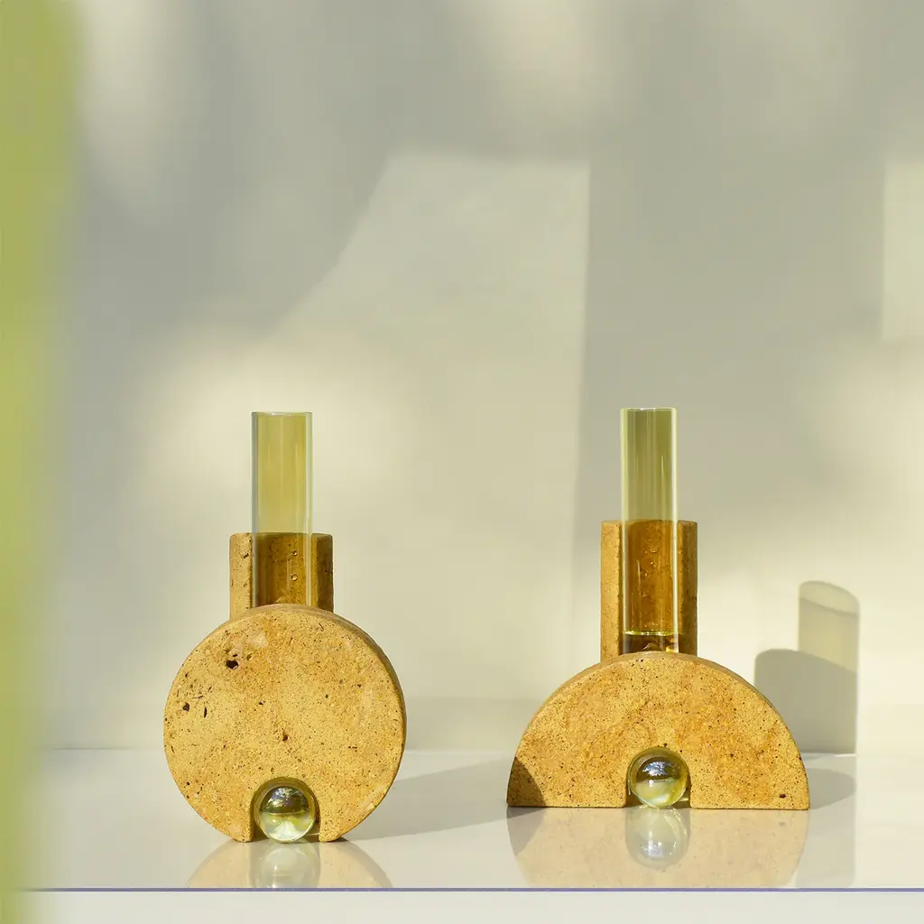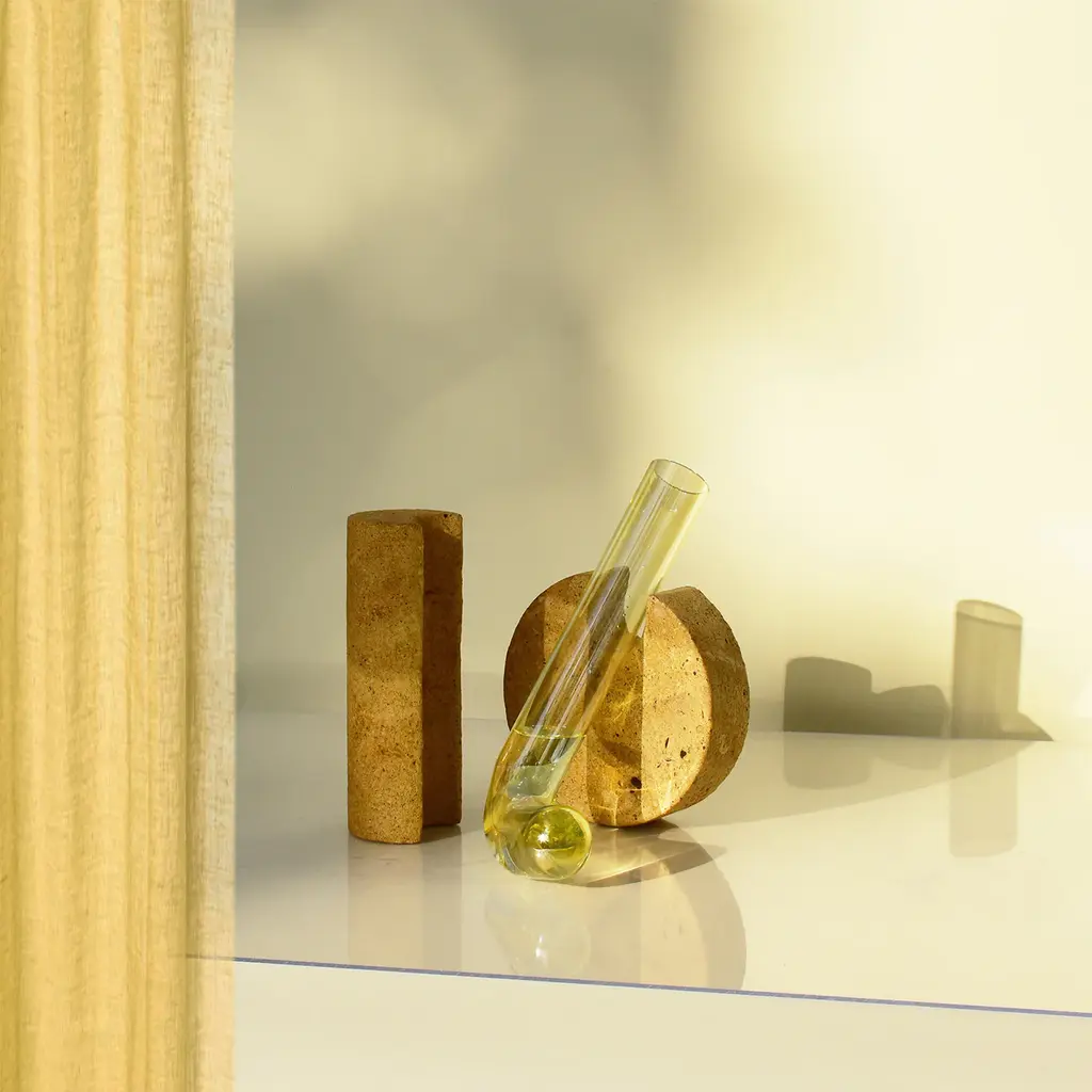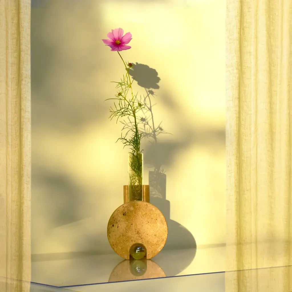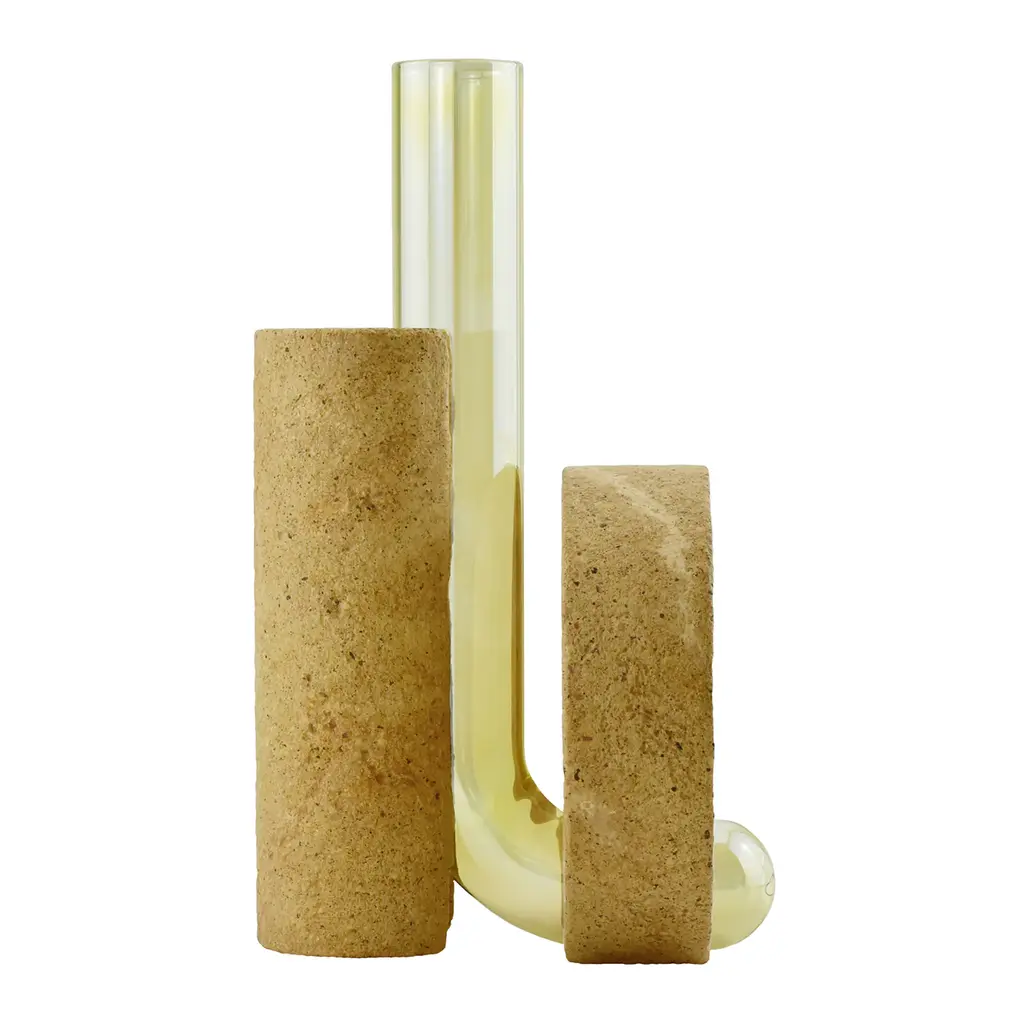 Handcrafted vase with borosilicate glass and sustainably sourced Tuscan and Venetian stones, inspired by Cochleae snails. Each piece features unjoined materials, creating a unique design with an irregular surface. The stone never loses its color but absorbs the transparent surface treatment within 3-4 months, brightening naturally over time. Handmade from natural Italian rocks without glue or cement, dried naturally for sustainability. Treated ecologically by COKI, the vase allows separate glass and stone components for versatile reuse.