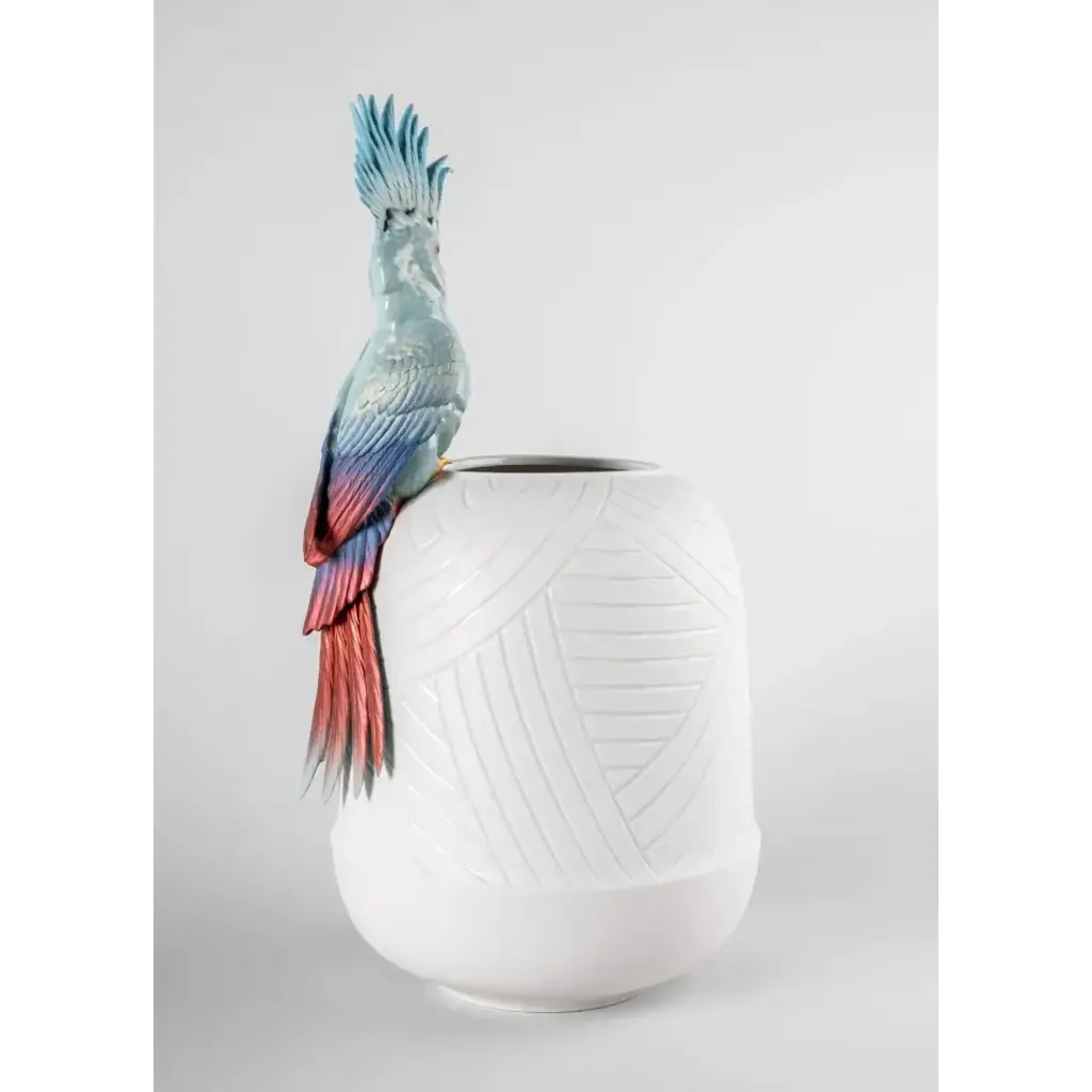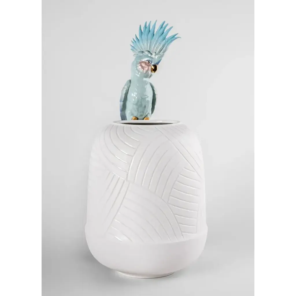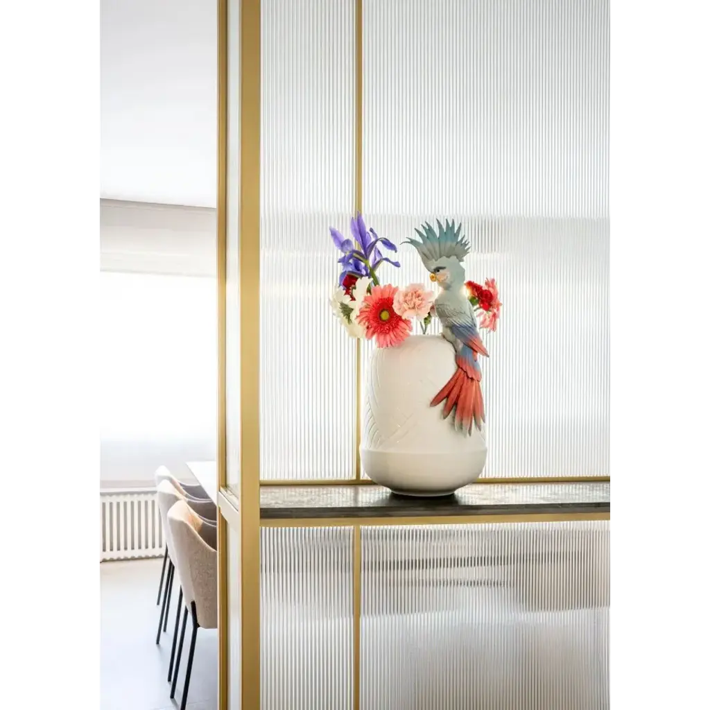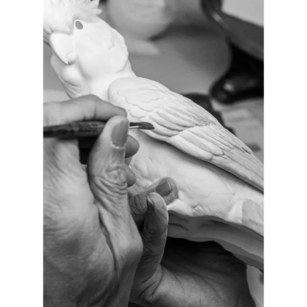 Cockatoo Vase is yet another example of the grandeur of nature as a source of inspiration for art. The central feature of this vase is a cockatoo, a beautiful bird originally from Australia which is rightly famous for its colorful crest. In this porcelain interpretation the cockatoo is decorated in a range of mainly bluish and reddish colors applied in degraded tones. These colors are complemented with the iridescent crystal of the head and body and the touches of golden luster, in both matte and glazed, on the legs and beak. All the decoration is applied in fine brushstrokes to achieve a nuanced chromatic effect. Contrasting with the realist and colorful treatment, the cockatoo is perched on the edge of a refined white vase etched with a geometric pattern. This combination of opposites results in a vase perfect for filling with flowers or as a decorative element in its own right. If you are a lover of nature or if you adore animals, Cockatoo Vase is the perfect decorative accessory for any corner of your home. Whatever your preferred interior style, from the most classic to the most contemporary, the fun light-hearted design of this vase will stand out in any room. An iconic Spanish brand, Lladro is a world leader in the creation of porcelain art. Started by brothers Juan, Jose and Vicente Lladro in 1953, the ceramic figurines were initially inspired by the works of great European manufacturers like Meissen and Sevres. Over time, a unique style was forged, consisting of elongated lines, a revolutionary single-firing method, and soft pastel tones.