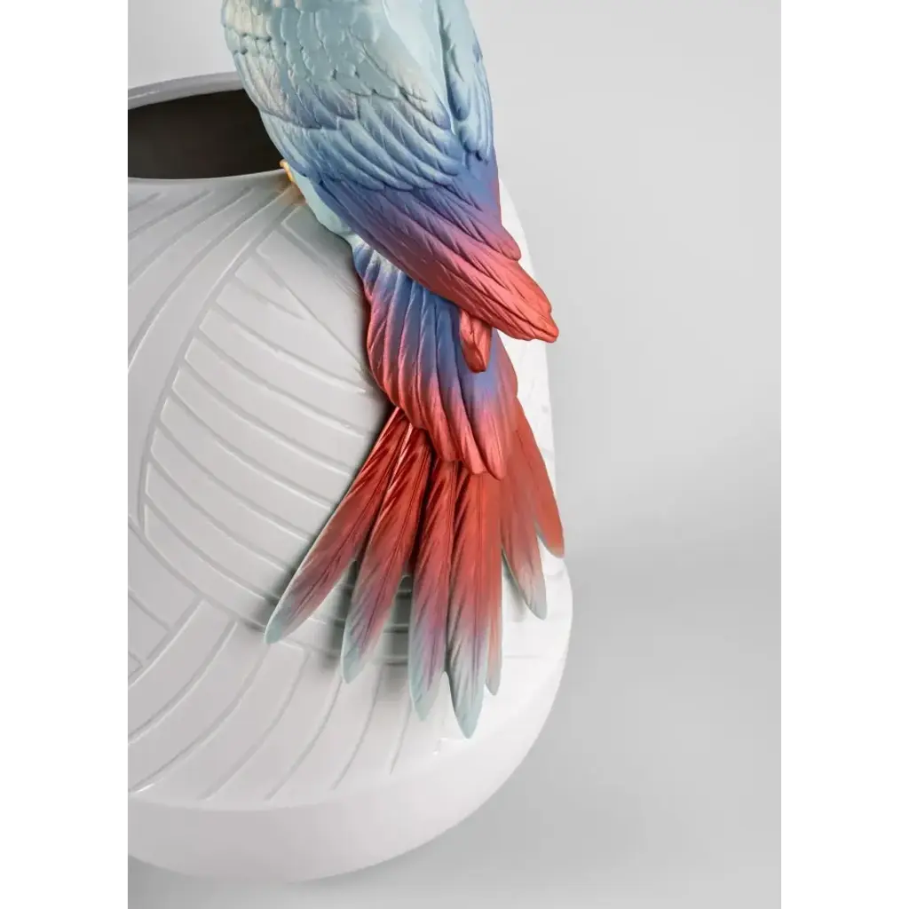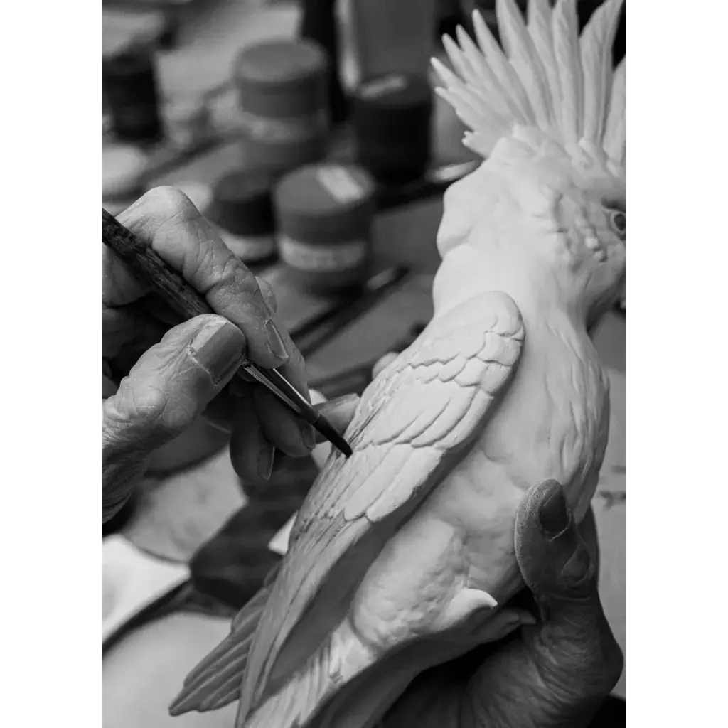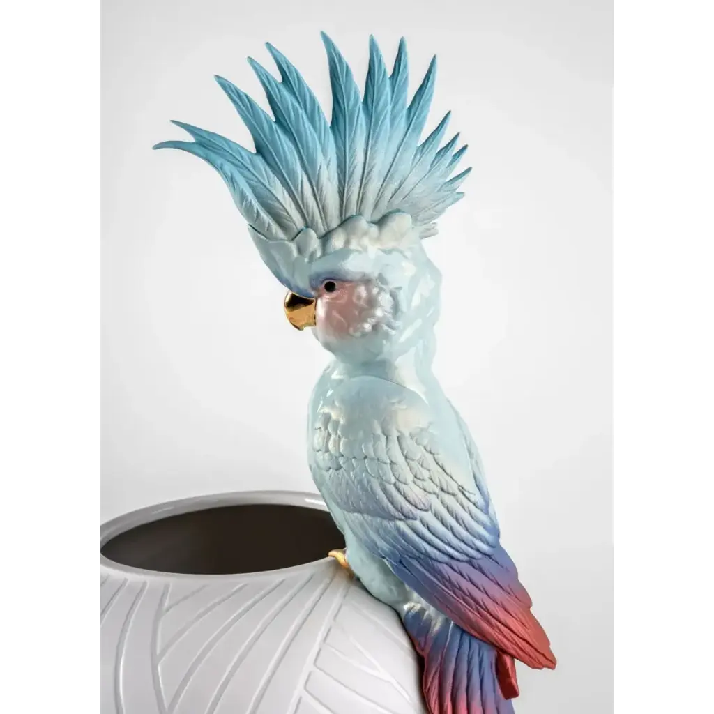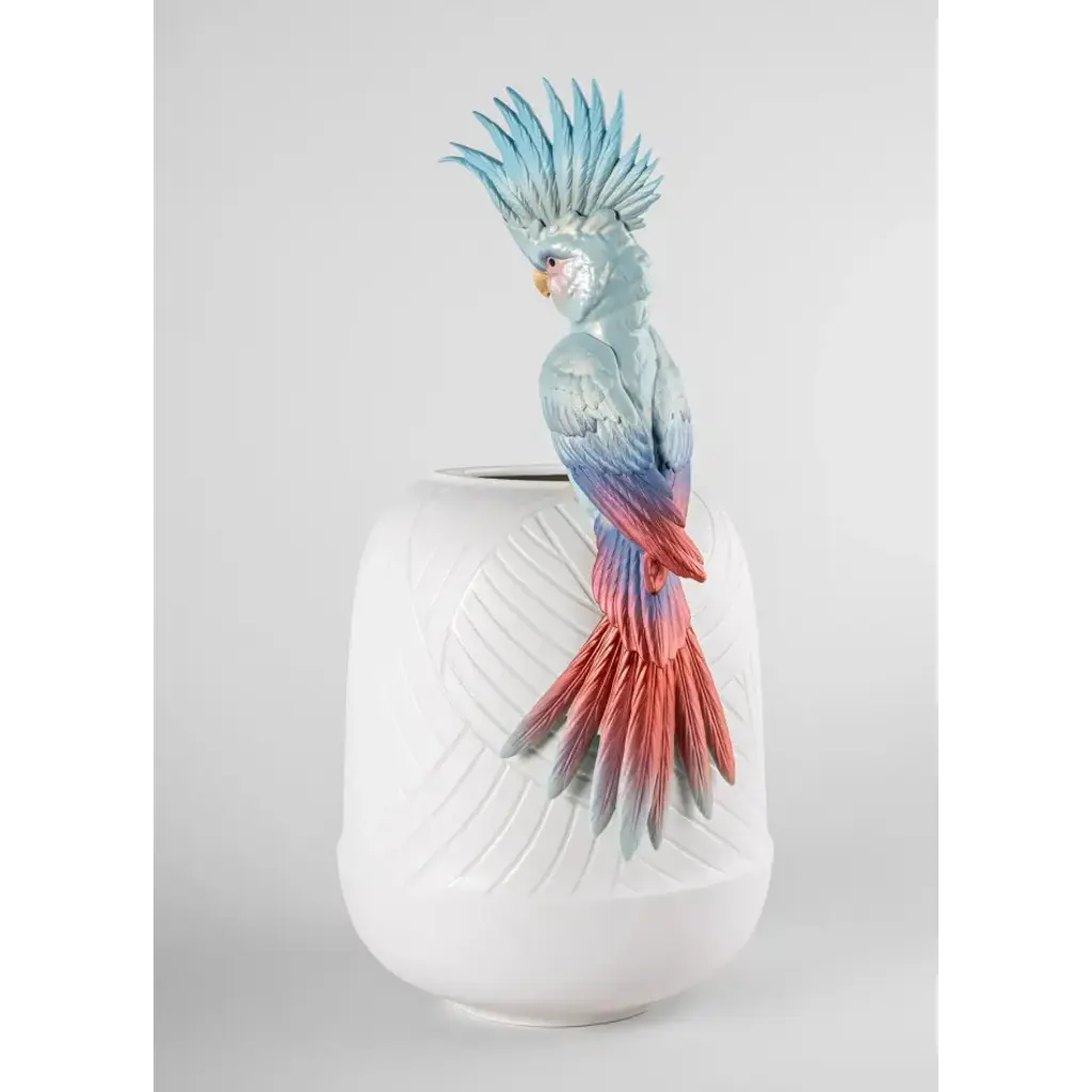 Cockatoo Vase is yet another example of the grandeur of nature as a source of inspiration for art. The central feature of this vase is a cockatoo, a beautiful bird originally from Australia which is rightly famous for its colorful crest. In this porcelain interpretation the cockatoo is decorated in a range of mainly bluish and reddish colors applied in degraded tones. These colors are complemented with the iridescent crystal of the head and body and the touches of golden luster, in both matte and glazed, on the legs and beak. All the decoration is applied in fine brushstrokes to achieve a nuanced chromatic effect. Contrasting with the realist and colorful treatment, the cockatoo is perched on the edge of a refined white vase etched with a geometric pattern. This combination of opposites results in a vase perfect for filling with flowers or as a decorative element in its own right. If you are a lover of nature or if you adore animals, Cockatoo Vase is the perfect decorative accessory for any corner of your home. Whatever your preferred interior style, from the most classic to the most contemporary, the fun light-hearted design of this vase will stand out in any room. An iconic Spanish brand, Lladro is a world leader in the creation of porcelain art. Started by brothers Juan, Jose and Vicente Lladro in 1953, the ceramic figurines were initially inspired by the works of great European manufacturers like Meissen and Sevres. Over time, a unique style was forged, consisting of elongated lines, a revolutionary single-firing method, and soft pastel tones.