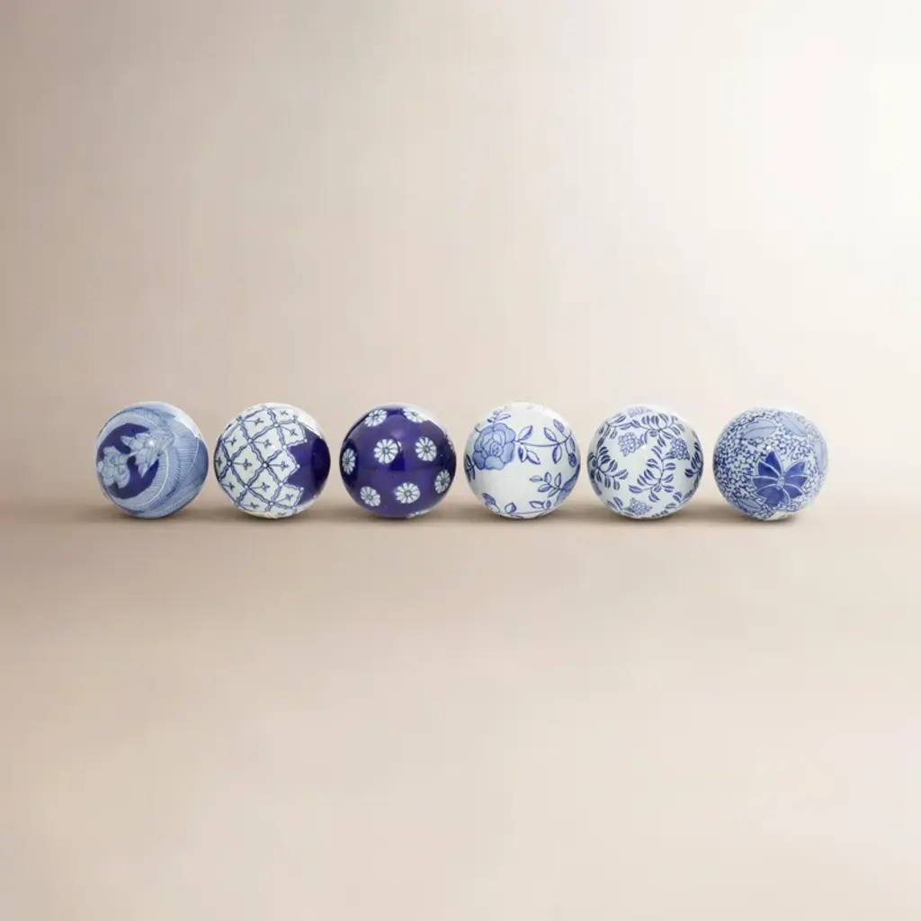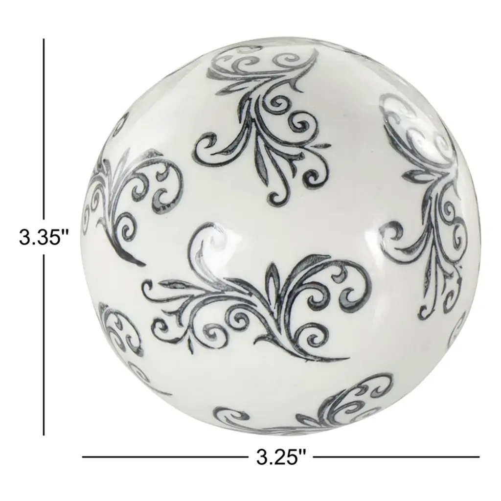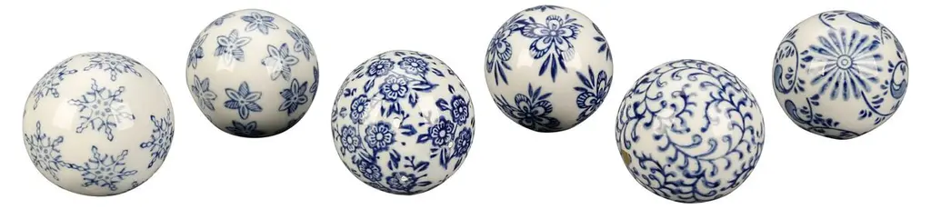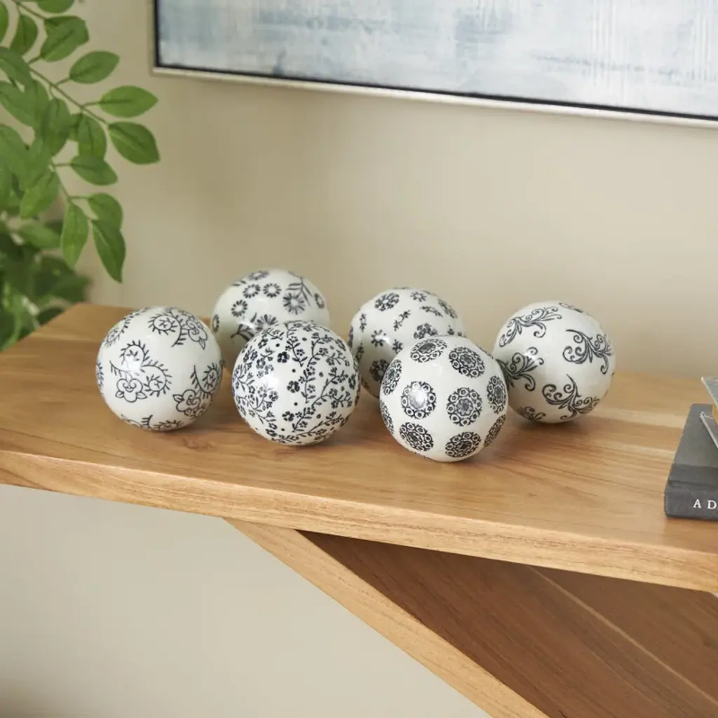 Floral set of 6 orb fillers can be tastefully displayed in living rooms, bedrooms or hallways for an added touch of elegance. Designed with felt or rubber stoppers at the base that prevent scratching furniture and table tops, as well as sliding around. Ceramic orbs & vase filler make a great gift for any occasion. Due to the handmade nature of this item, no two will be alike, there will be slight differences in shape, size, and color. Suitable for indoor use only. This item ships fully assembled in one piece. This white colored ceramic decorative balls comes as a set of 6. Traditional style.