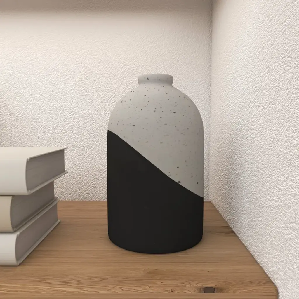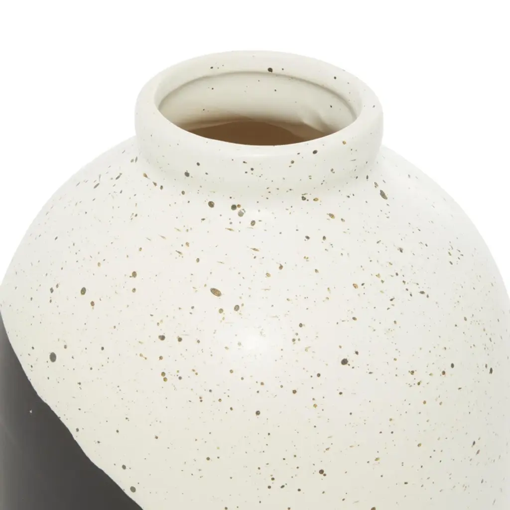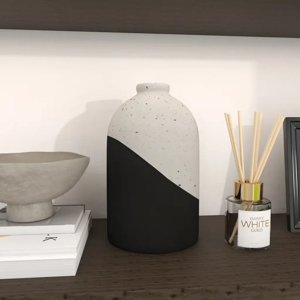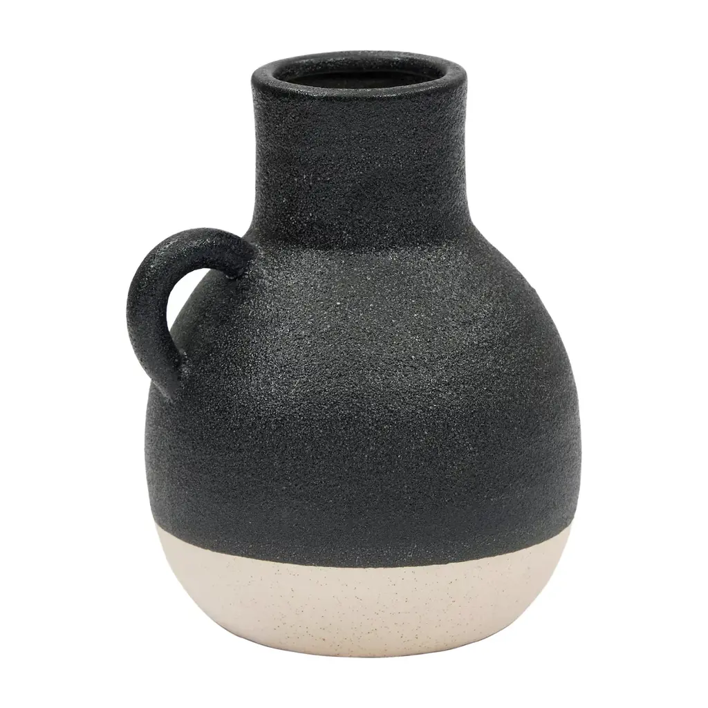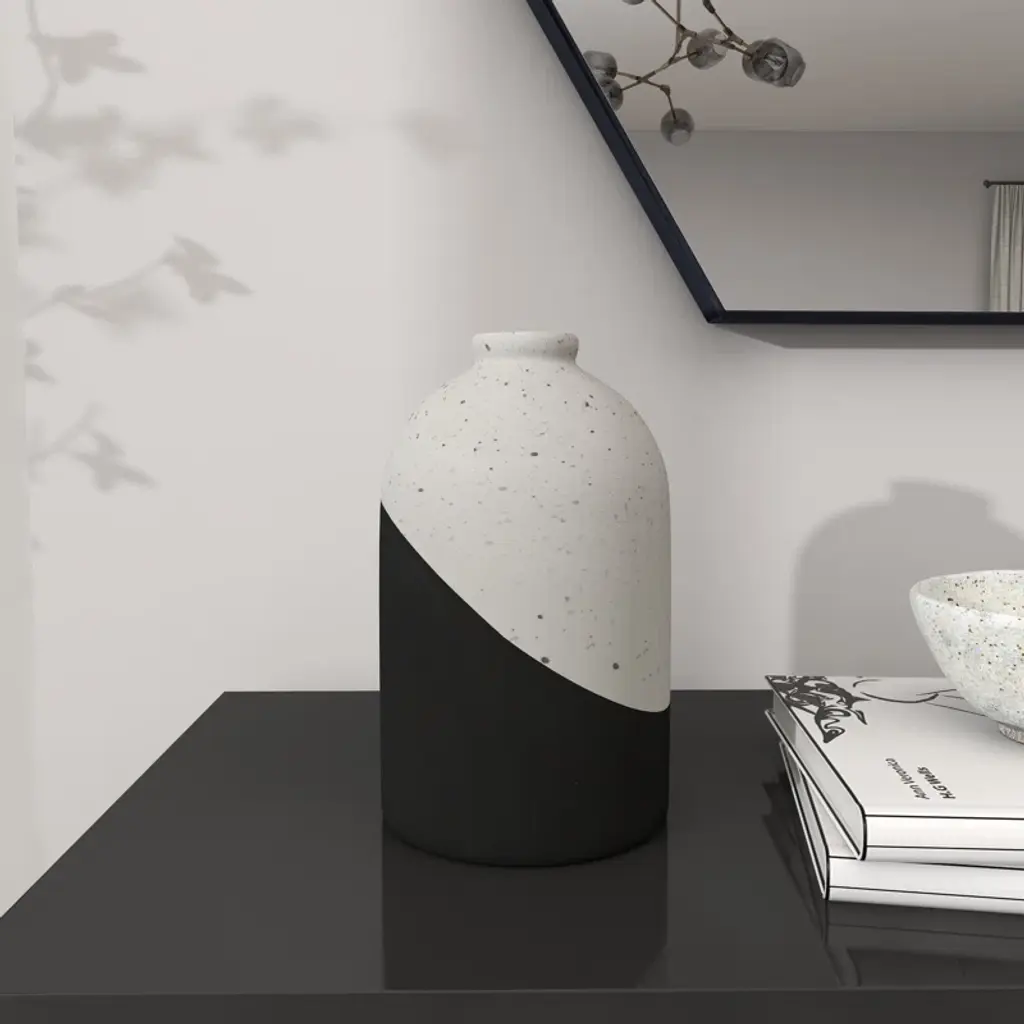 Appreciate their design best against solid-colored backgrounds in contemporary settings. They make great, unique décor on mantles, console tables, or in any living space. Designed with felt or rubber stoppers at the base that prevent scratching furniture and table tops, as well as sliding around, This item ships in 1 carton. Due to the handmade nature of this item, no two will be alike; there will be slight differences in shape, size, and color. Suitable for indoor use only. This item ships fully assembled in one piece. This is a single black, white-colored vase. Contemporary style. The vase has a 2-in. mouth opening.