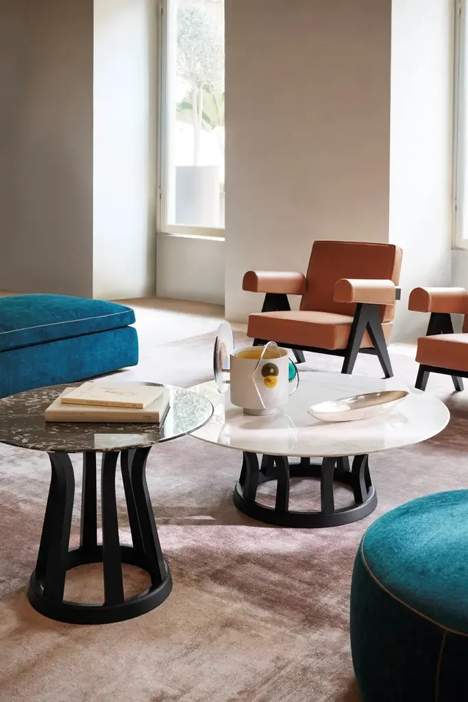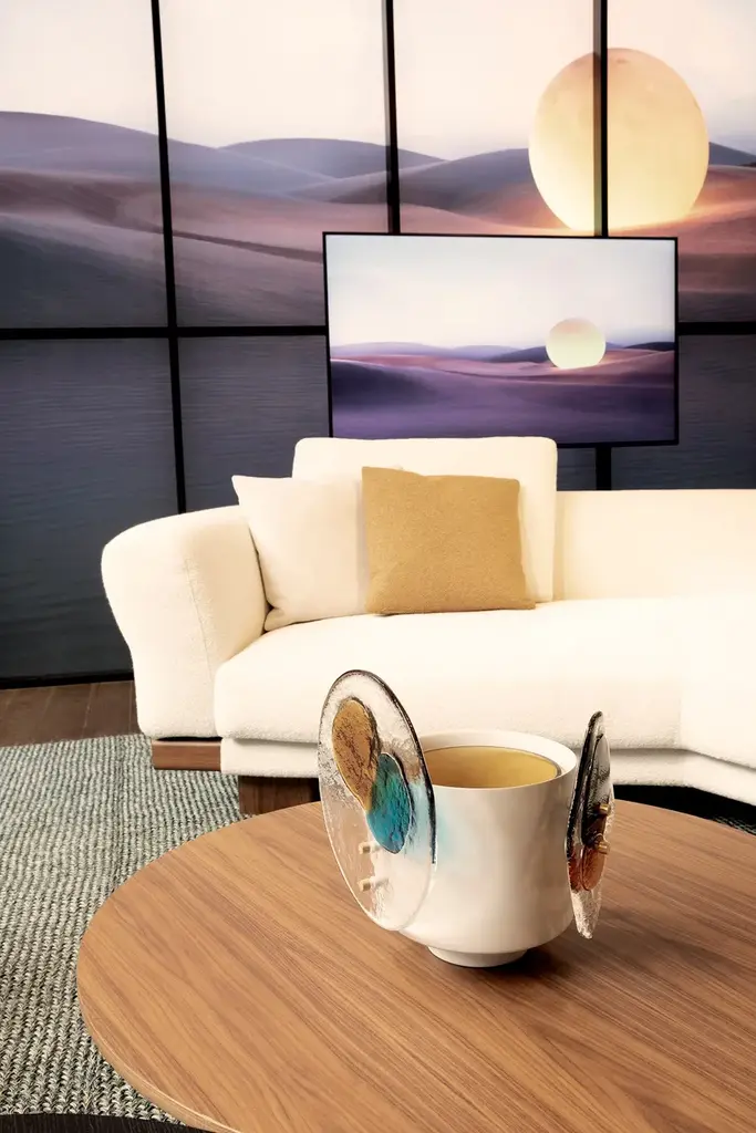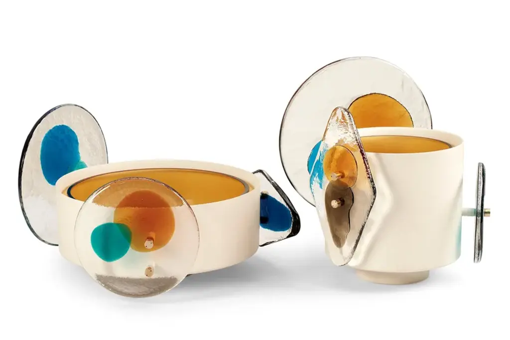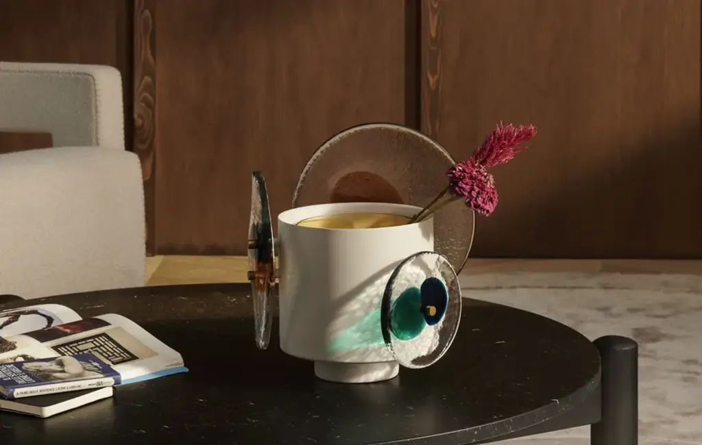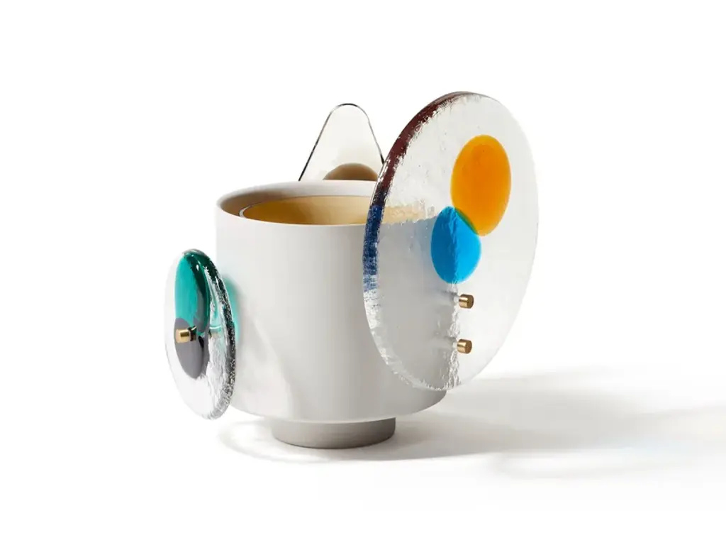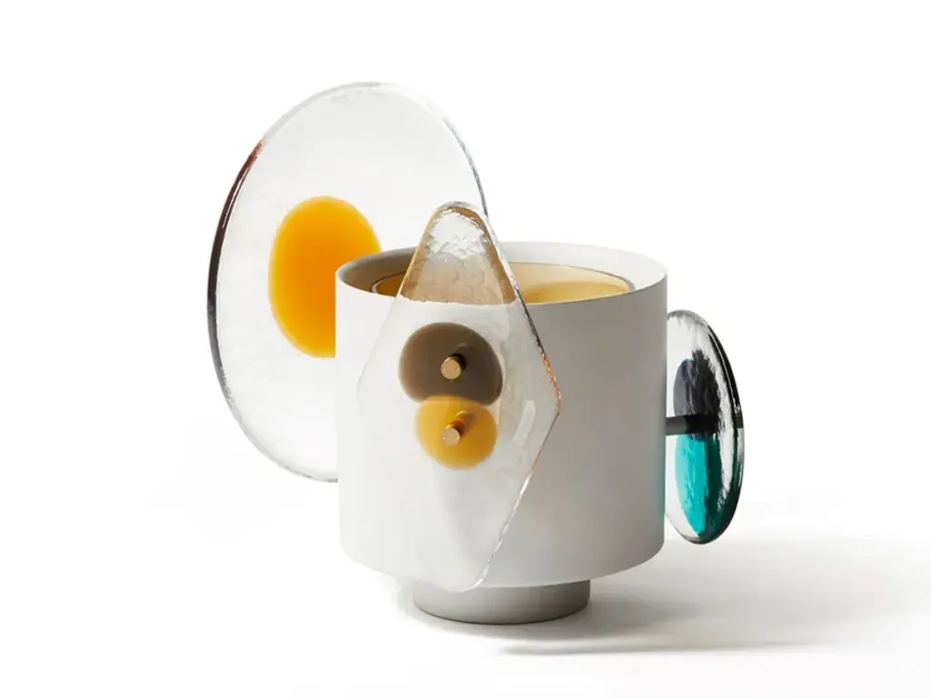 Colourdisc - Optional internal vase combined with code 79701.The English designer Bethan Laura Wood interprets the synthesis between the centenary art of Murano glass and contemporary design with a fruit bowl and a cylindrical flower vase, produced by Venini. The vases’ structure is in lacquered brass (available in two finishes in light shades) to which decorative glass is fixed through two brass elements; the individual tiles are cast in metal moulds and coloured thanks to the overlapping of two dots of colour from the Venini Archive, in a special colour combination depending on the size. Inside the structure it is possible to insert an optional blown glass vase in amber or horizon blue to offer an additional pool of colour to the object while also allowing it to be more easily filled with water for flowers