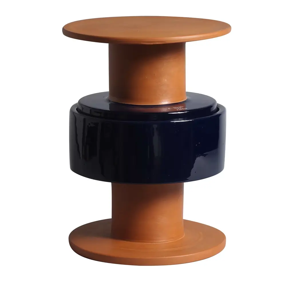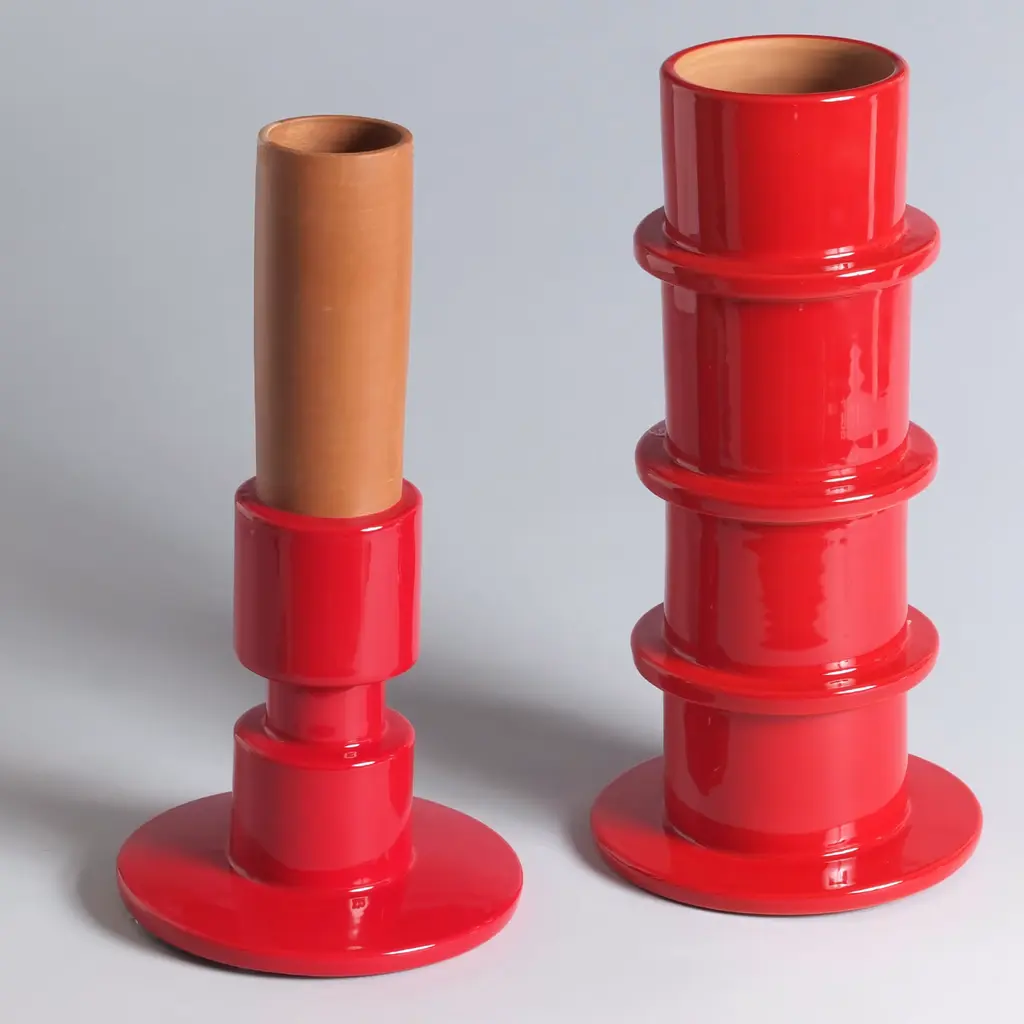 Part of the Composizioni Collection of one-off designs with the double function of vases and abstract sculptures, this precious piece exemplifies the endless creative potential of Faenza pottery. Its harmonious silhouette in glossy, red-glazed majolica exposes warm bisque sections when the two interlocking, structural elements are detached and transformed into slender vases. Handcrafted by master Pier Paolo Garavini, the design was conceived as an artistic take on future urban landscapes.