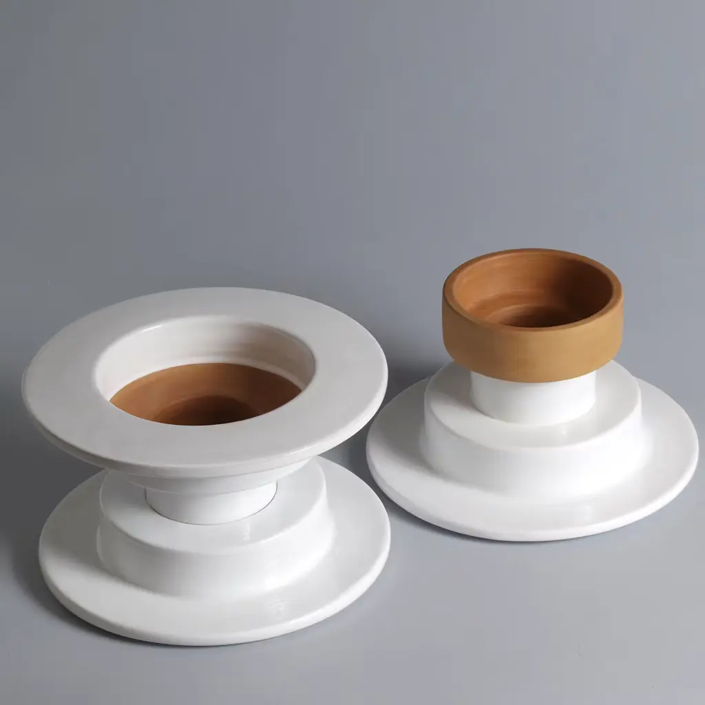 Named after the French name for the city of Faenza, globally renowned for the production of fine pottery, this one-off design was handcrafted by master Pier Paolo Garavini. The glossy, white-glazed majolica body boasts an interplay of disks and cylindrical volumes arranged in distinct elements that can be interlocked to achieve a contemporary, accent sculpture. If the components are detached the design can be used as tiny vases with the exposed sections showcasing the natural terracotta color and texture.