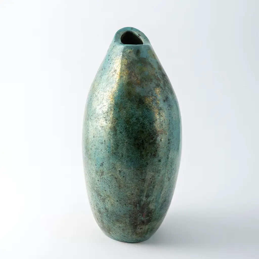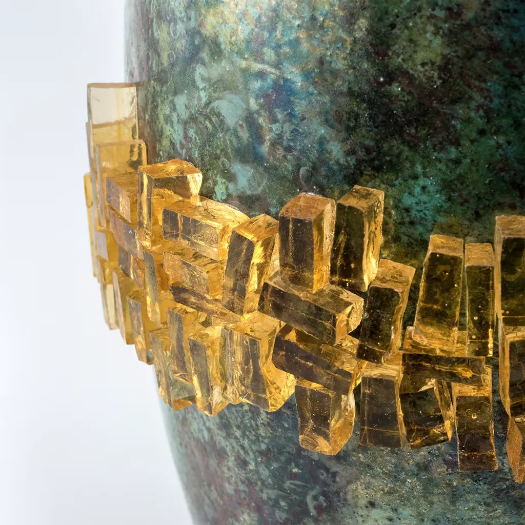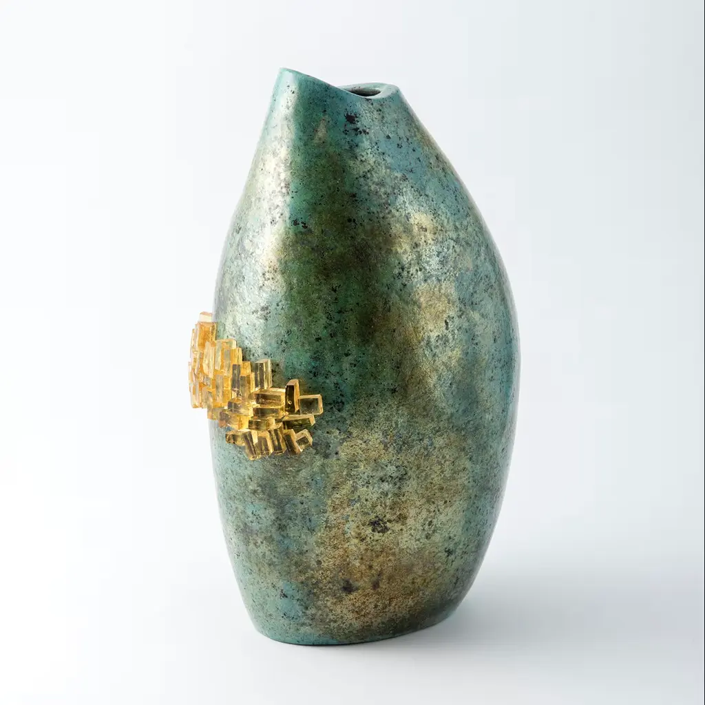 The Concerto in Oro Vase is a captivating expression of artistic craftsmanship, defined by its sculptural oval silhouette. This one-of-a-kind piece fuses the ancient technique of raku ceramics with intricate mosaic work, resulting in a striking interplay of materials and textures. The glazed surface features a delicate balance of light and dark sea green tones, enriched by bold accents of gold and smoky black. An irregular band of transparent golden mosaic tiles partially wraps the vase, creating a dynamic contrast that elevates its visual impact. Part of the 2025 edition, each vase is unique and comes with a protective box, a warranty certificate, and detailed care instructions to preserve its beauty over time.
