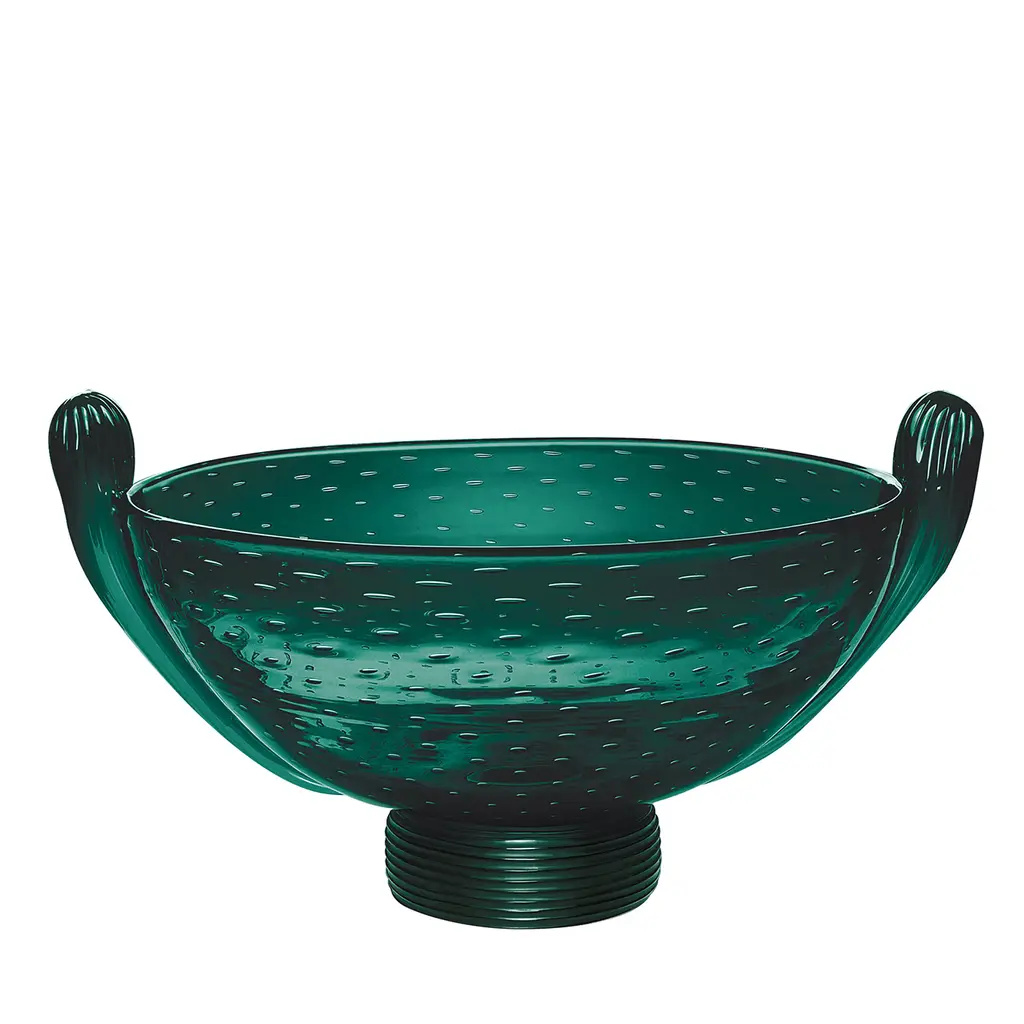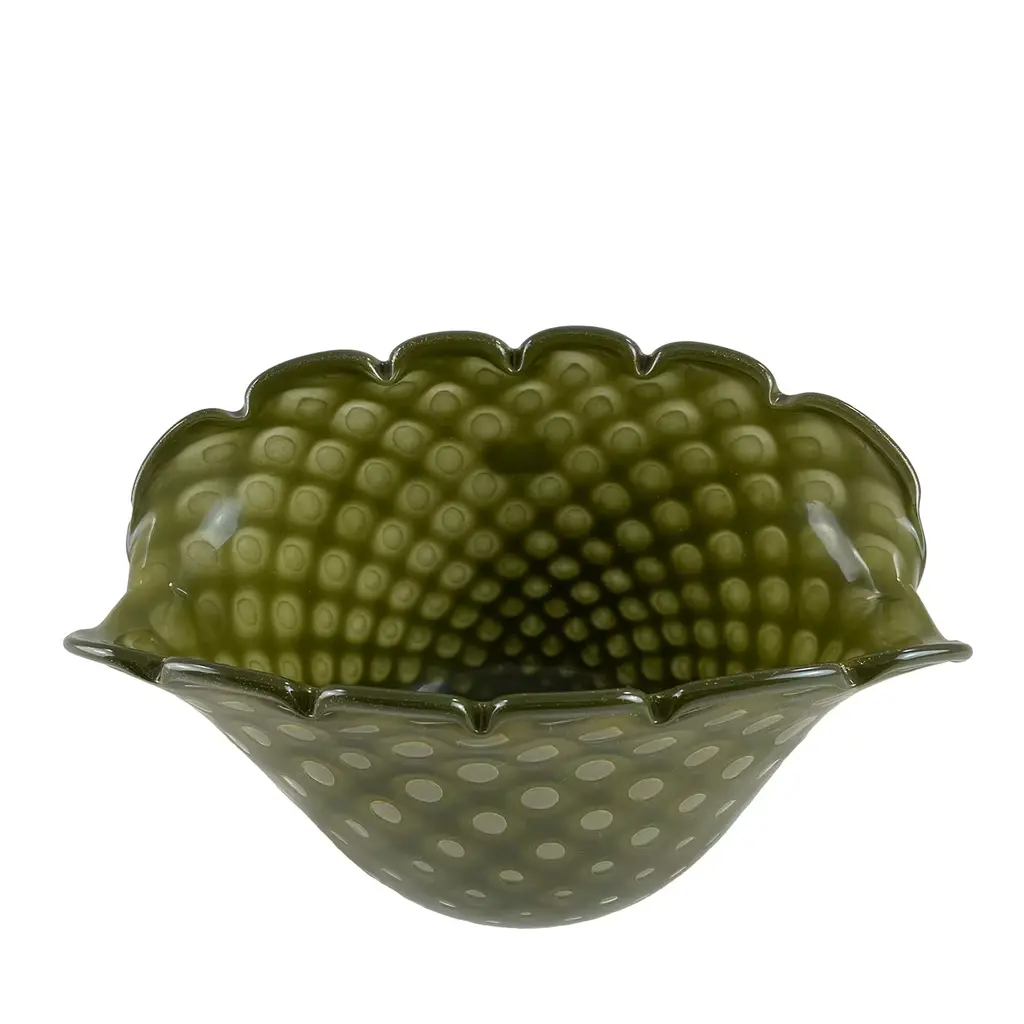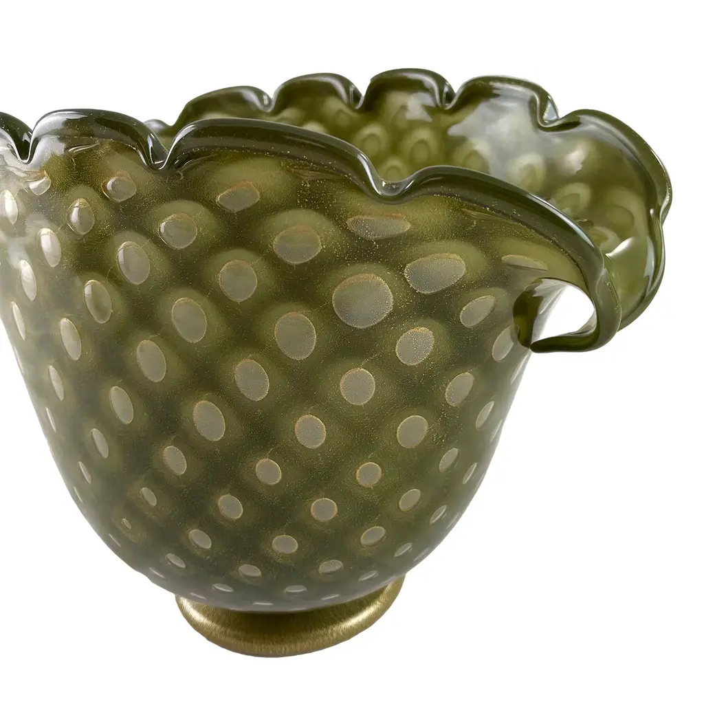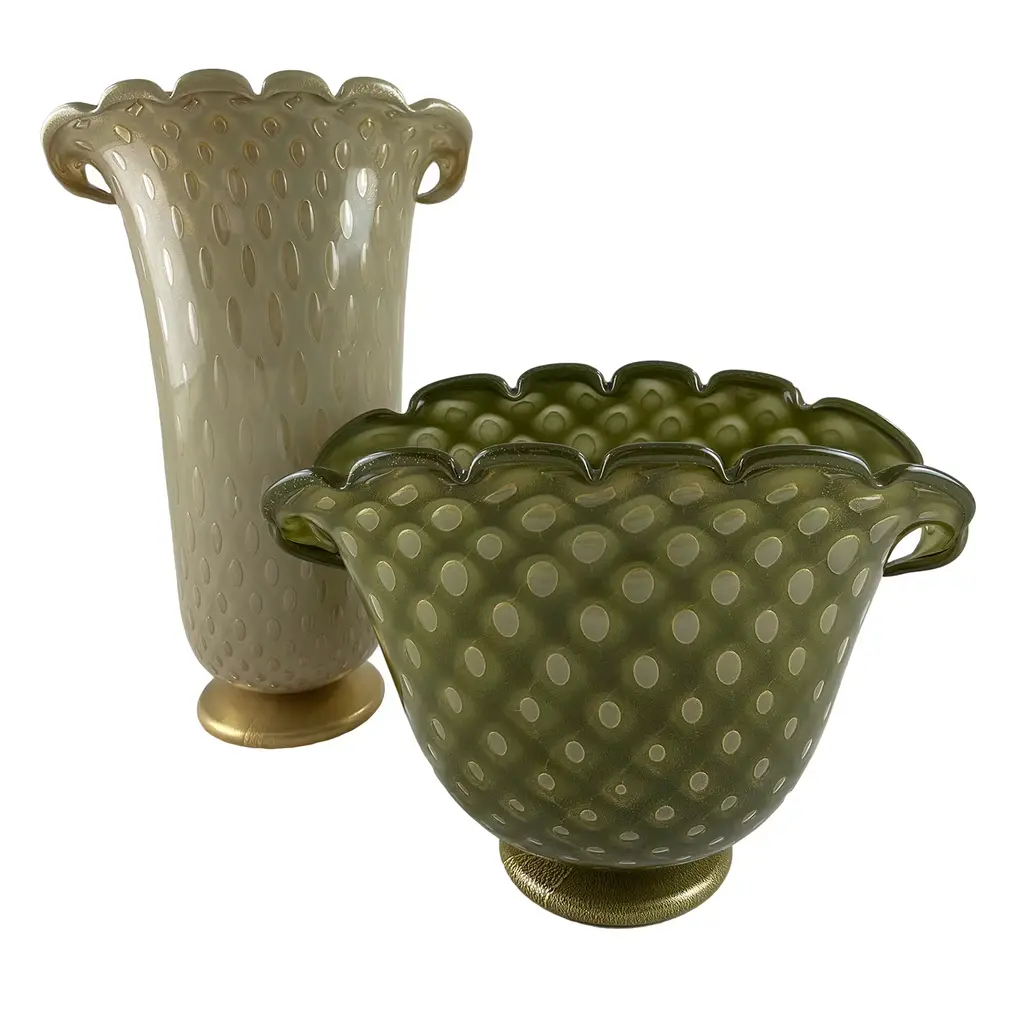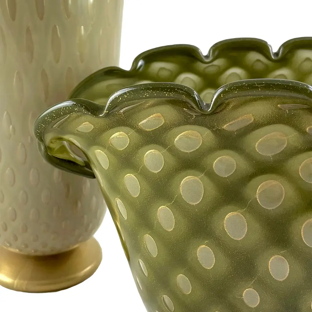 Sinuosly flaring to a scalloped rim, this superb mouth-blown glass vase reveals its distinctive inspiration from sea shells. Its extensive "balloton" texture - obtained by following the eponymous method in which the glass is mouth blown into a truncated-cone-shaped mold with pointy tips - is embellished by precious gold leaf accents for a mesmerizing general sheen.