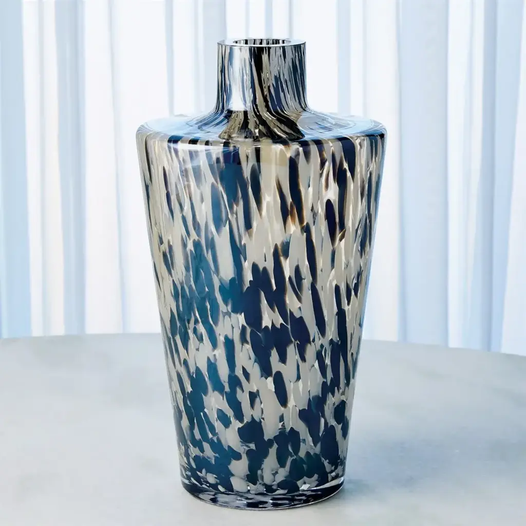 The Shoulder Vase is mold-formed blown Polish art glass with black and beige flecks of colored glass. Each is individually created, so colors may vary. From a fashion forward perspective, Global Views offers accessories, furniture, statement lighting, and an assortment of rugs and mirrors to add beauty and joy to your home.