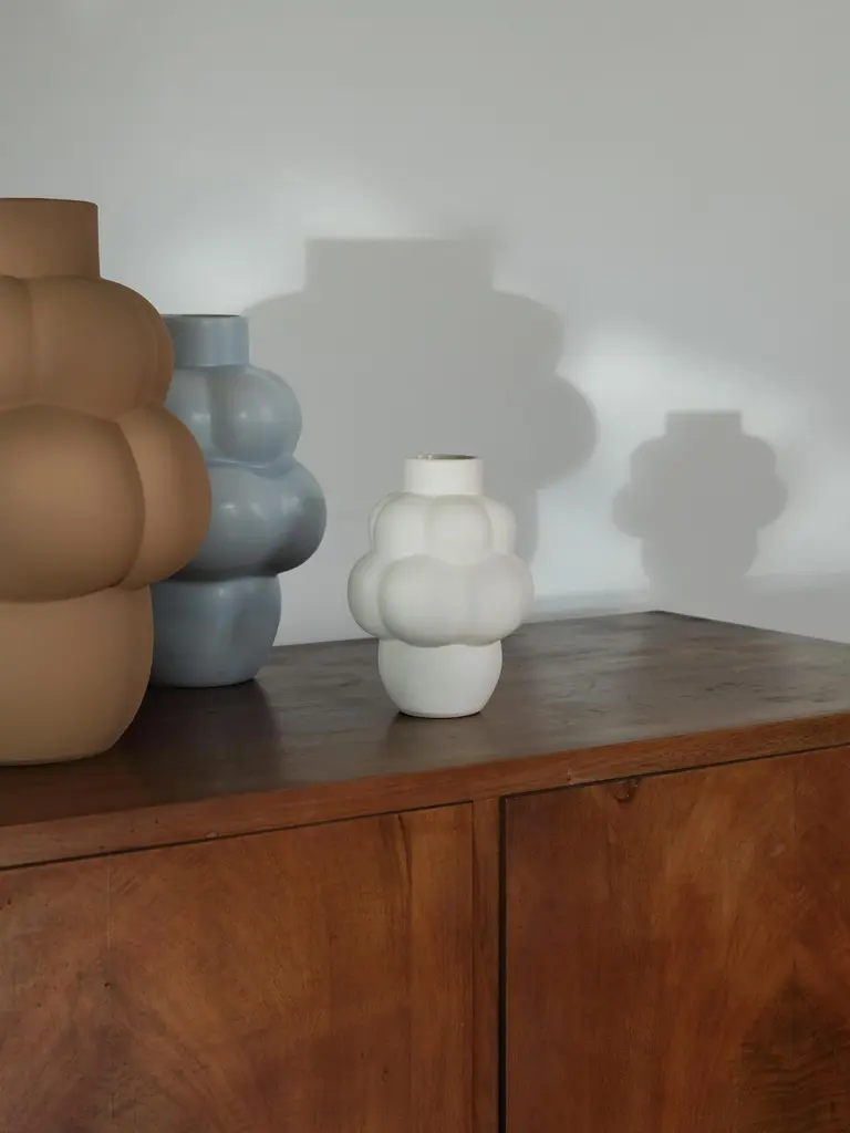 Balloon vase 04 petit sky blueHandmade ceramic vase made by Danish artist Louise Roe.Measure: Ø6-12 / H18 cmSculptural object with clouds shape. About the artist:LOUISE ROE is a Copenhagen based interior design brand, established in 2010.Each object is personally sketched by Louise Roe and thrives on aesthetics and high quality craftsmanship. The collection is sophisticated yet simple, and has a modern avant-garde style.Carefully chosen organic materials, combined with specially selected tones, brings out both sculptural and architectural values.Every piece has a story to tell and carries itself individually and collectively.This piece is another take on the iconic balloon vase, however now in a ceramic glaze. Its tactile exterior differentiates itself from the originally soft glass impression. Hand-molded in Portugal, each object is unique and displays its own character, which we greatly admire. The Balloon Vase 04 can be elegantly complimented by a bouquet of flowers, however, it is characteristically also a stand-alone monumental piece of art.This specific impression of the series, as apparent in the name, is characterised by its rough and sandy, yet soft, outer exterior, achieved using engobe ceramic glazing.The Sanded Grey exemplifies elements of neutrality and balance. The perfect touch to a simplistic setting.