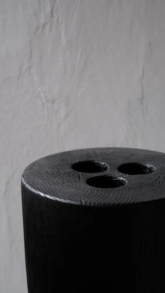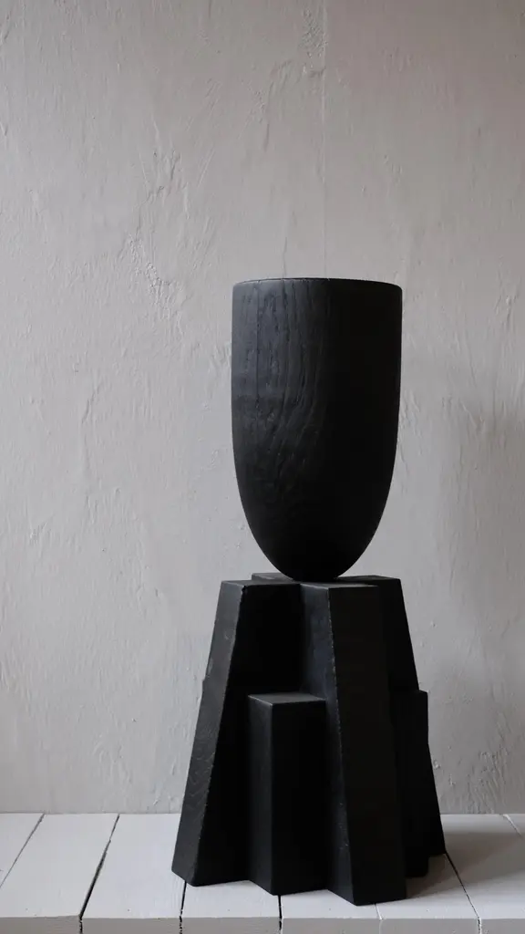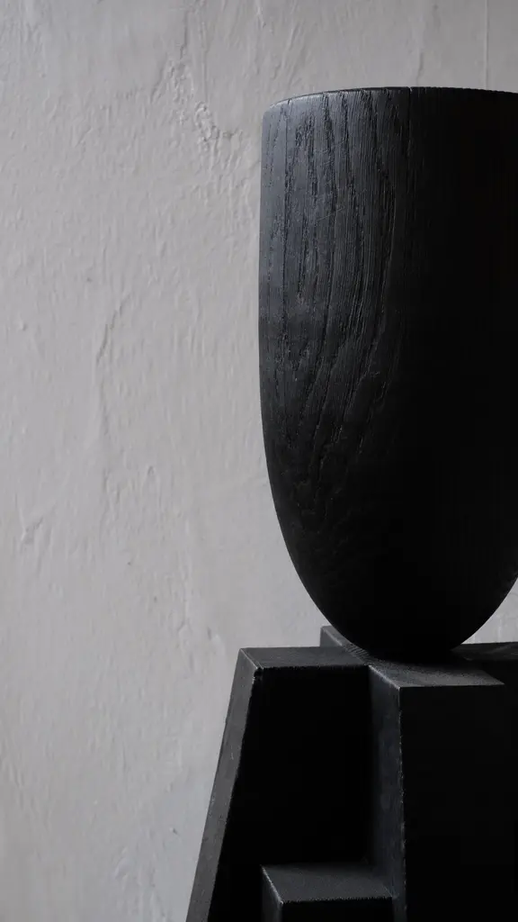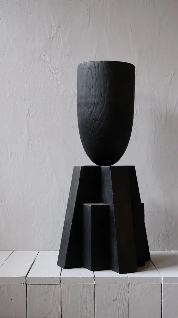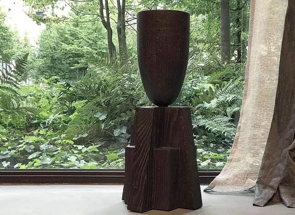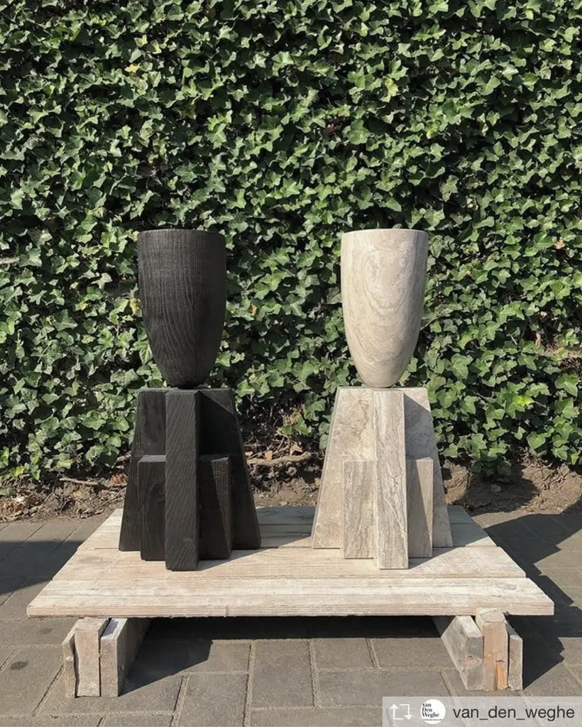 Babel vase by Arno DeclercqDimensions: W 32 x L 32 x H 65 cm Materials: burned and waxed oakArno DeclercqBelgian designer and art dealer who makes bespoke objects with passion for design, atmosphere, history and craft. Arno grew up in a family with parents who like to work with beautiful brands and objects.His father studied at the Royal Academy of Arts Fashion Department, he worked for Bikkembergs and made his own fashion brands, but has also collected tribal arts for more than 20 years. His mother, who worked with his father from the beginning, bought a shoe store in 2010 where they sold brands as Rick Owens, Ann Demeulemeester, Maison Martin Margiela, ... With the interest in beauty he learned from his parents, Arno studied interior design, after learning a lot about materials and with great knowledge of history he designed interiors and opened his own gallery for ethnographic art and design.The collection has come to the idea that there are too few interiors where they no longer have the big and static vases and candlesticks that the people had in big houses over 100 years ago. By focusing on architecture, ancient arts and design, after war buildings, defense buildings (bunkers and fortresses) and tribal arts, he created a collection that became a Classic.Each piece is unique because it is entirely handcrafted by him. Made of tropical hardwood called Iroko this he discovered after one of his many trips to West Africa interested in voodoo arts.In these strange tribal arts, the wood "Iroko" is used in many objects, according to their culture, the ancestors lives in these trees, and they also call this tree "the king of the forest".Arno also combines this with Belgian oak, that dried for more than 30 years, wood that was provided for the many furniture makers in Mechelen.By treating these objects through the Yakusugi technique or another mentioned "Shou Sugi Ban" an ancient Japanese technique where the objects are burned to protect the wood from weathering and subsequently fixed to get a patina look as long as possible. This gives each object a unique texture.
