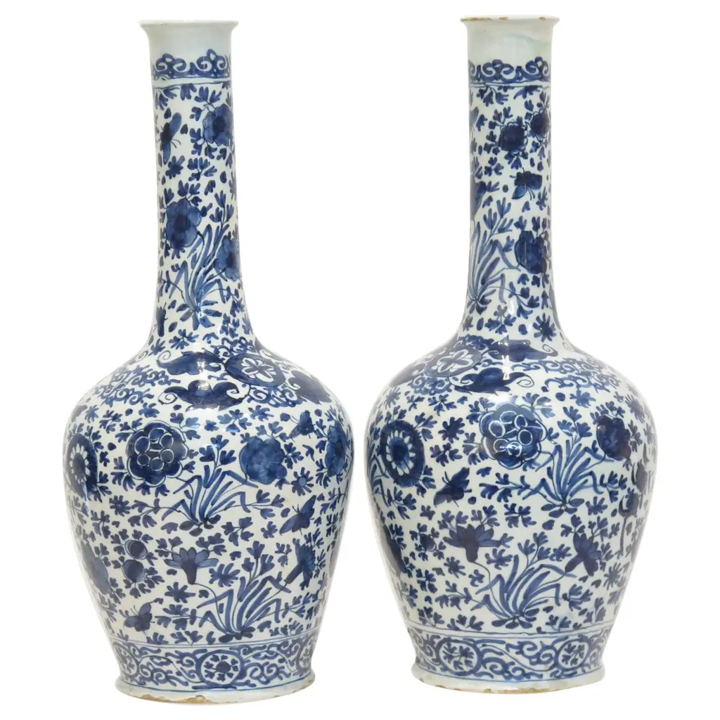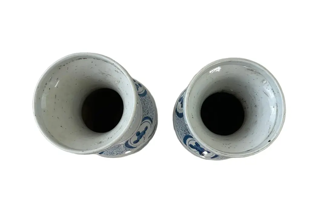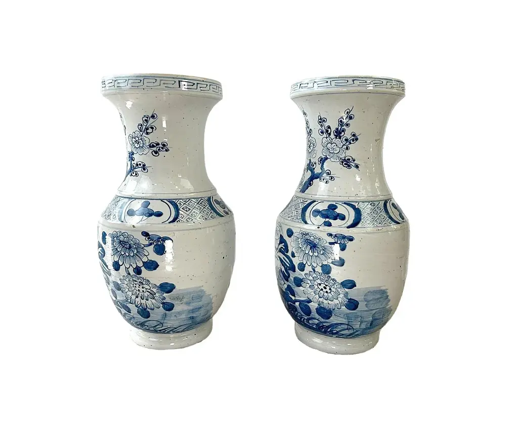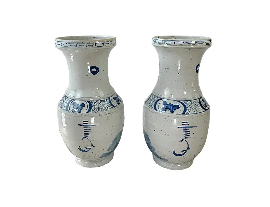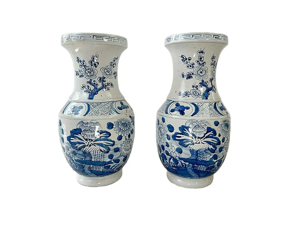 This is a pair of Indigo and Bone White Chinoiserie vases. These vases are hand made with a "foot stomp" process and hand painted in a botanical pattern that stretches around each vase. This is painted in a watercolor style where the blue is diluted or saturated to create a beautiful washed or deeper hue. This is about 15 inches high and about 8 inches wide. They would be incredible on a mantel or console and would look fantastic with other blue and white porcelain! The Dimensions: 15"H x 8"W, 6.5" at opening. 5.5" at base. This vase has a vintage patina, but new. These often have minor imperfections during the foot-stomp process. They are made to look antique and you will find small cracks, small divots etc. that add to their appearance. This is made in China and hand painted. These are new.