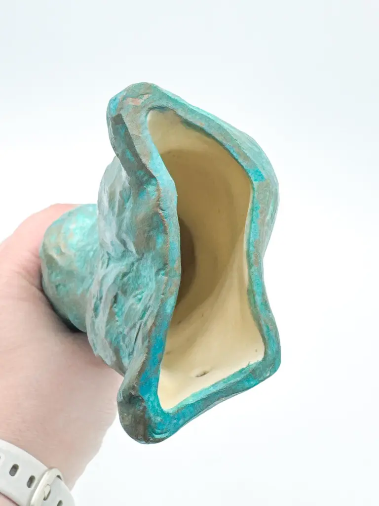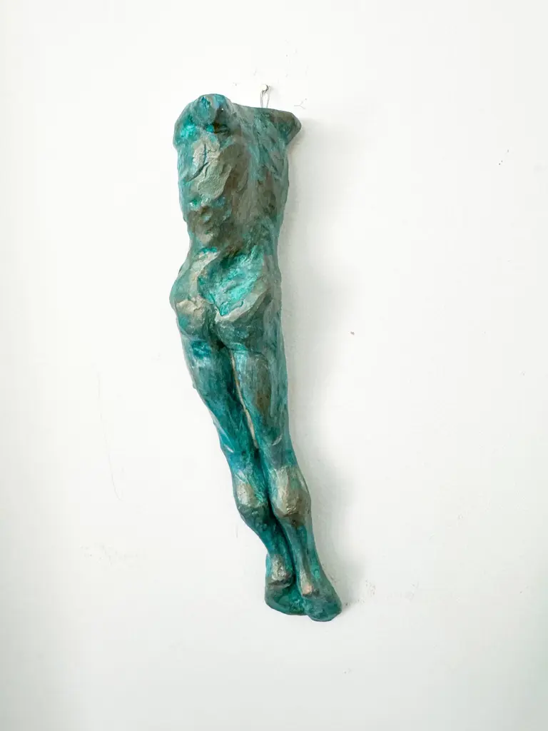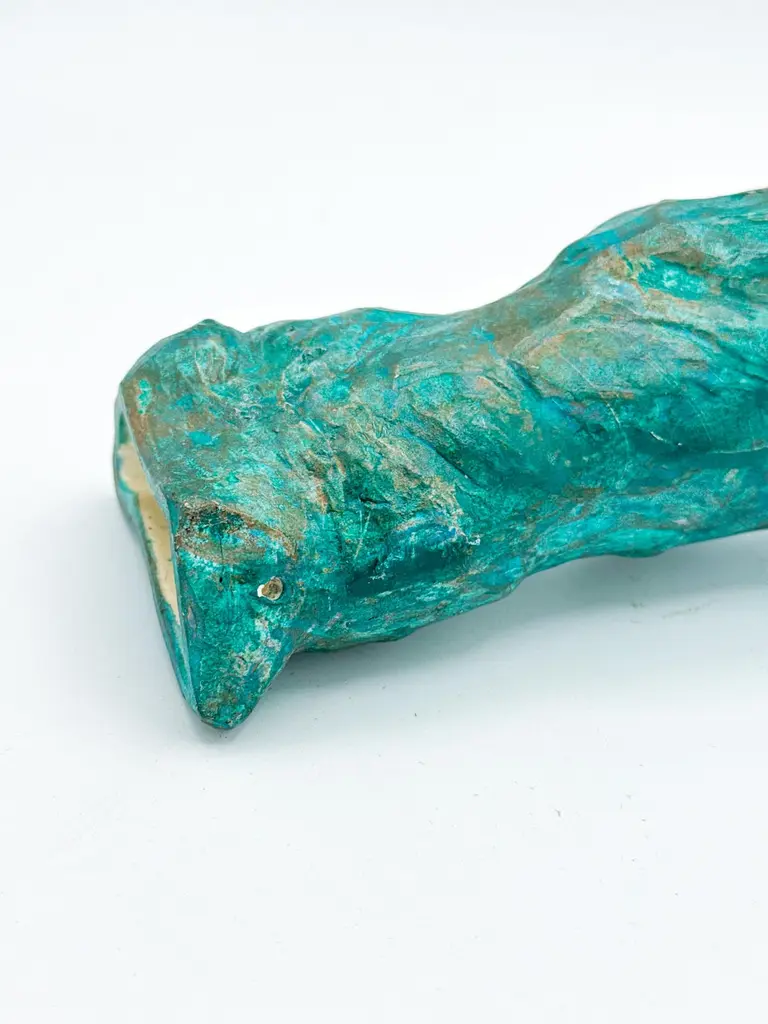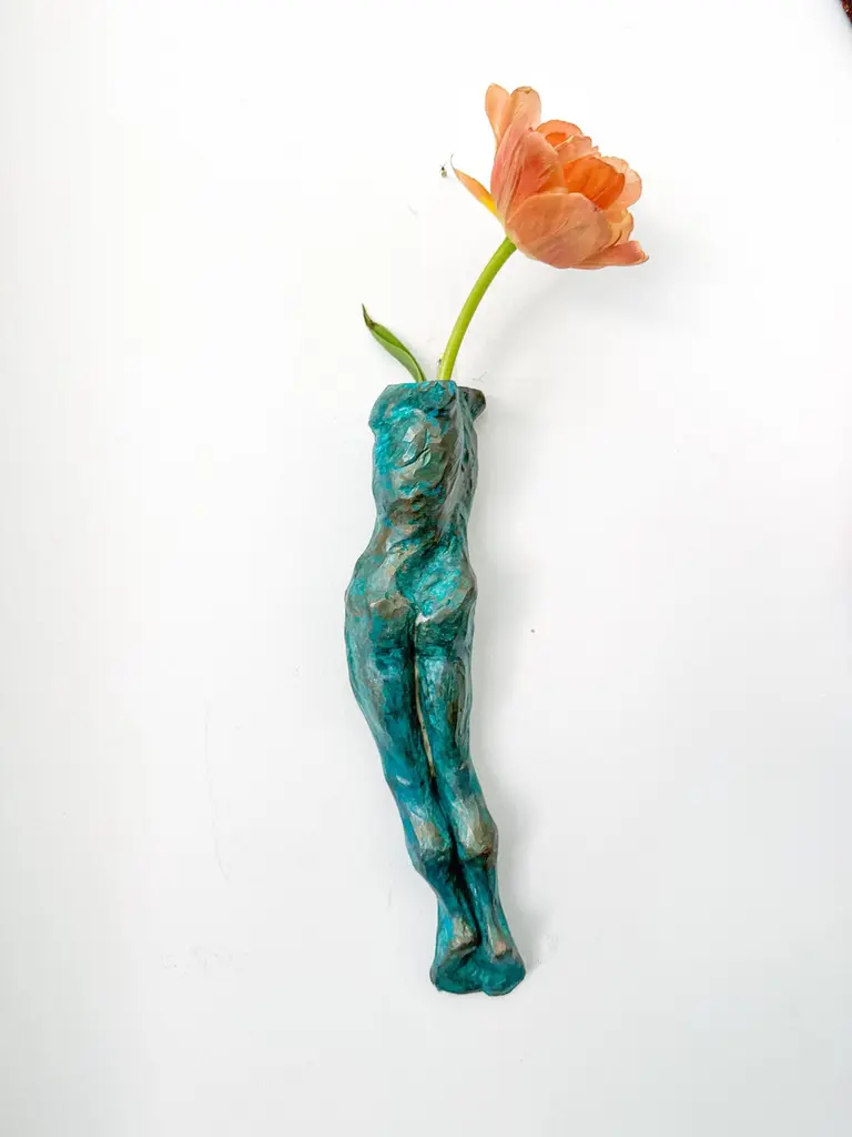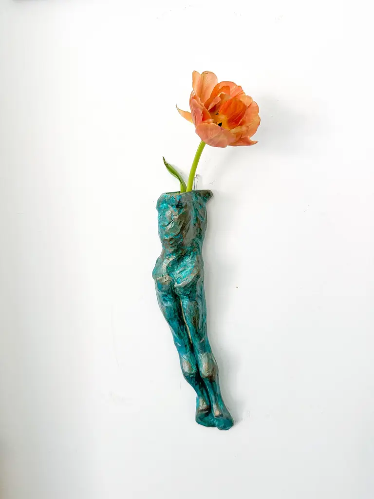 This contemporary figurative wall-mounted sculpture by artist Animism beautifully merges art and function. Featuring a stylized male torso with strong anatomical details, the piece also serves as a sculptural wall vase—perfect for holding a single flower or botanical stem. Rich in texture and finished in a captivating turquoise patina with bronze undertones, it brings depth, warmth, and sensuality to any interior.Signed by the artist at the base, this mixed media male body sculpture is a one-of-a-kind art object designed to hang vertically. Ideal for modern interiors, curated gallery walls, or Brutalist-inspired decor, it adds dimension as a functional vase and as a conversation-starting collectible.Explore our curated selection for more exceptional pieces. Each order is meticulously packed and shipped within 24–48 hours to ensure a secure and timely delivery.