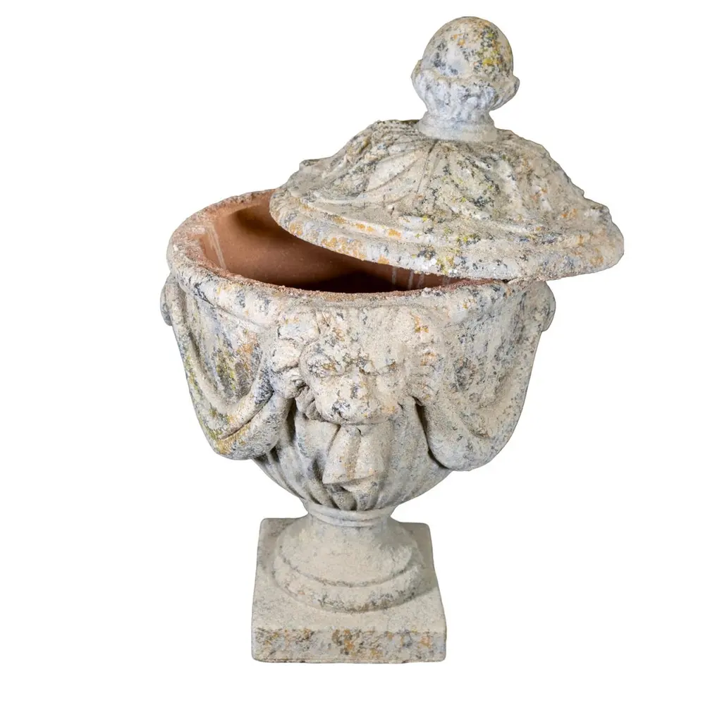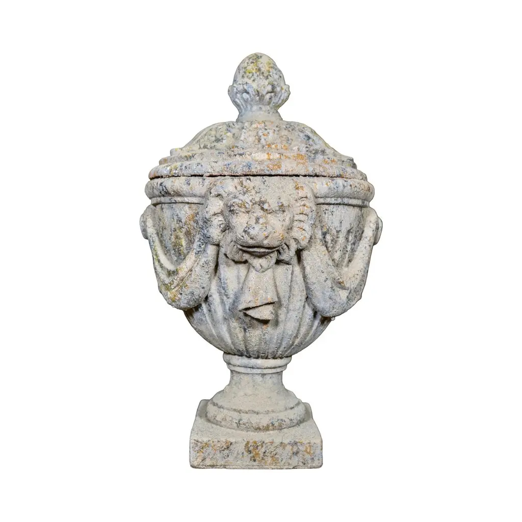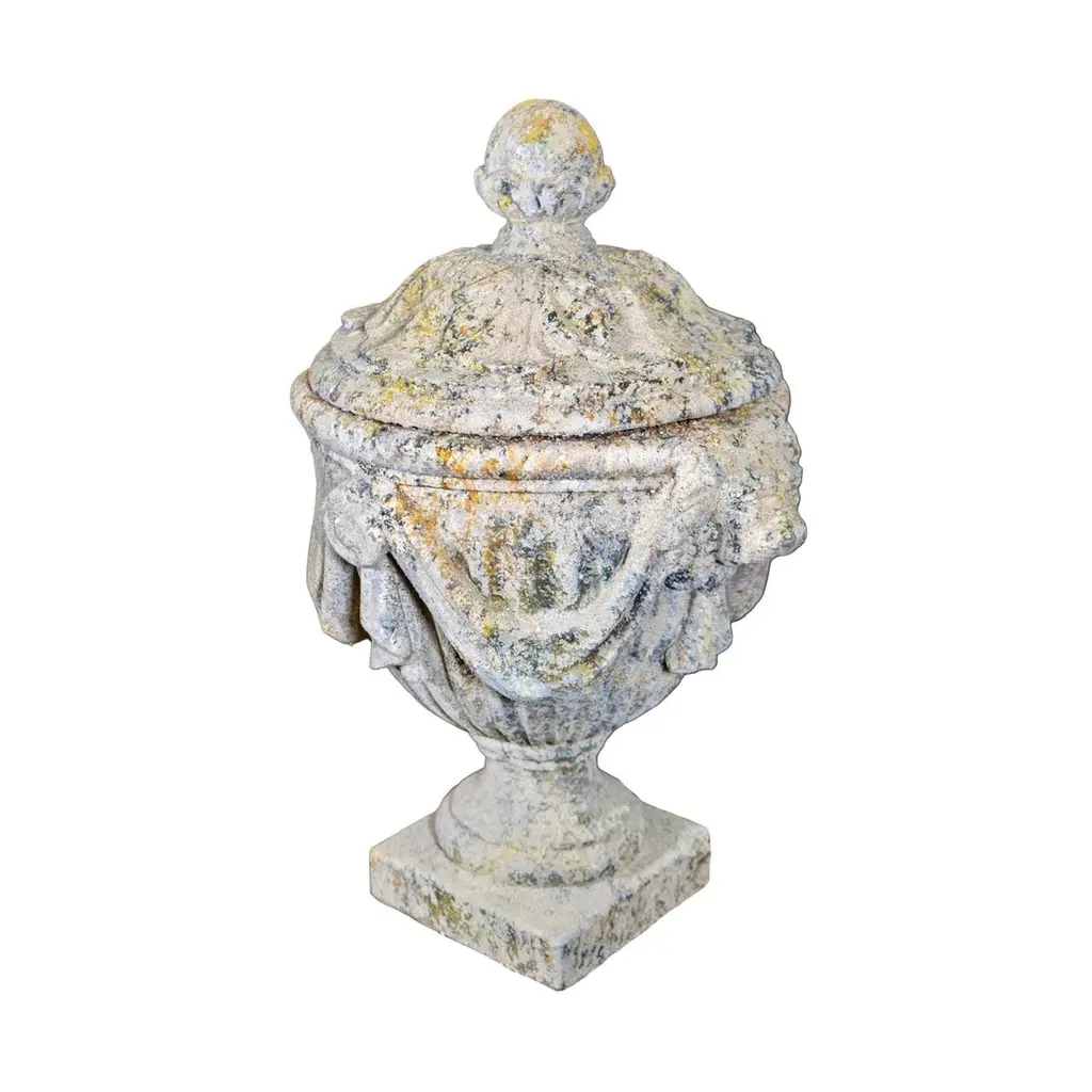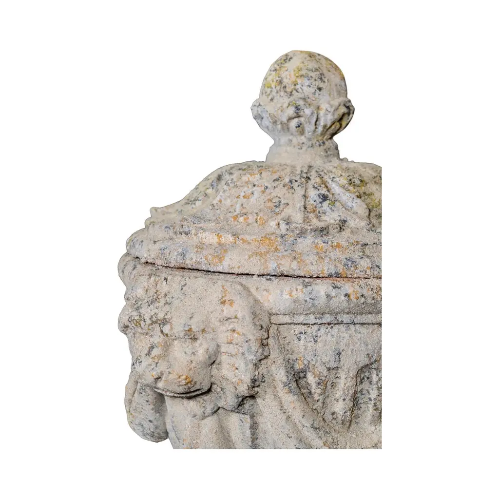 Crafted in France from reconstituted stone, this lidded urn offers the timeless elegance of classical design with the durability of contemporary craftsmanship. Designed with draped swag motifs on one side and carved lion heads on the reverse, the piece evokes the grandeur of traditional European garden ornamentation. Its weathered finish and aged patina create the look of a centuries-old artifact, making it a striking addition to both indoor and outdoor spaces.