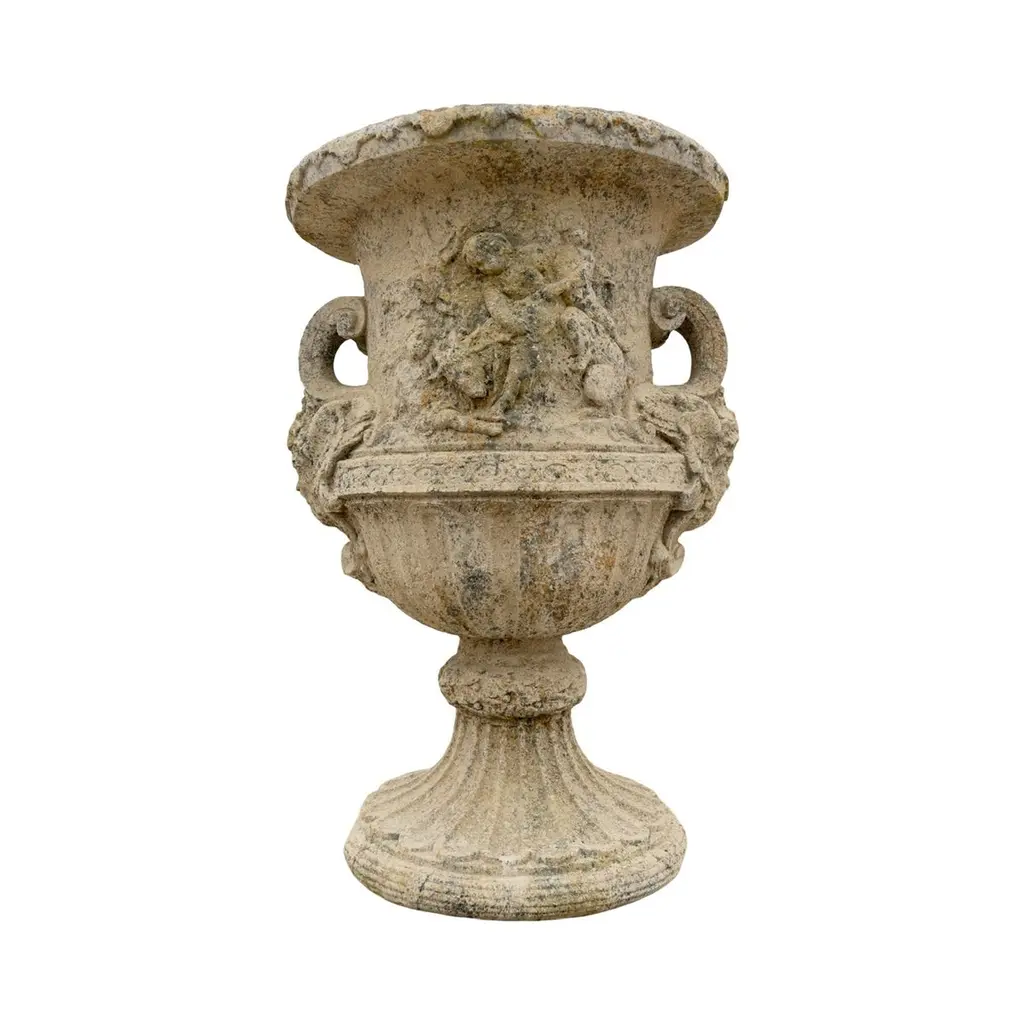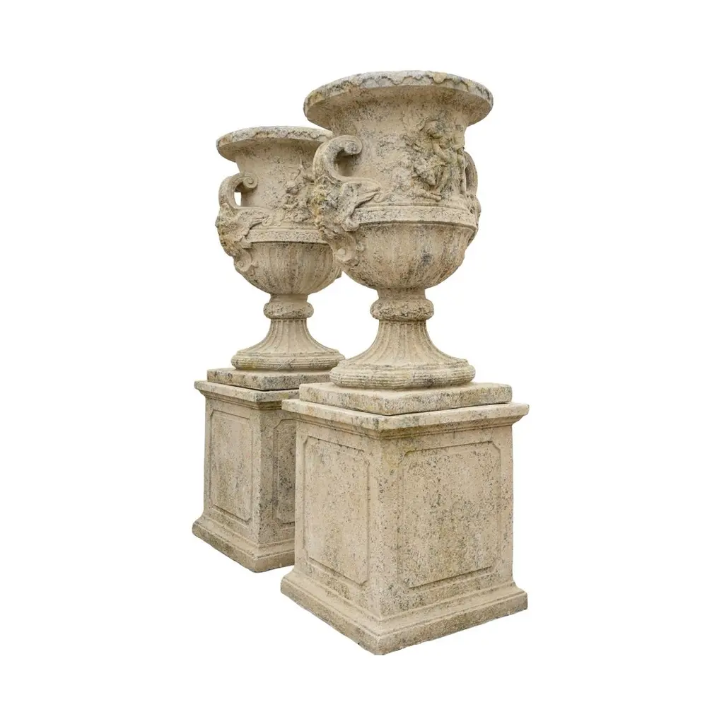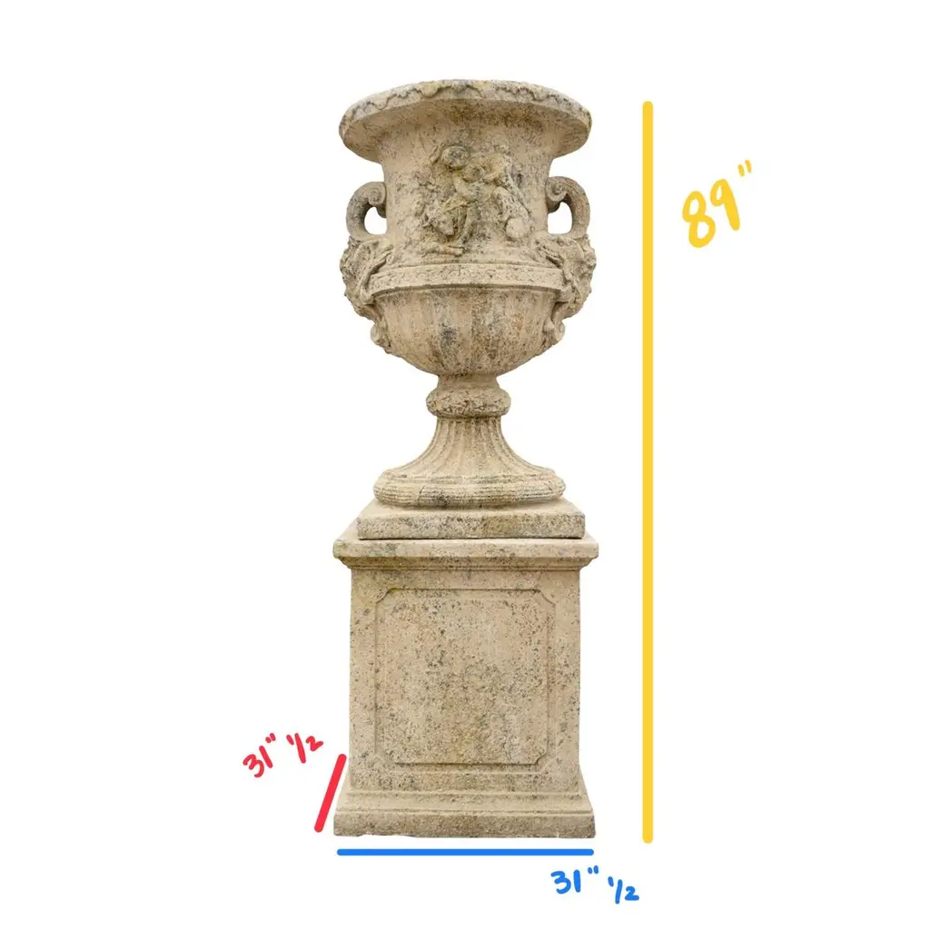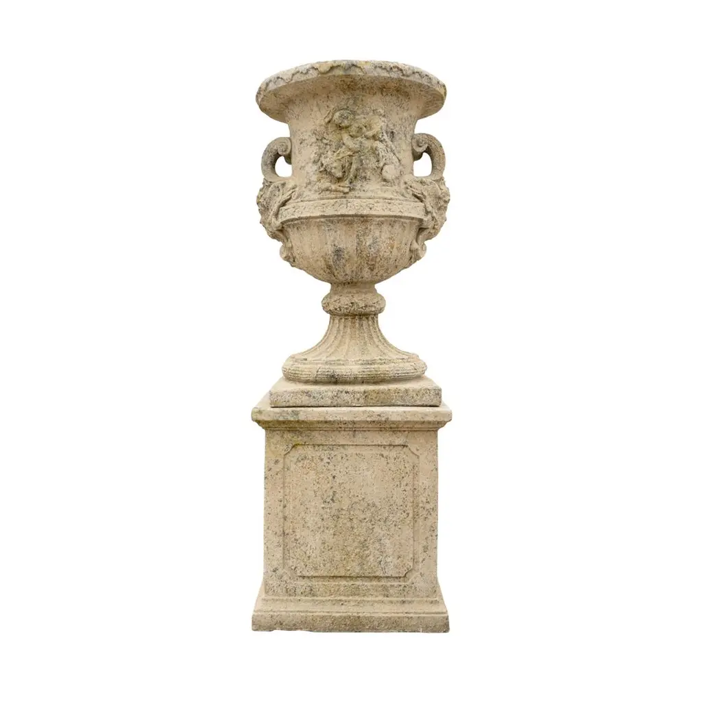 A contemporary French urn and base set made from reconstituted stone with an aged finish. The urn features scrolling handles and carved relief detailing, paired with a paneled base for a classic look. Large in scale, it can be planted with florals or displayed as a striking decorative statement.