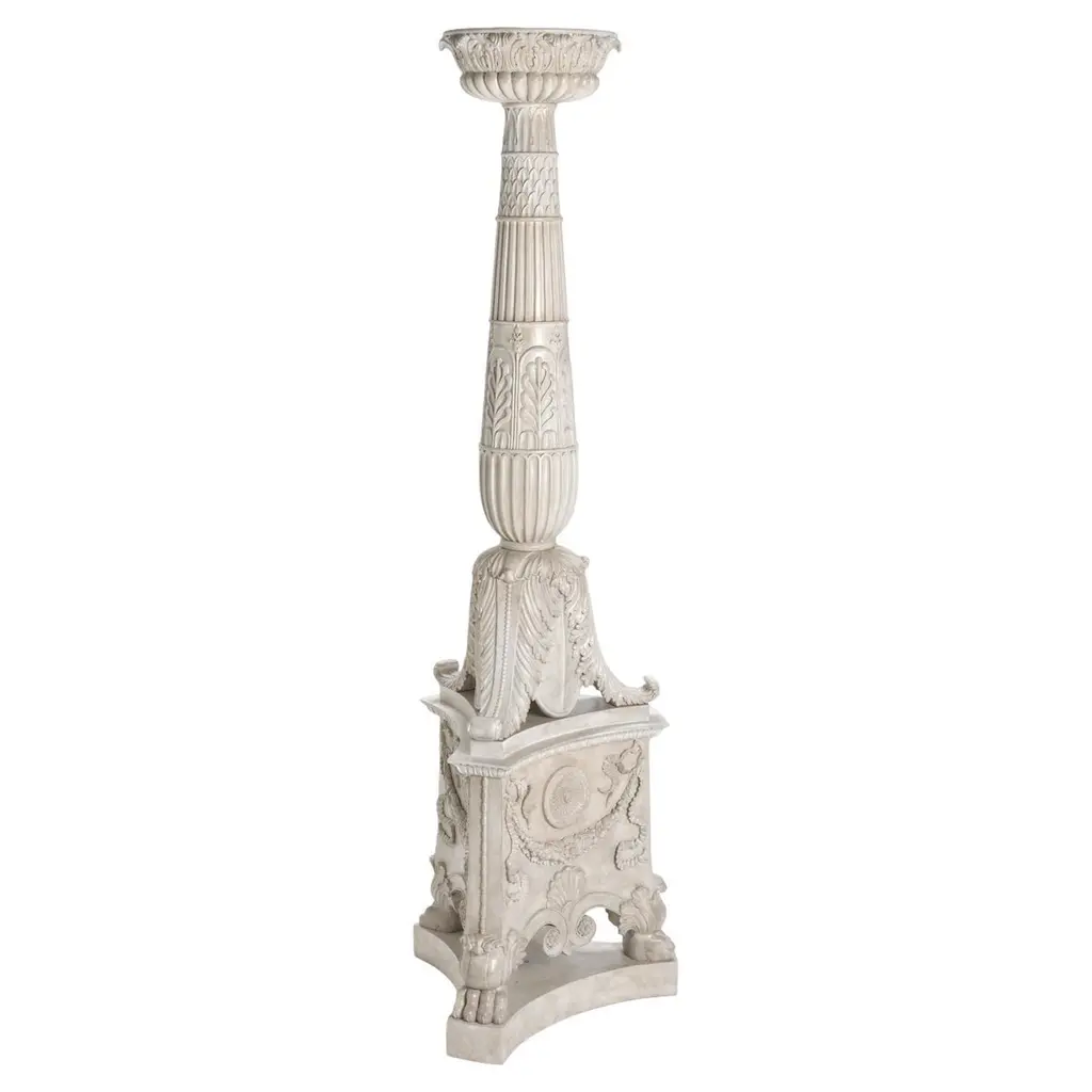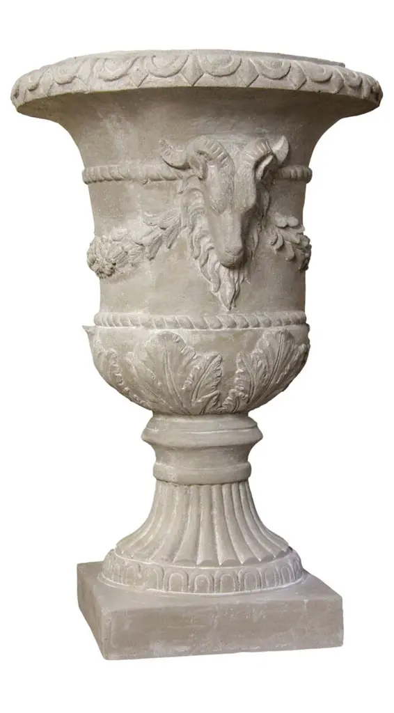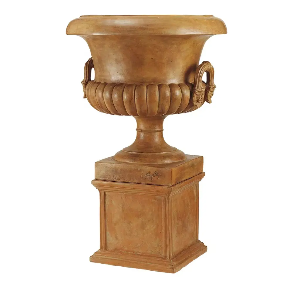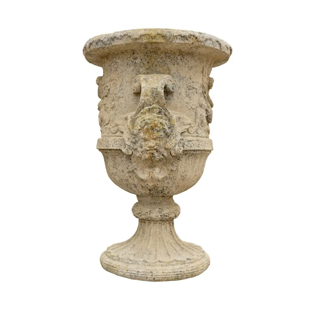 A contemporary French urn and base set made from reconstituted stone with an aged finish. The urn features scrolling handles and carved relief detailing, paired with a paneled base for a classic look. Large in scale, it can be planted with florals or displayed as a striking decorative statement.