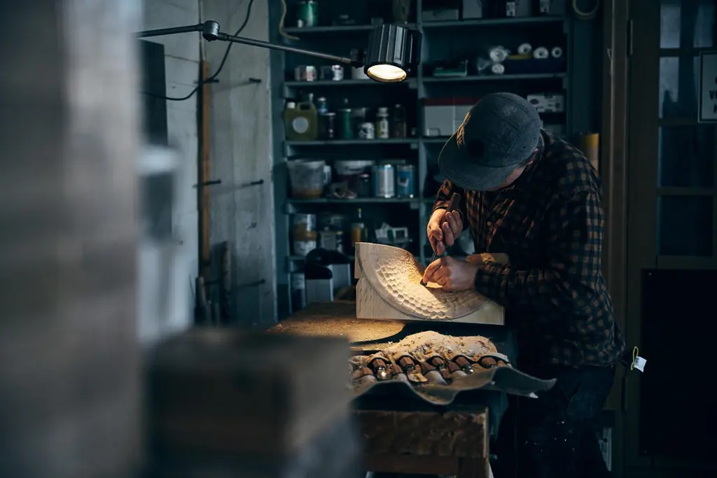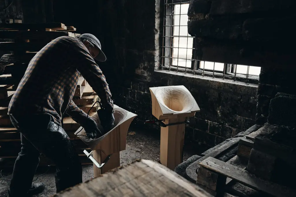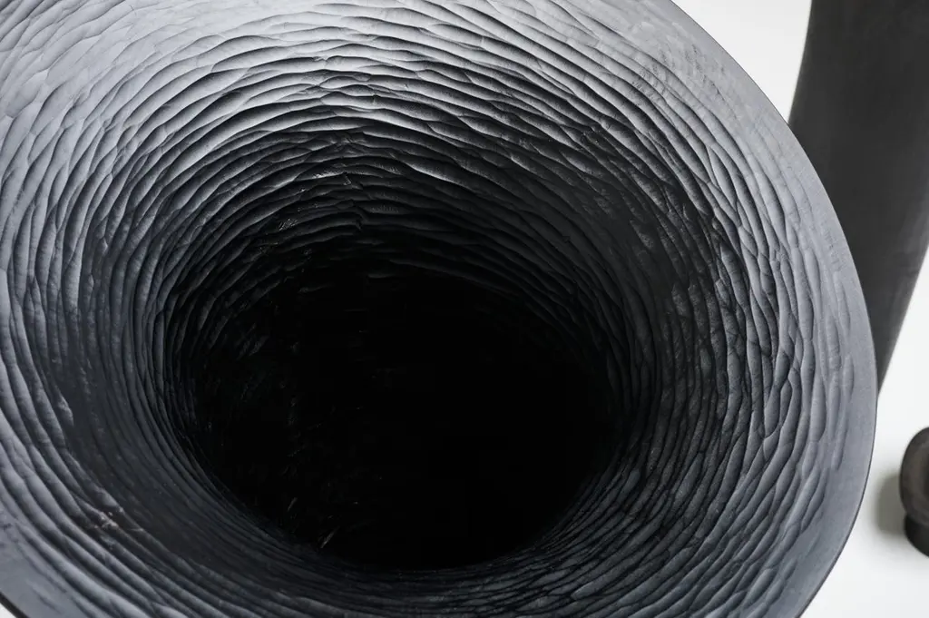 Sisin (finnish for “quiddity”) is a sculptural hand carved vessel series where the forms and textures are inspired by exceptional beauty and necessity of mushrooms.Hollow pedestals give the pieces lightness and creates illusion regarding to the look. One of a kind carving texture is flowing from the sides to inside and finally disappearing to the bottom.All the pieces are made by hand in Fiskars village, FinlandDesign by Antrei Hartikainen 2020Measures: Height 120cm and diameter 30cm Material: Linden woodTreatment: Stained and lacquered.
