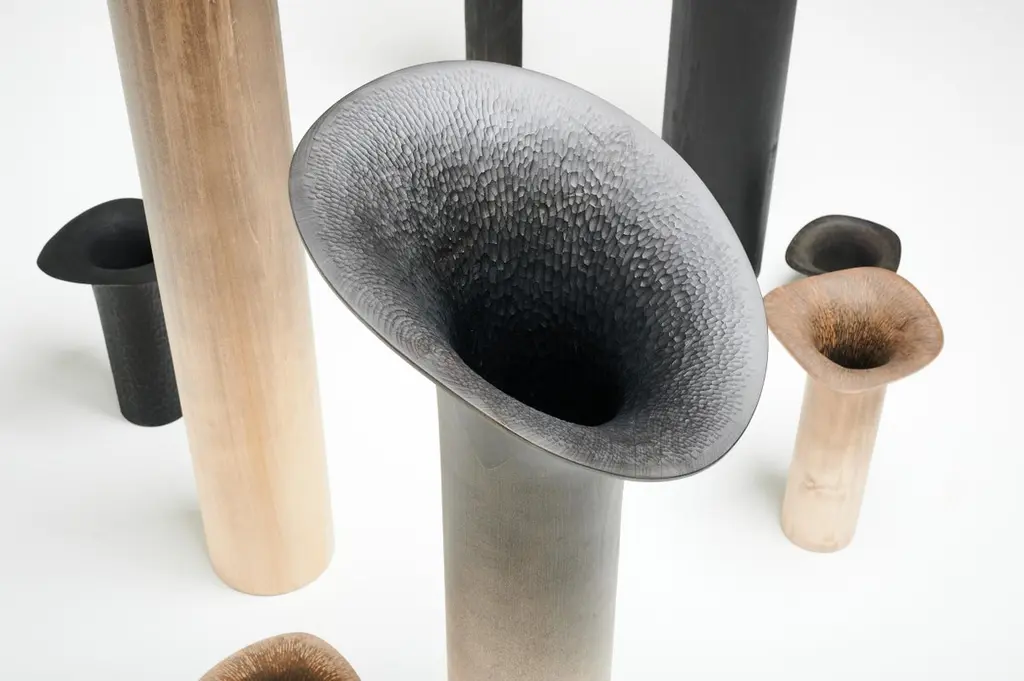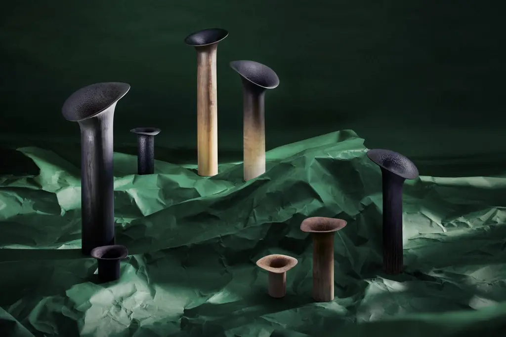 SISIN (finnish for “quiddity”) is a sculptural hand carved vessel series where the forms and textures are inspired by exceptional beauty and necessity of mushrooms.Hollow pedestals give the pieces lightness and creates illusion regarding to the look. One of a kind carving texture is flowing from the sides to inside and finally disappearing to the bottom.All the pieces are made by hand in Fiskars village, FinlandDesign and made by Antrei HartikainenMeasures: Height 80cmDiameter 40cm Material: Linden woodTreatment: Stained and lacquered.