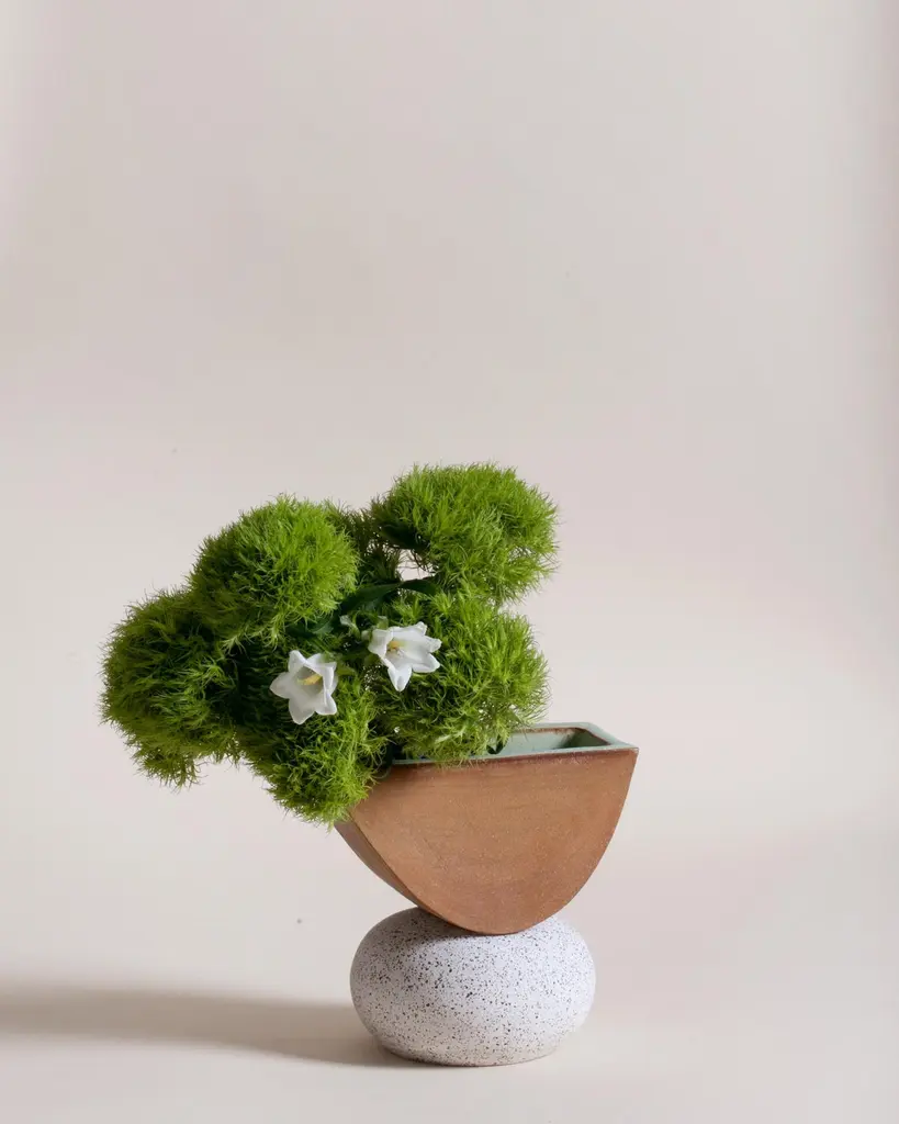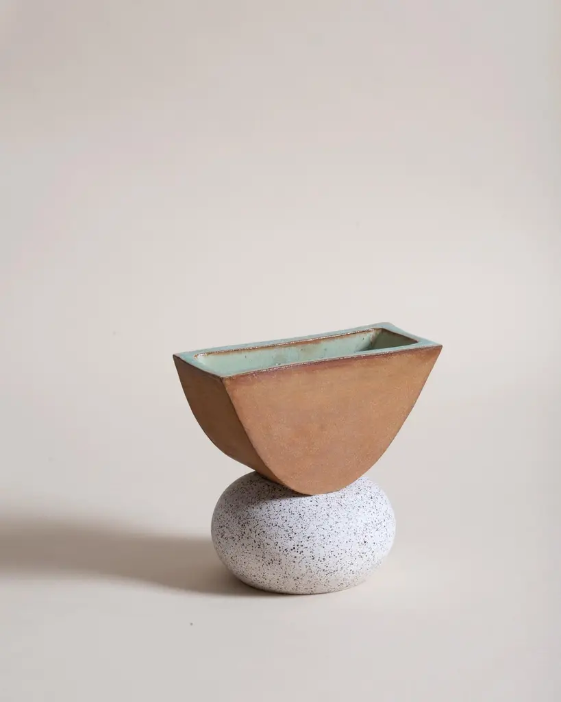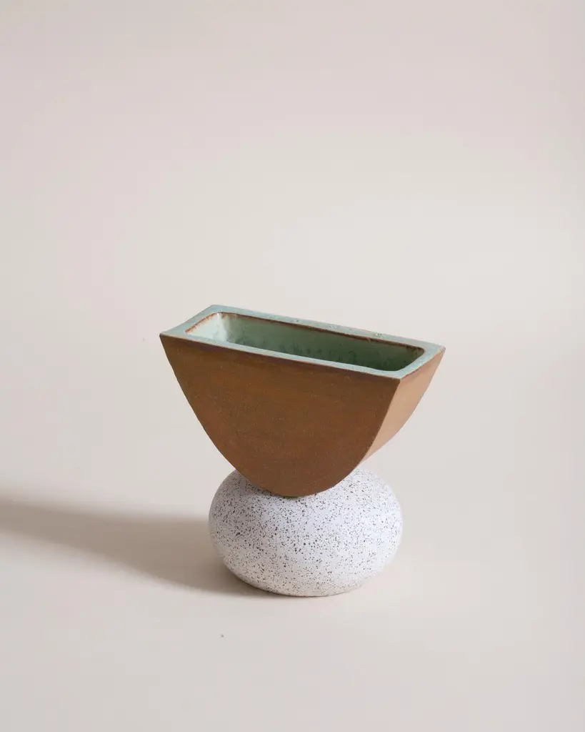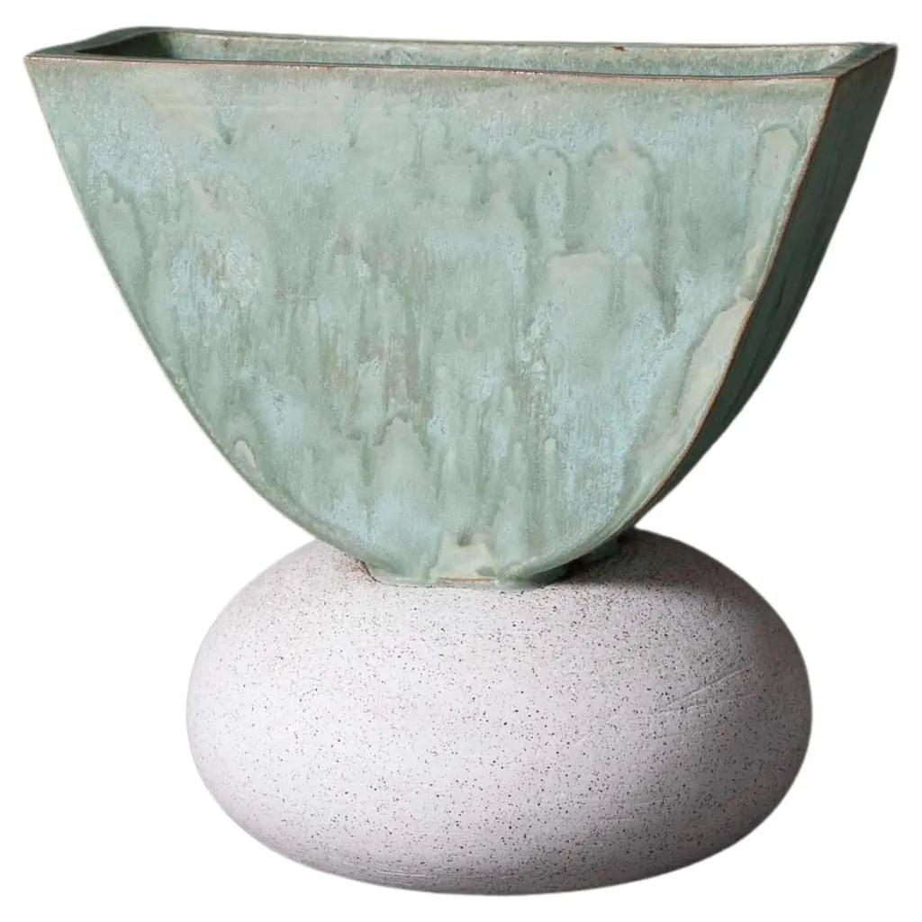 One of a kind ceramic Ash vase in red clay with white speckled base, copper green glaze interior. The vase is comprised of two different clay bodies and features a raw, unglazed ceramic surface to highlight the texture of natural clay. The ceramic pieces are individually thrown on the potters wheel and assembled by hand. This piece was inspired by seashells and smooth stones collected from the beach on trips to New England.Measures: 6.5 tall x 6.5 x 4.25”.