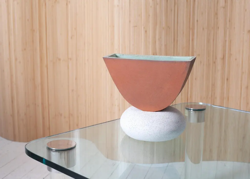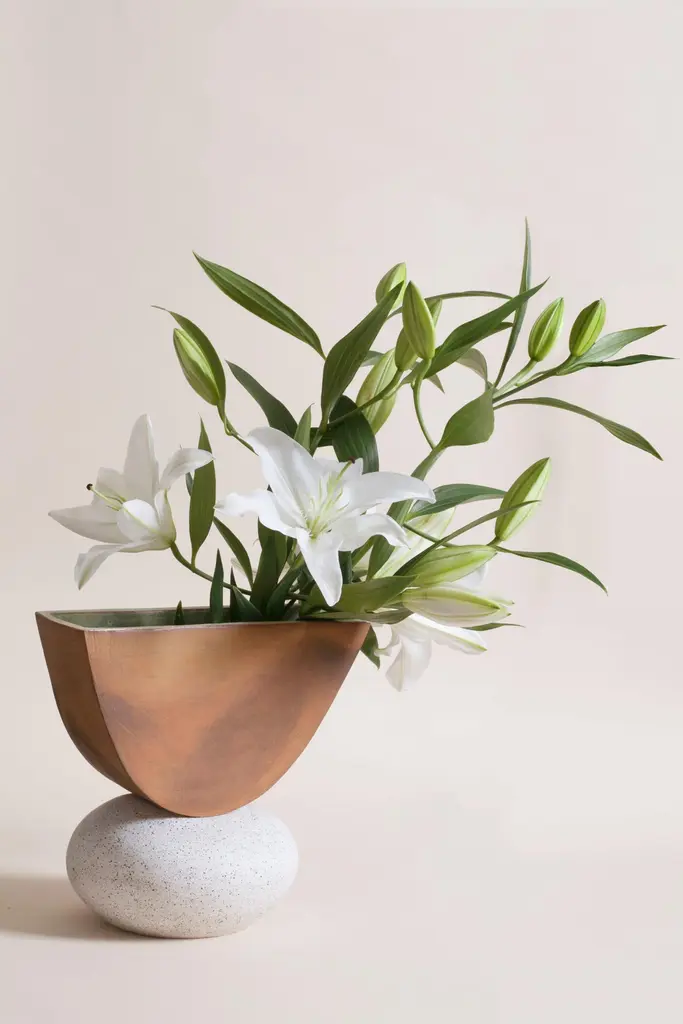 One of a kind ceramic ash vase in red clay with white speckled base, copper green glaze interior. The vase is comprised of two different clay bodies and features a raw, unglazed ceramic surface to highlight the texture of natural clay. The ceramic pieces are individually thrown on the potters wheel and assembled by hand. This piece was inspired by seashells and smooth stones collected from the beach on trips to New England.Measures: 10 x 8 x 11” tall.Ready to ship