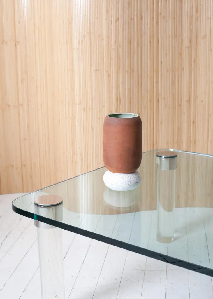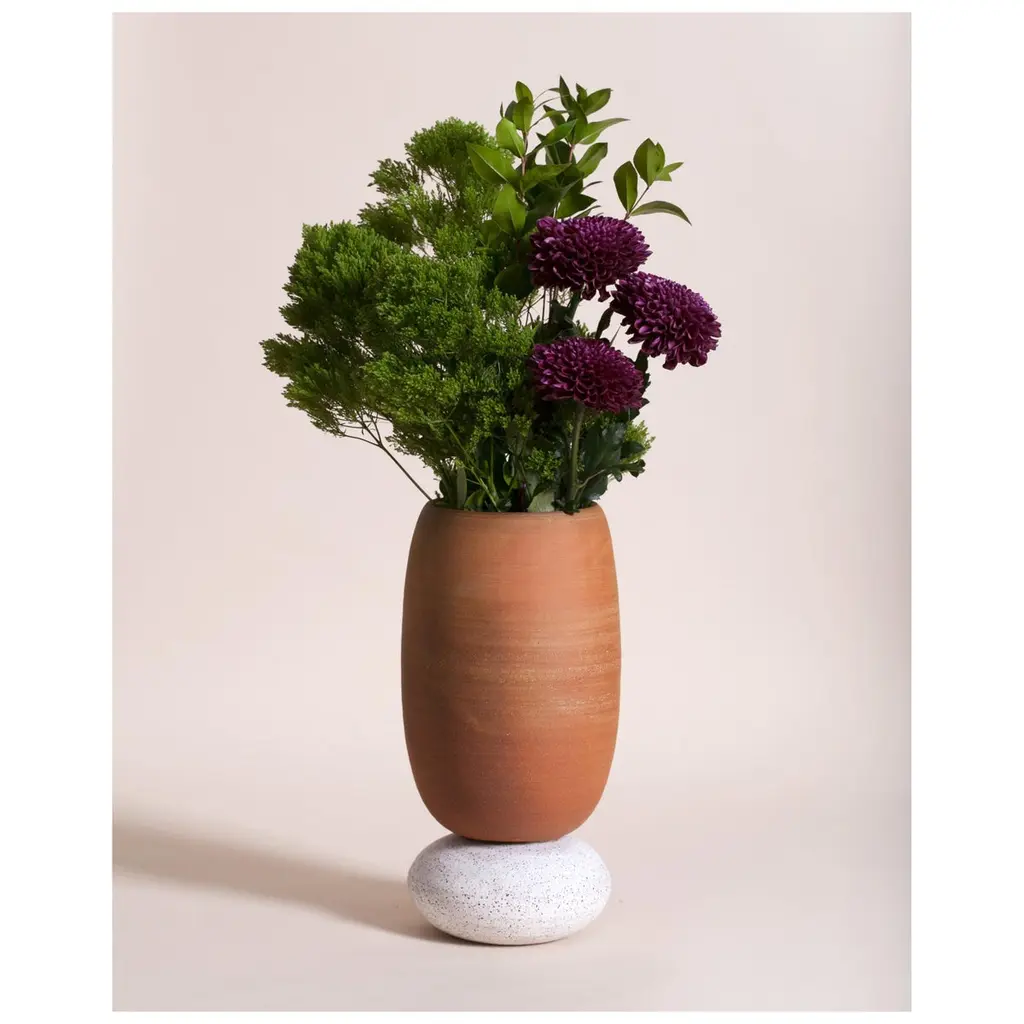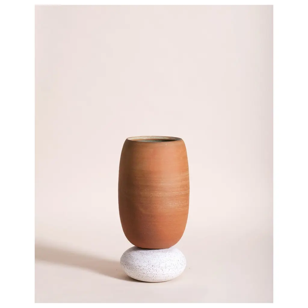 One of a kind ceramic Noble vase in red clay with white speckled base, copper green glaze interior. The vase is comprised of two different clay bodies and features a raw, unglazed ceramic surface to highlight the texture of natural clay. The ceramic pieces are individually thrown on the potters wheel and assembled by hand. This piece was inspired by seashells and smooth stones collected from the beach on trips to New England.Measures: 5 x 5 x 9.5” tall.