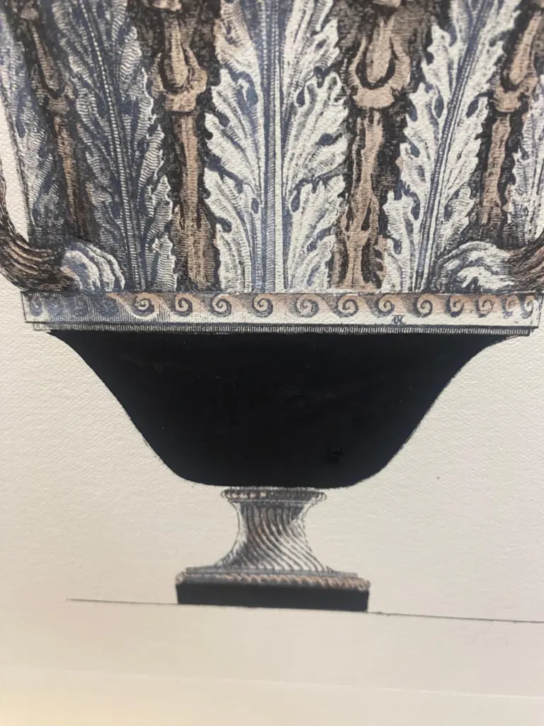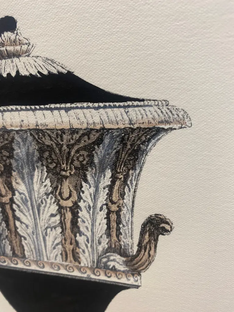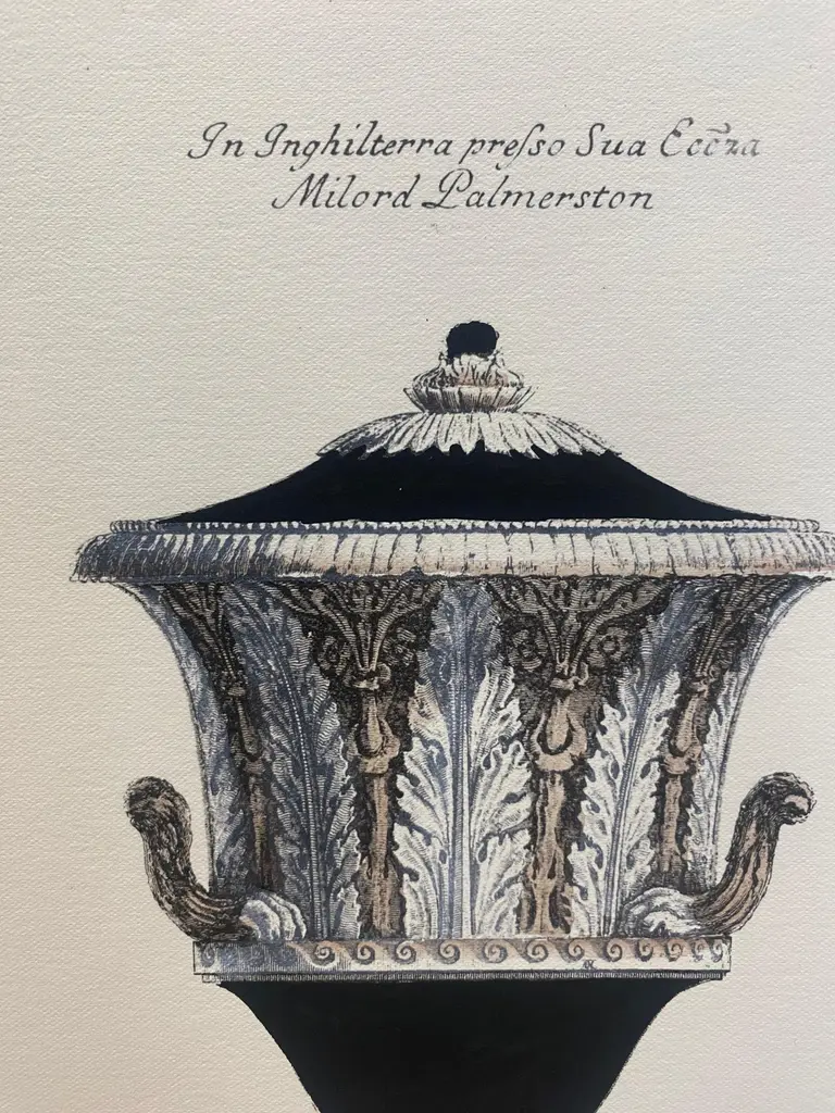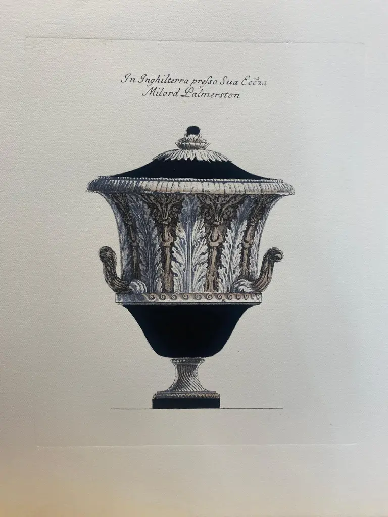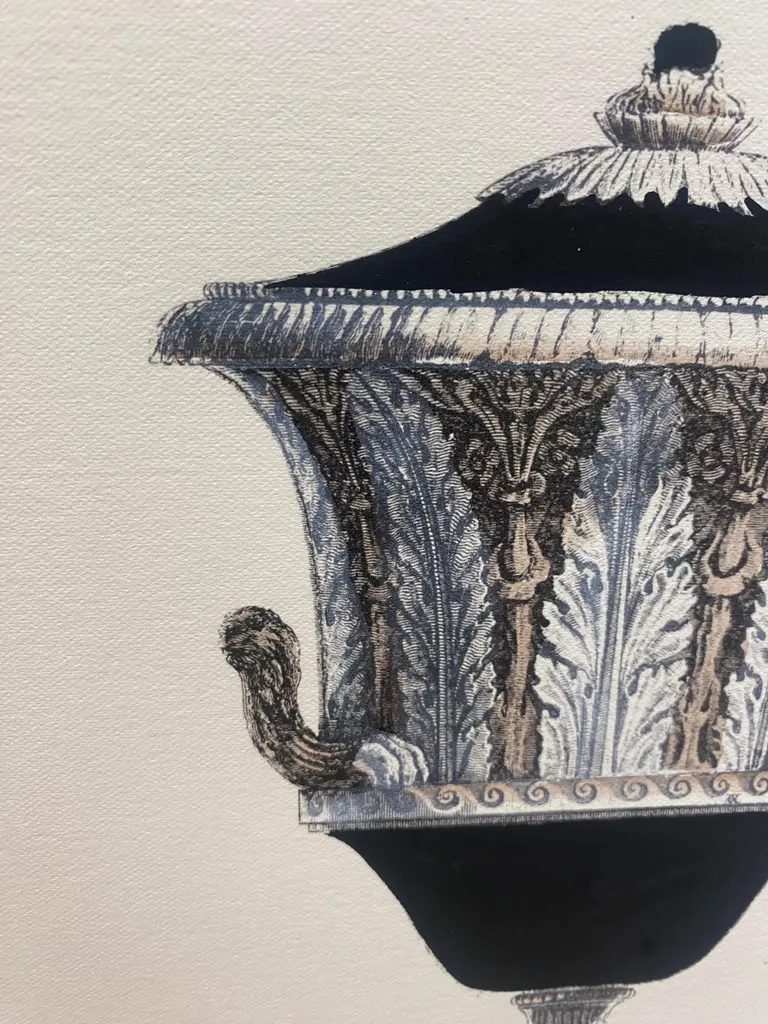 Very original reproductions of decorative vases from important English mansions, printed on a hand press on 100% cotton engraving paper.Completely handpainted with a cream wash, umber highlights, and matte black details.Available in five different vase shape.Paper dimension 33 x 35 cmSlab rebate dimensions 20 x 25 cm.(Cod. 147) ARTECORNICI design produces hand colored art prints, artisan frames, lightings, decorative accessories and furniture . All our products are designed and produced in Florence by Italian master craftsmen.