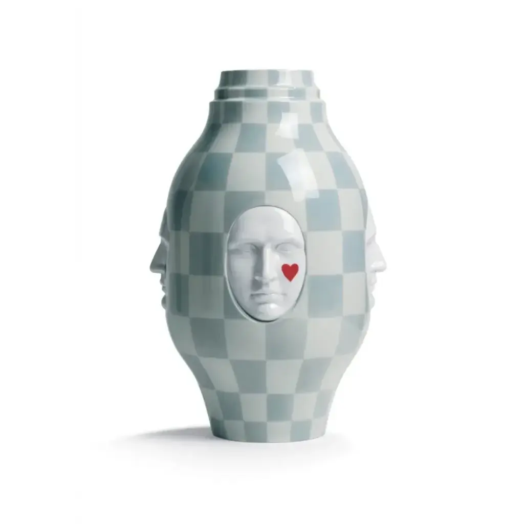 Glossy porcelain vase designed by Jaime Hayon with modern design and grey decoration highlighting the red of the heart. An iconic Spanish brand, Lladro is a world leader in the creation of porcelain art. Started by brothers Juan, Jose and Vicente Lladro in 1953, the ceramic figurines were initially inspired by the works of great European manufacturers like Meissen and Sevres. Over time, a unique style was forged, consisting of elongated lines, a revolutionary single-firing method, and soft pastel tones.