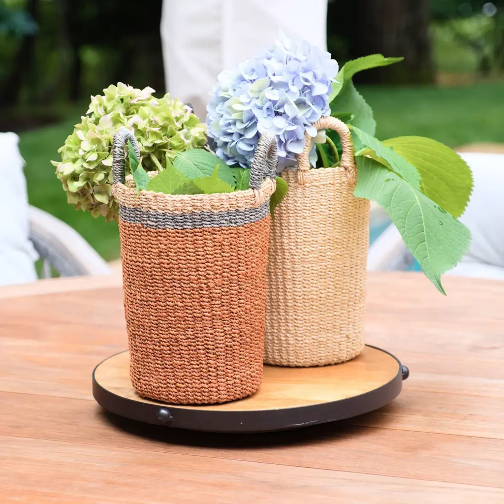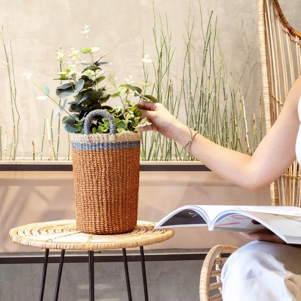 Brighten your home with the vibrant charm of our Coral Wicker Basket Vase. The vase shape is ideal for displaying flowers or as a statement piece. The rich coral hue and refined weaving patterns create a striking visual impact, making it a perfect accent for any room. Each basket is a unique reflection of traditional craftsmanship and sustainable practices, combining vibrant style with artisan quality.