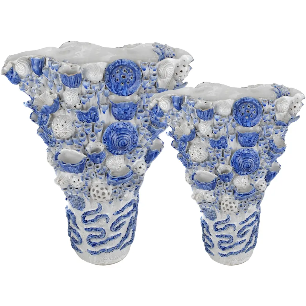 The Coral Reef Large Vase is made of ceramic glazed in a mix of white and reactive blue. The sea creatures affixed to the sides of the white and blue vase are painstakingly fashioned and applied by hand by a group of women artisans who live at the border of Burma and Thailand.