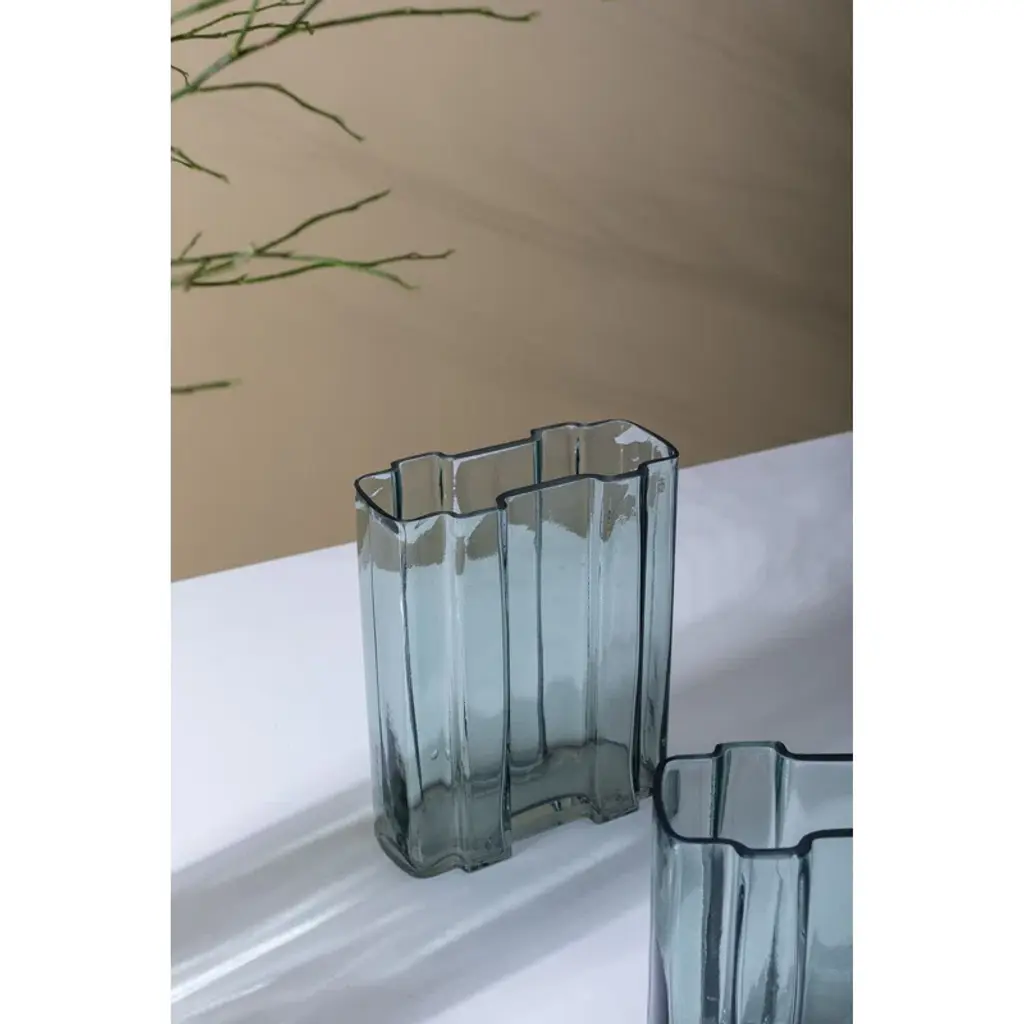 The asymmetrical Cordeline vase with its sleek lines is a stunning art piece for your shelves, as well as a chic vase for fresh-cut or dried bouquets. This handmade glass piece has a subtle sprayed bluish-green hue that enhances any decor.