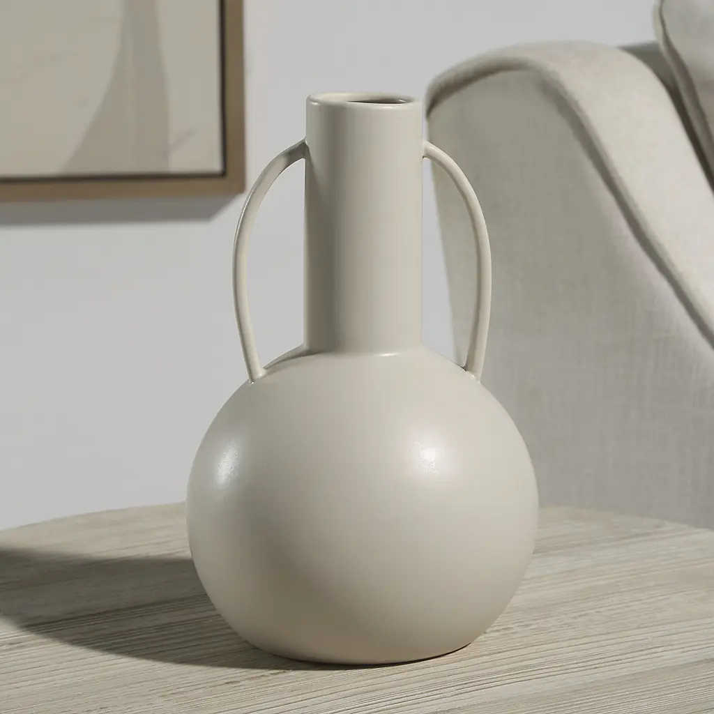 Canadian designer, Arren Williams does it again with this stunning Corinth decorative vase. Nothing short of fabulous, he flexes his interior stylist skills by confidently combining a smooth matte beige glaze with sleek graceful lines for a result thats totally on-trend yet timeless all at once. Perfectly suited for a modern home or office, this vase looks as incredible in a neutral setting as it does in one with bold colors. Set it out on display with a few branches as a stunning minimalist focal point or mix it in with a collection of pottery and stoneware for a multi-dimensional impact with style for miles. Either way, the effect will be memorable.