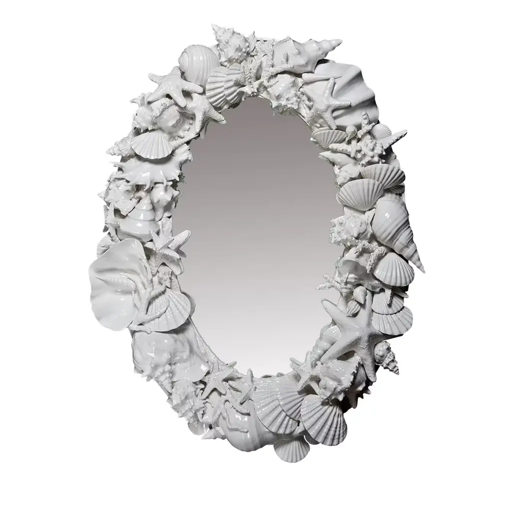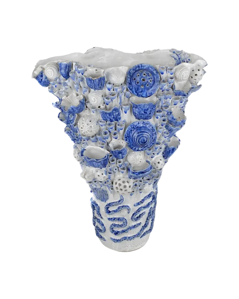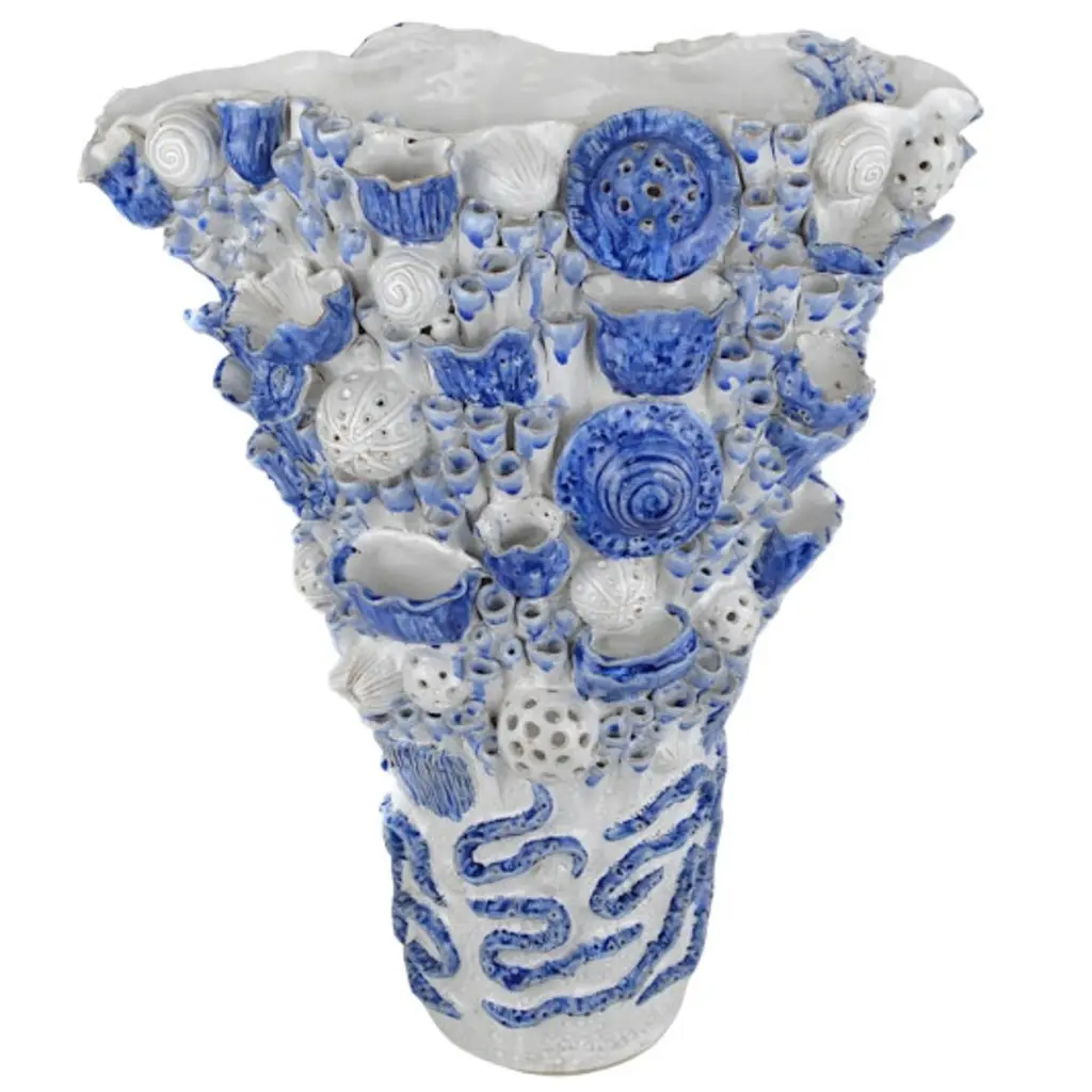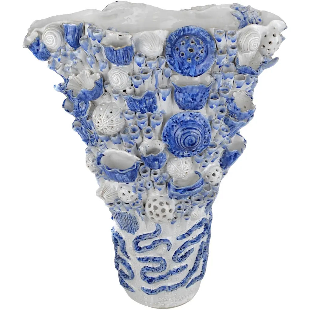 A triumph of sea shells and starfish dotted with vibrant coral branches extensively covers this vase fashioned of fine white ceramic. Actualization of an original design by Antonio Fullin, it serves as a marvelous solution for displaying flower on sideboards, consoles, or tables in seaside homes. Its rich aesthetic impact suggests it a purely decorative piece.