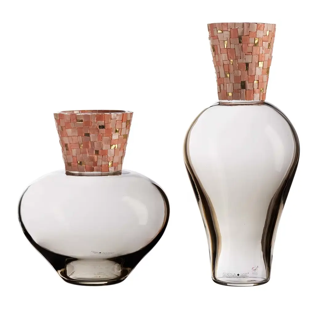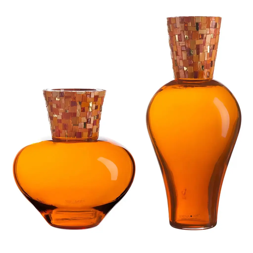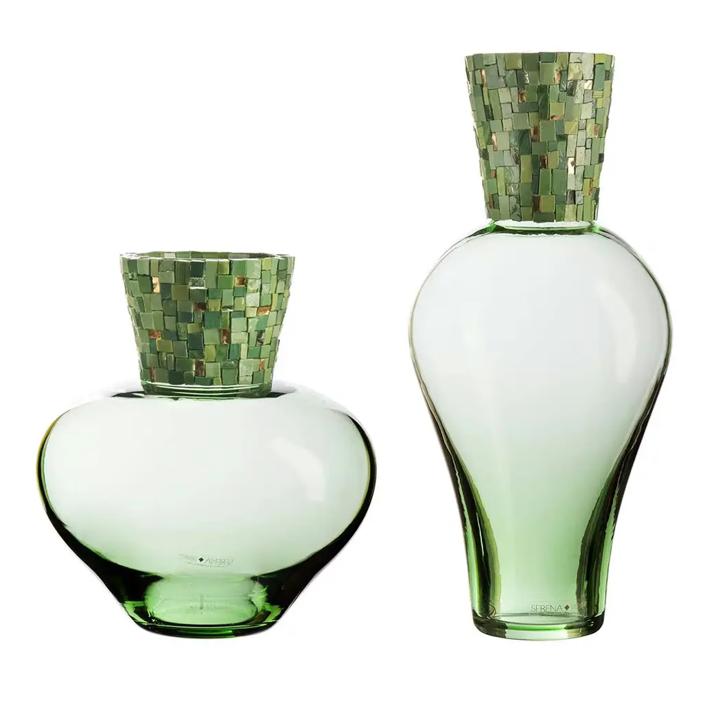 This sleek, modern set of vases is surprisingly rich in texture and visual complexity due to its geometric mosaic stem that stands in contrast to its smooth, lustrous, handblown glass body. A mix of gold-leaf, opaque and transparent tesserae are used to create a dynamic effect. Made by one Italy's oldest glassworks, operated by the same family since the 1500s.
