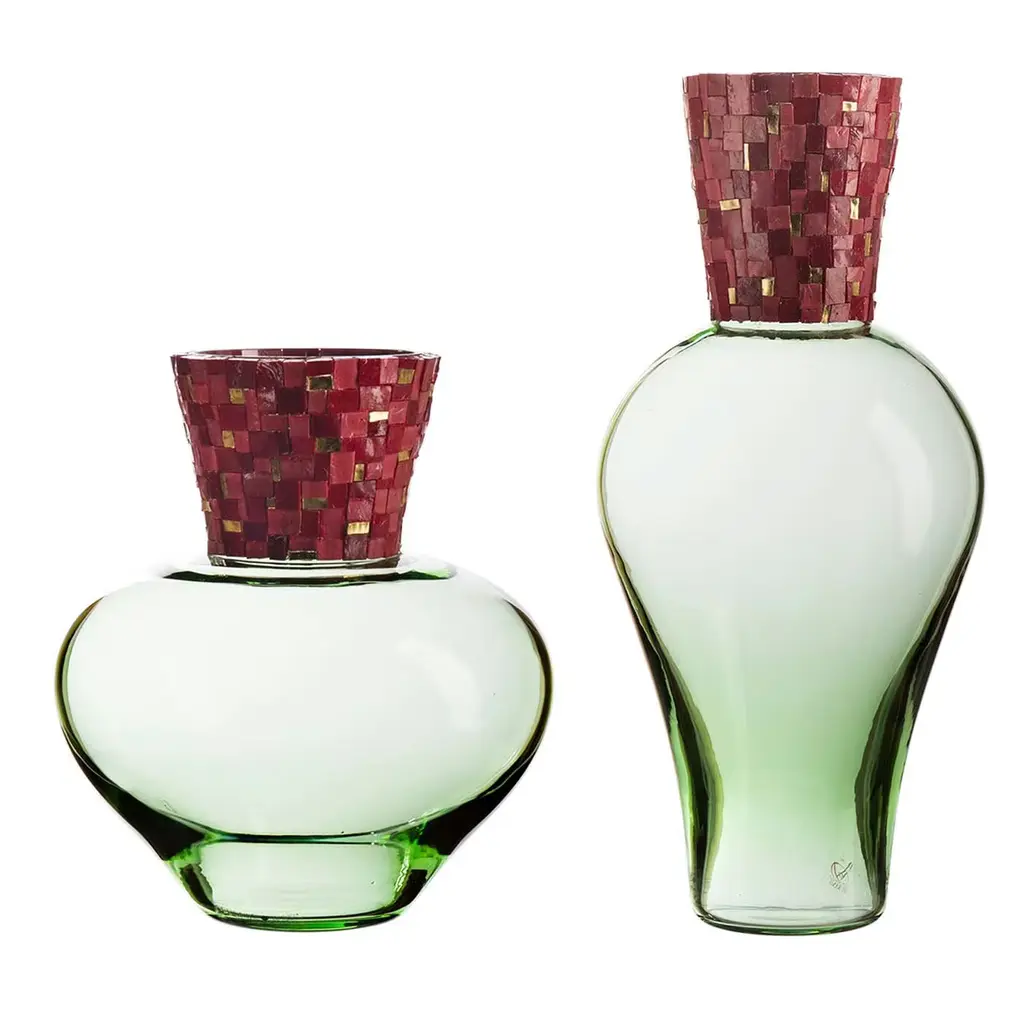 This pair of gradient green vases is crowned by a majestic stem covered in geometric-cut, gold-foil, transparent and opaque tesserae that are color-coordinated with the handblown glass structure. The Serena family have been continuously making glass in the Veneto region since the 1500's, making them one of the founders of the Murano glass trade.
