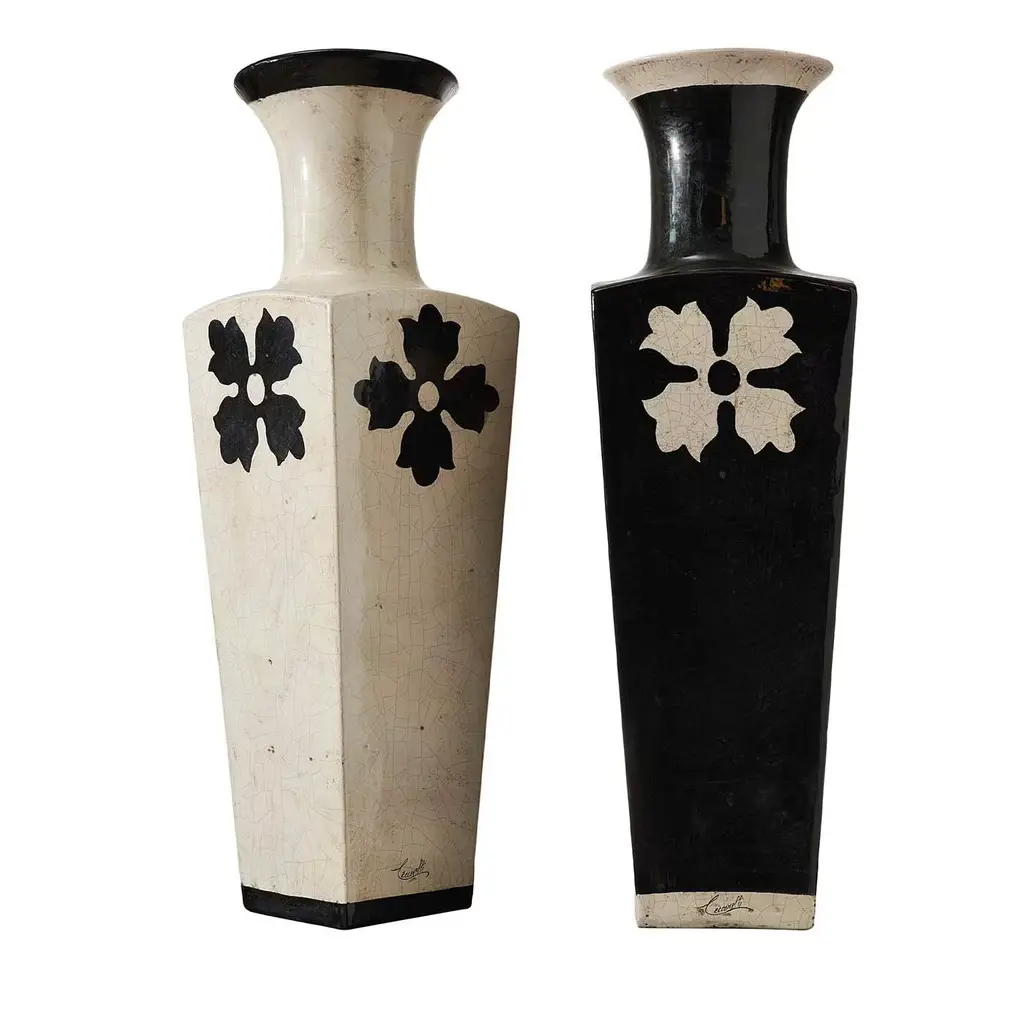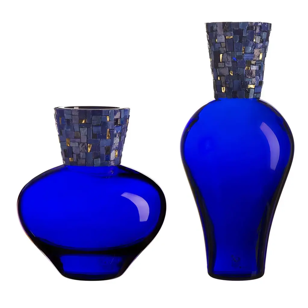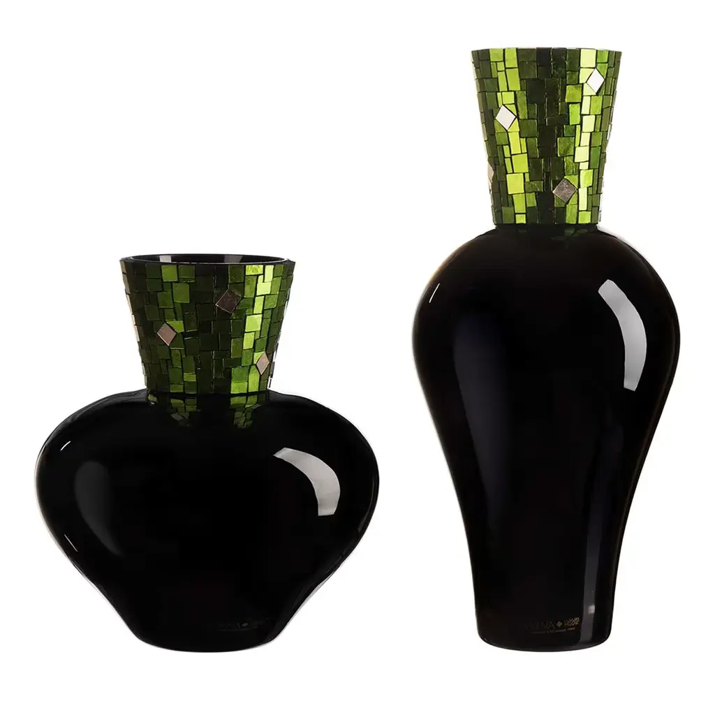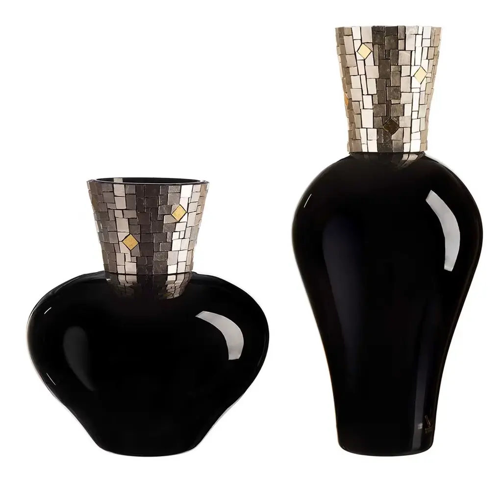 This set of extremely elegant vases features a black body with black and gold-leaf mosaics majestically covering its stem. Its sleek, minimalist, modern design is surprisingly rich in texture and visual complexity. The Serena family's glass business dates back to 1517, making them one of the founder's of the world-famous Murano glass trade.