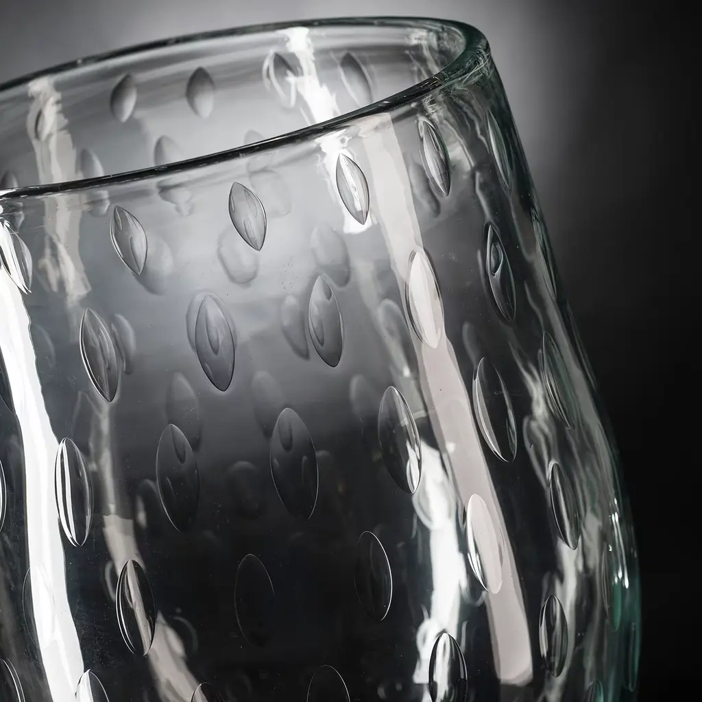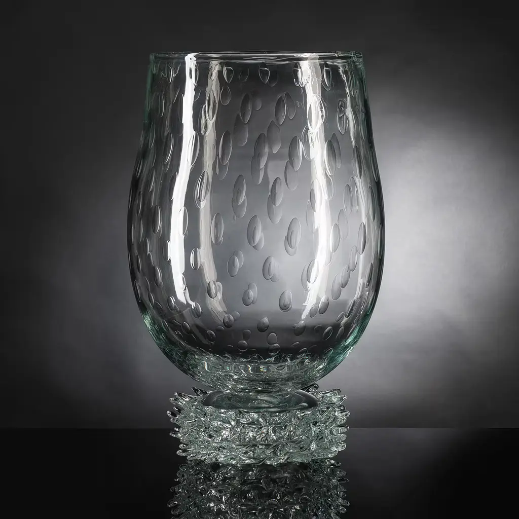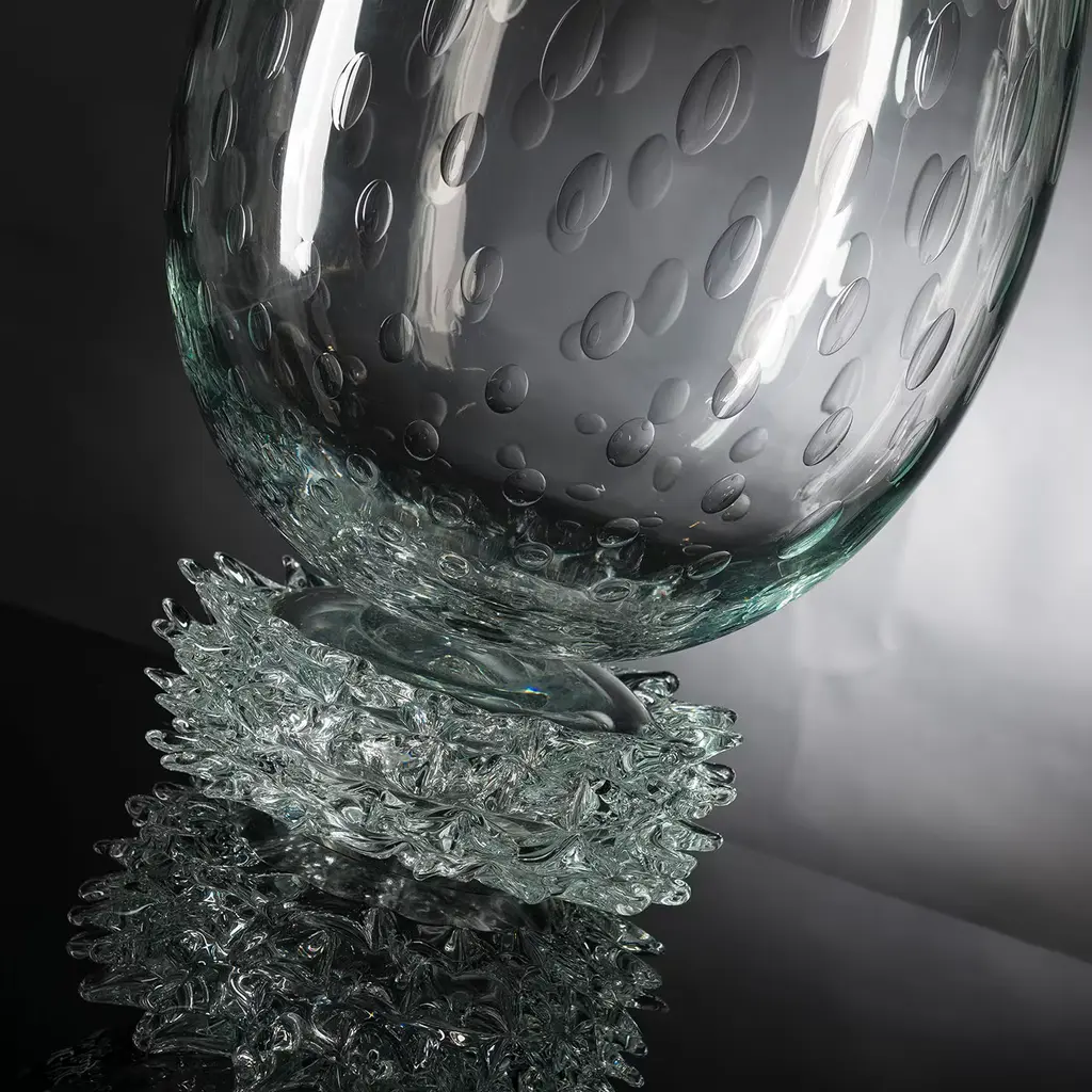 Defined by a tall and capacious vase (H 55 cm), this exquisite chalice will make a statement of its own as a refined centerpiece, or paired with other Correr pieces as part of a singular dining set. Enriched with a textural decoration on the base, the piece is entirely handcrafted of Murano glass, a textured glass also known as Florentine.