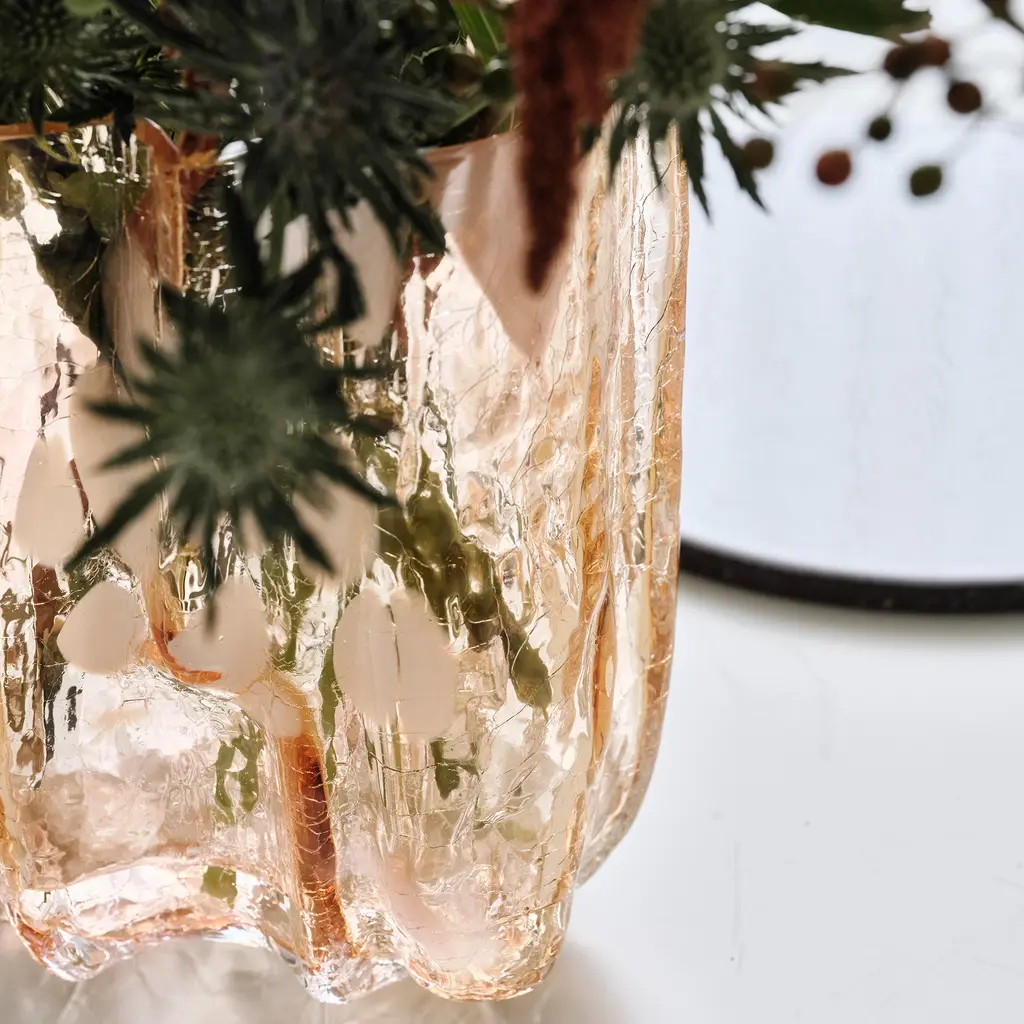 A functional art object with a crackled surface, this collection from Kosta Boda features mouth blown glass that has a distinctive, organic look befitting any style of décor.