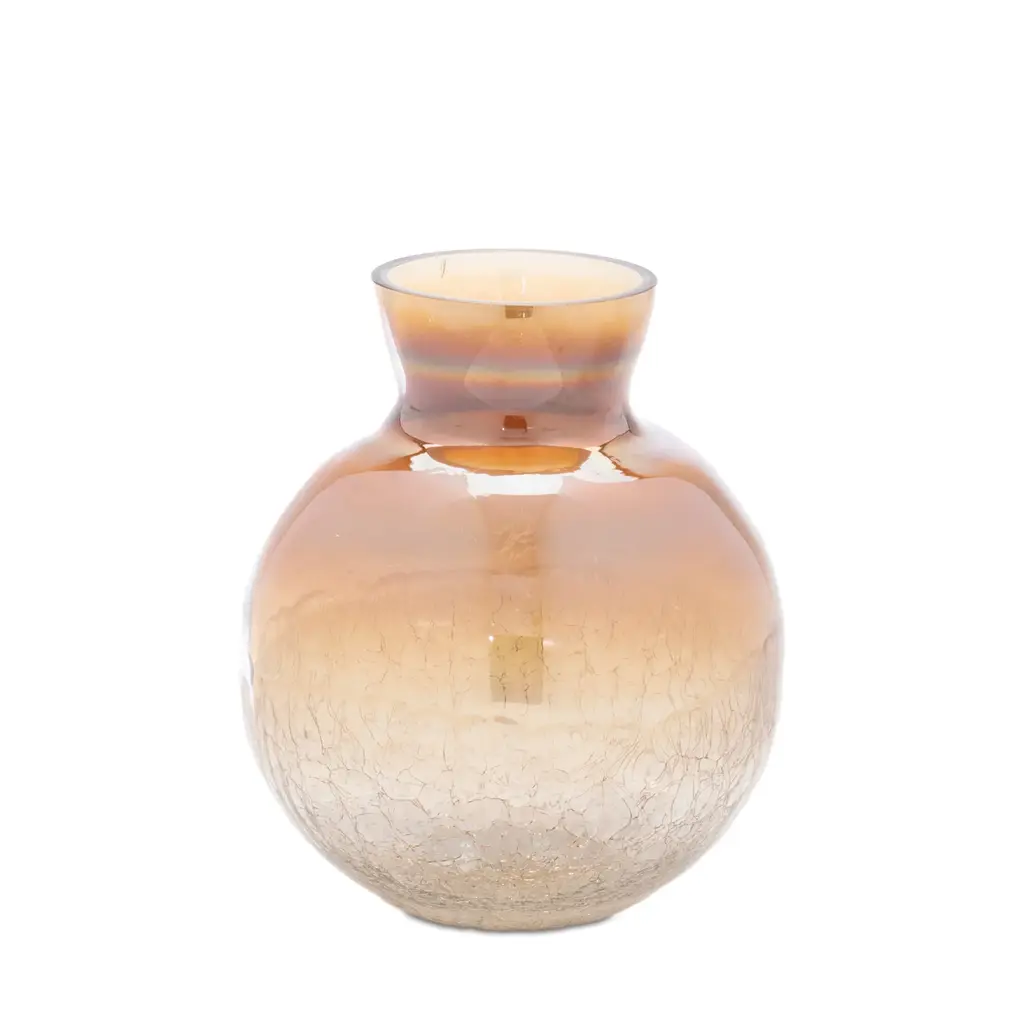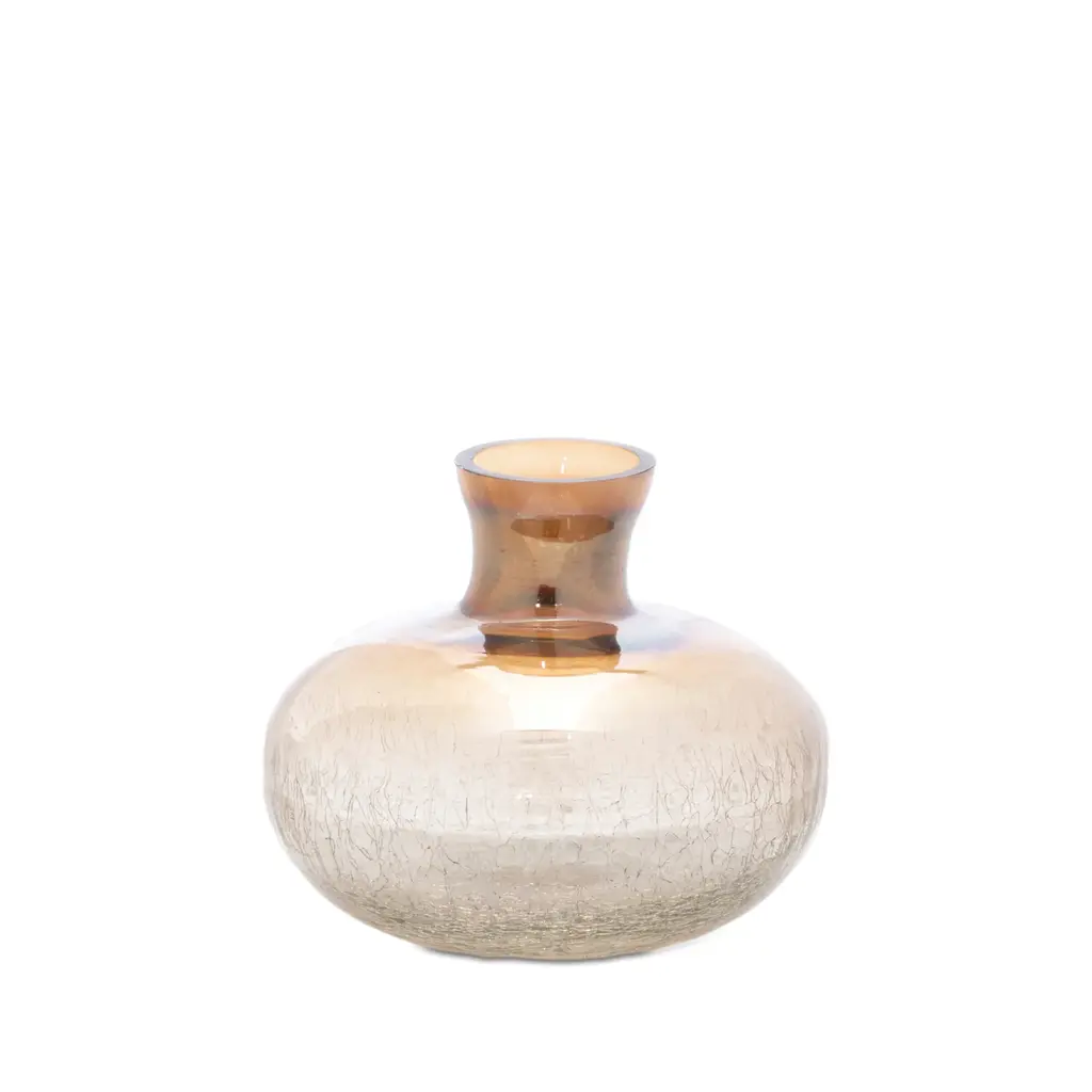 Add warmth and texture to your home with this set of three crackled glass bud vases. Featuring a stunning ombre design in warm brown tones, each vase boasts a smooth outer finish with crackle glass accents that create a unique, vintage-inspired look. The modern bottle neck opening offers a sleek and sophisticated design, perfect for showcasing dried florals, pampas stems, or small branches. Sold in three assorted sizes, this versatile set makes an elegant statement on your bookshelf, mantle, or coffee table, adding a touch of nature to your home décor.