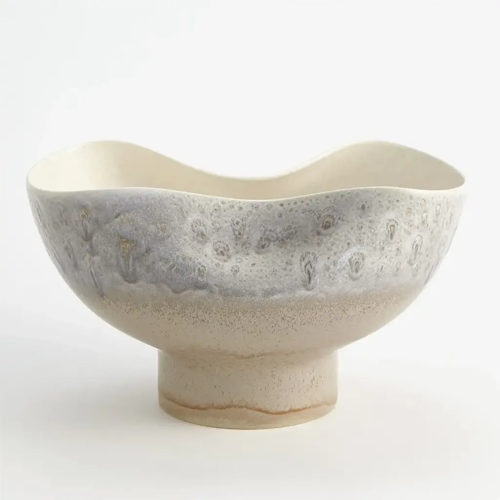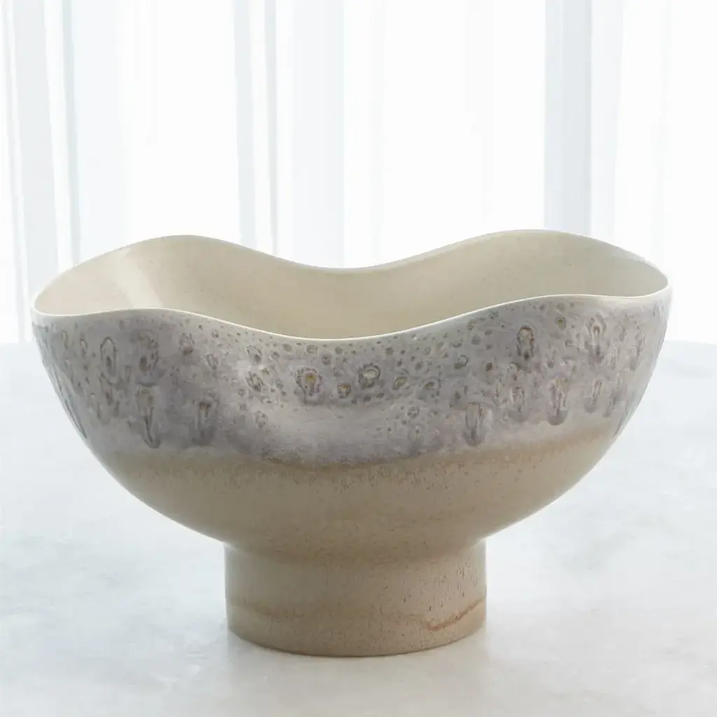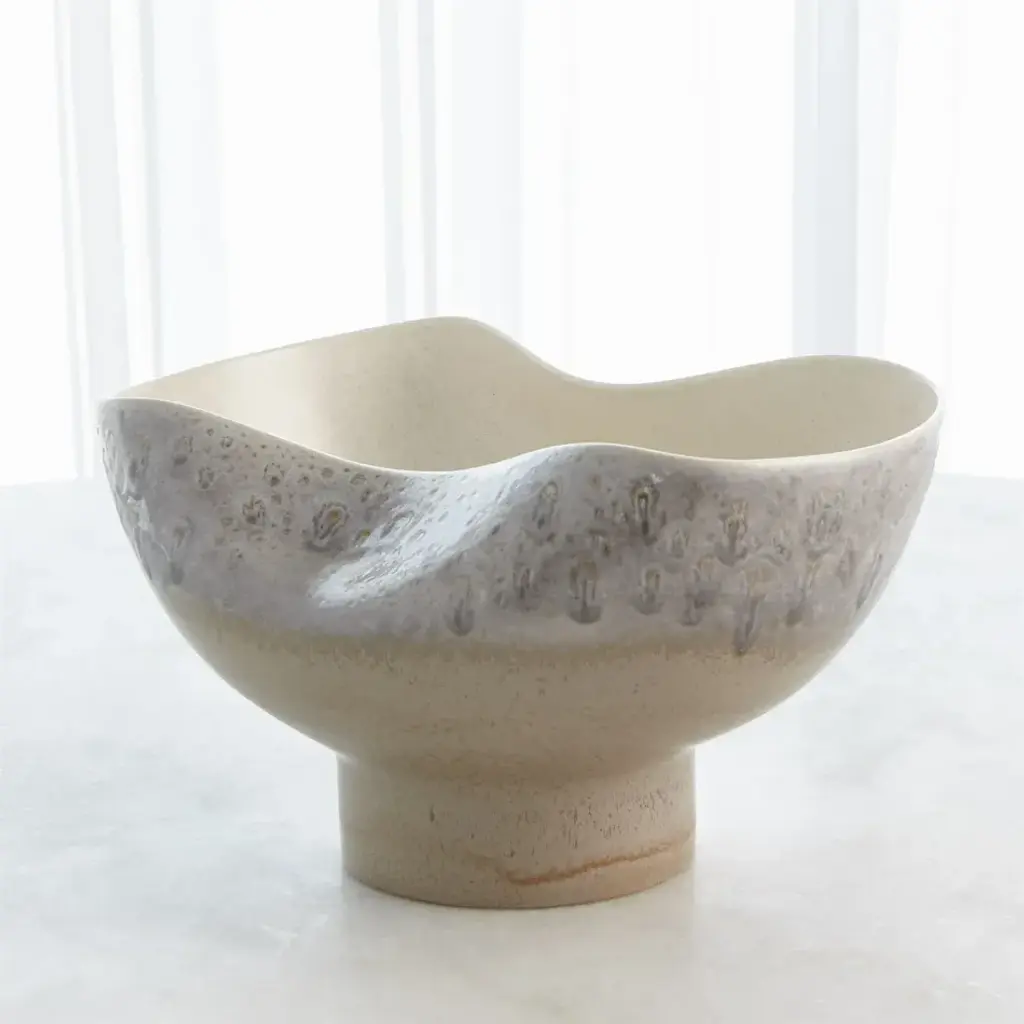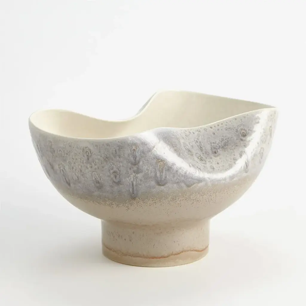Made of Portuguese slip cast ceramic, the Cream Rises Dented Vase and bowl has a concaved design with ivory and grey reactive glaze finishes. From a fashion forward perspective, Global Views offers accessories, furniture, statement lighting, and an assortment of rugs and mirrors to add beauty and joy to your home.