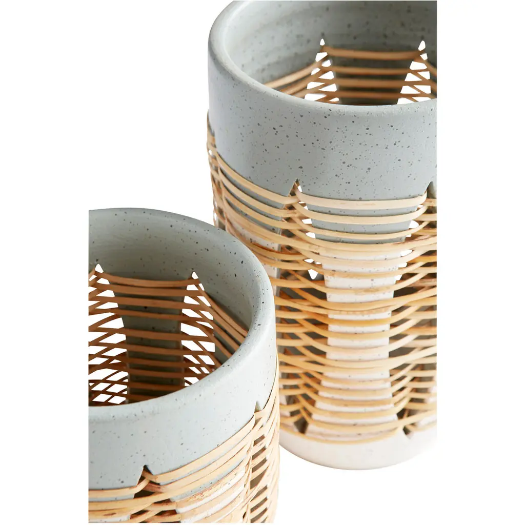 The Crescent vase is a gorgeous synthesis of materials. Its two-tone monochromatic finish is juxtaposed with an intricate weaving of wicker in between multiple hollowed crescents that encircle the body. Simple and compact for indoor spaces.