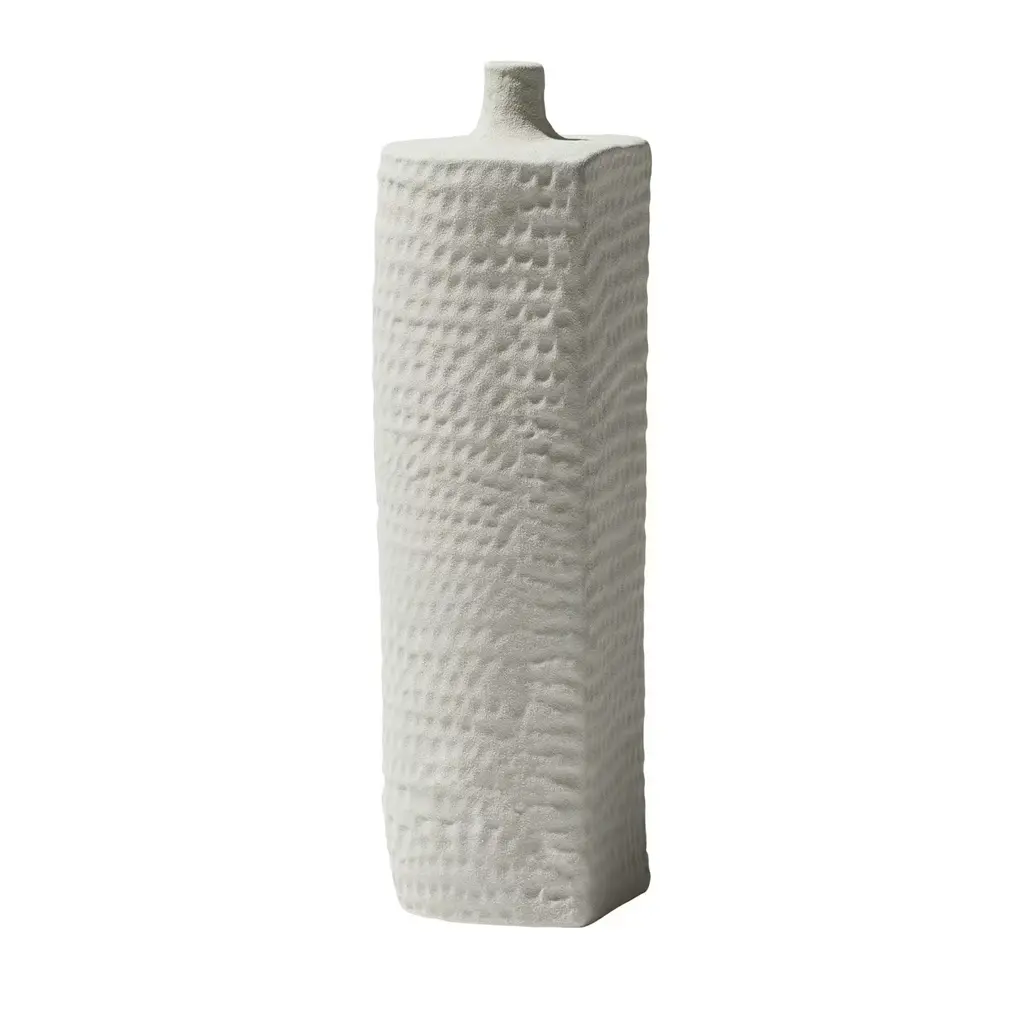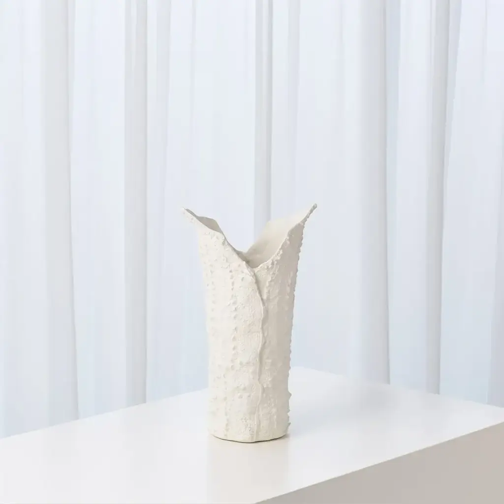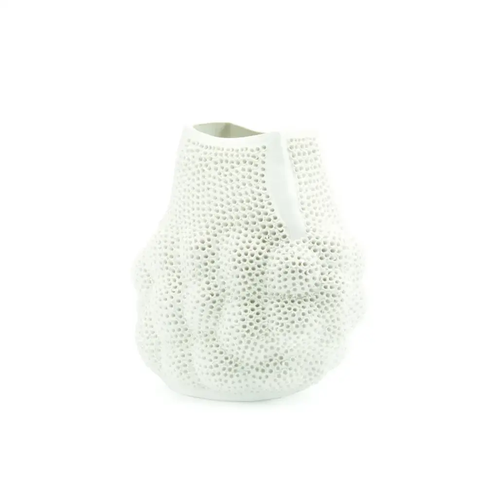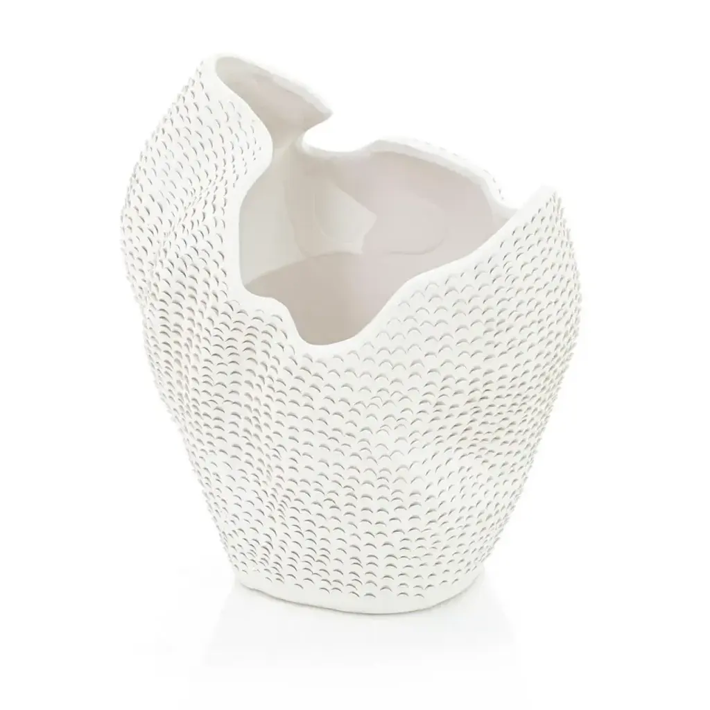 The unglazed white bisque porcelain material pairs perfectly with the crocodile skin texture on these vases. Handcrafted by artisans in Portugal. Available in three sizes. From a fashion forward perspective, Global Views offers accessories, furniture, statement lighting, and an assortment of rugs and mirrors to add beauty and joy to your home.