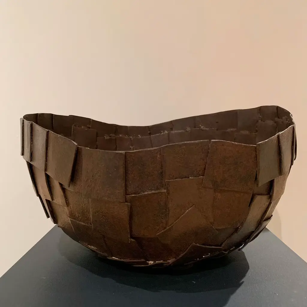 This striking vase is made with small sheets of curved metal and assembled with a dense texture; the finishing is obtained with rust and various wax passages, that obtains a patina that resembles the leather, from which the name.