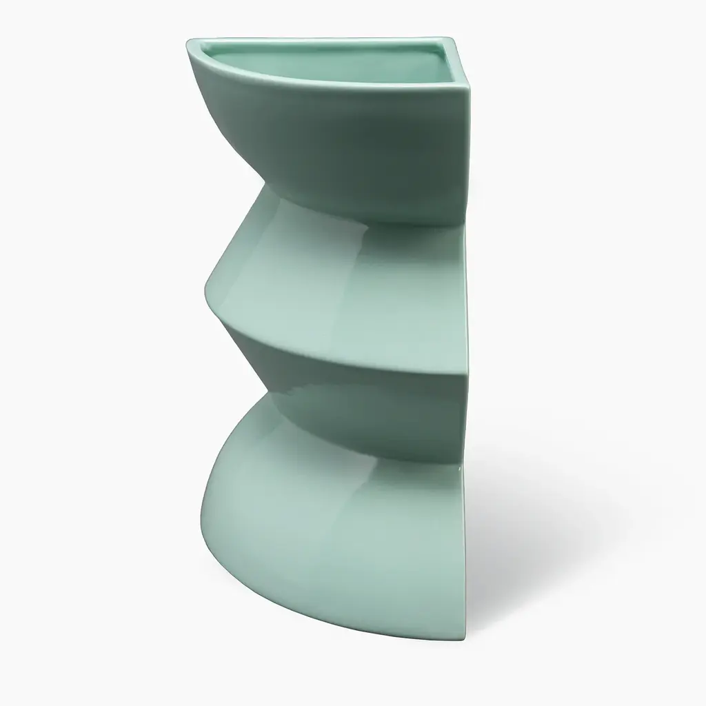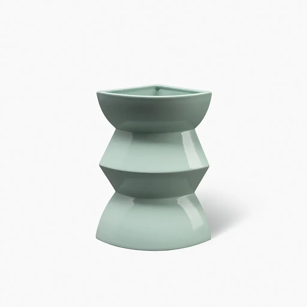 Geometric dynamism and sculptural impact are impeccably synthesized in this ceramic vase from the Curve & Isola Collection. Its angular design suggests its original positioning, while the combination of concavities and convexities lends it its bold sculptural charm. Here offered in a delicate turquoise shade, the piece is available in multiple variants to be explored in the Artemest catalog.