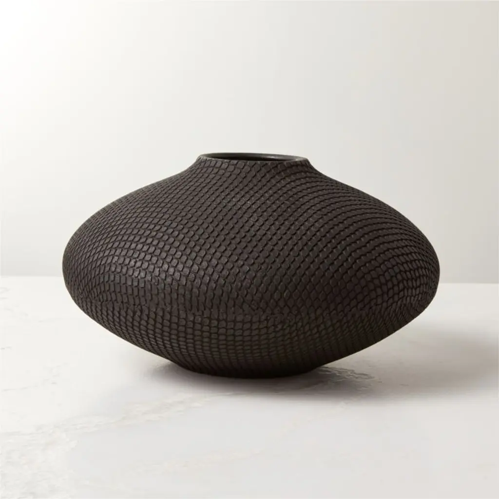 Using the same techniques developed during pre-Incan times, this textured terracotta vase is crafted entirely by hand by artisans in Chulucanas, Peru. Terracotta is shaped into a low, curvy vessel on a potter's wheel, then a netting is applied to create the distinct serpentine pattern before it's kiln-fired. Each vase is fired several times to achieve a rich blackened finish, the result of a special kiln that imparts the natural resin of mango leaves onto each piece. Finished with an interior waterproof varnish, vase is perfect for dried and fresh stems alike. CB2 exclusive.